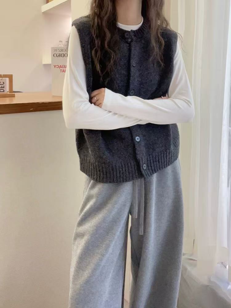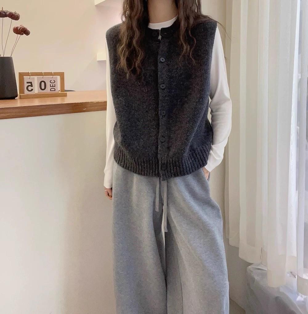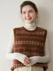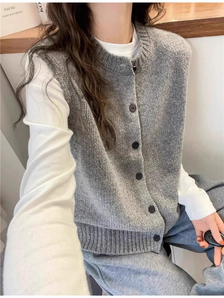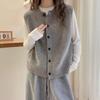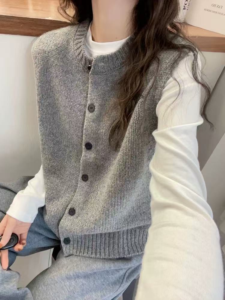 Chaleco tejido de lana 100% pura Cárdigan sin mangas Suéter de cuello redondo para mujer Chaleco de hombro Clásico Color sólido Sencillo Tank top corto