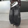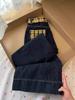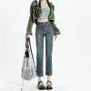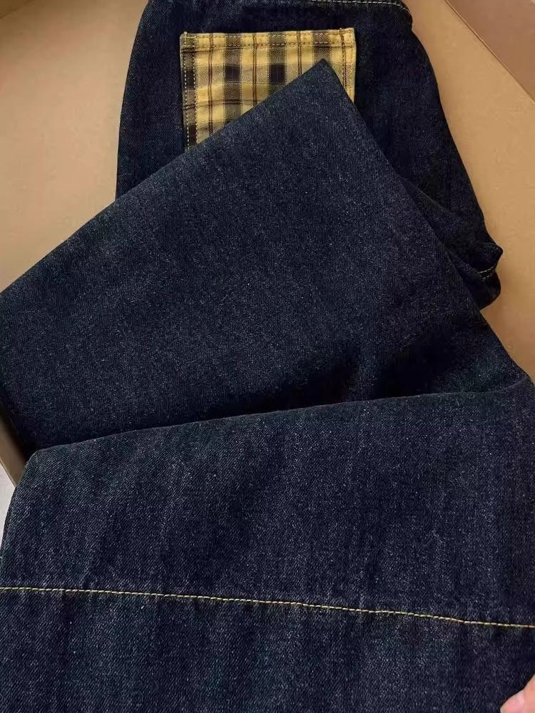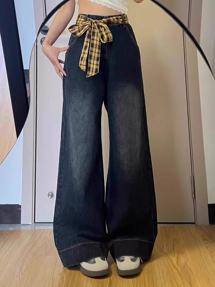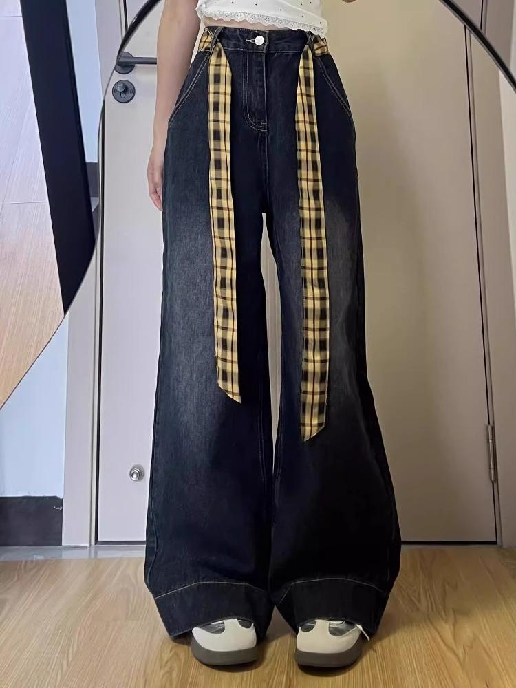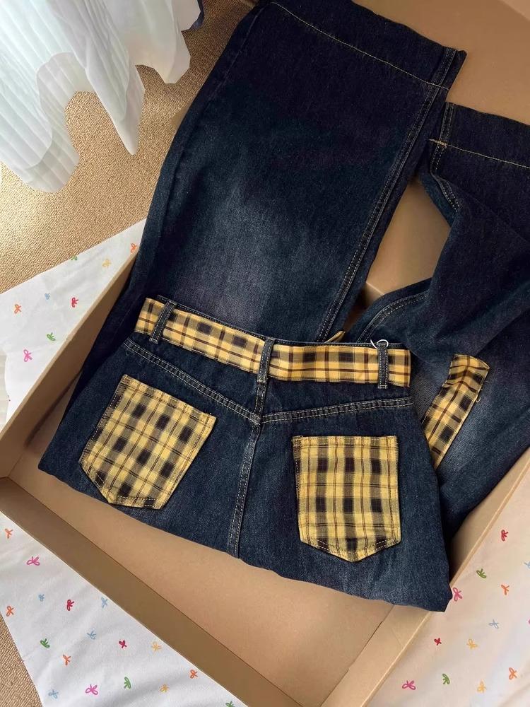 Jeans Patchwork a Cuadros Negros y Amarillos Retro Americanos para Mujer 2025 Primavera y Verano Nuevo Texturizado Moda Versátil Pantalón Largo