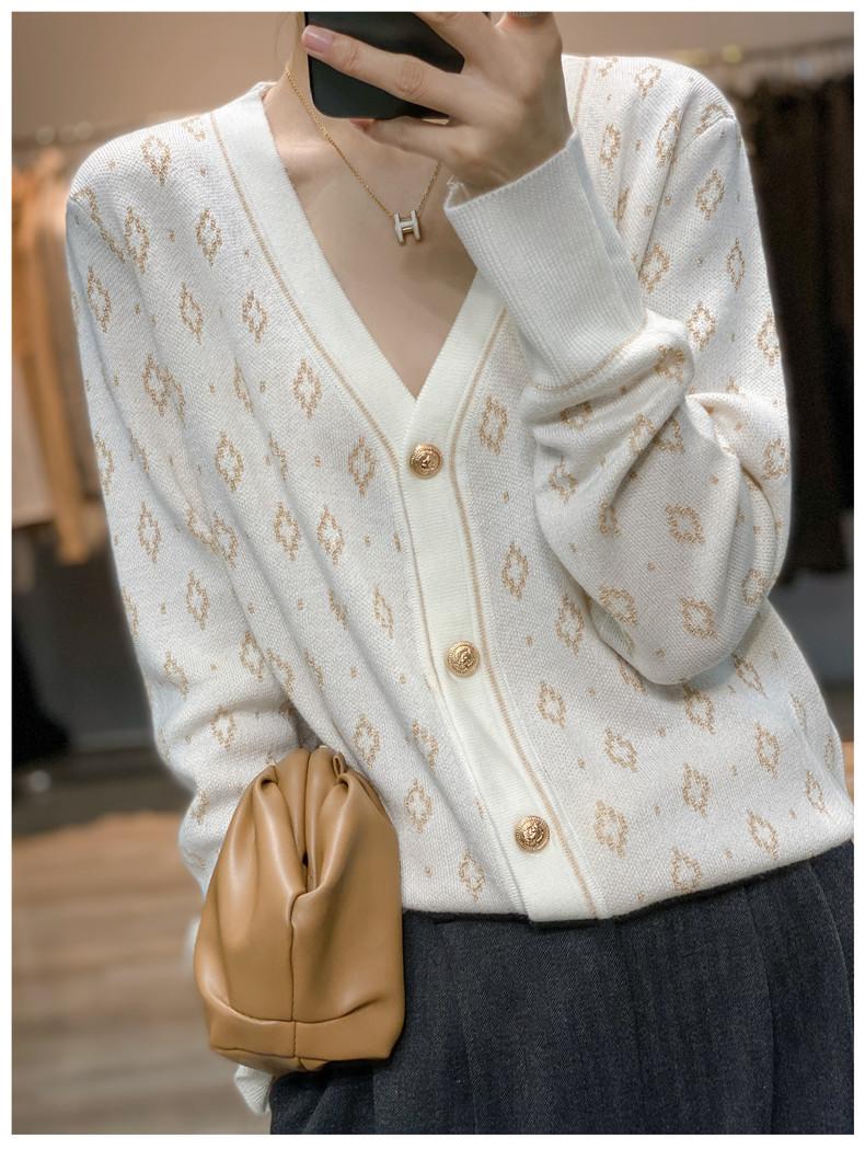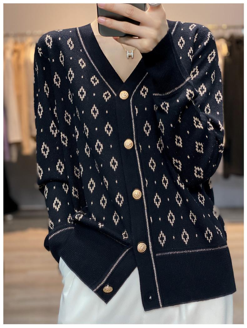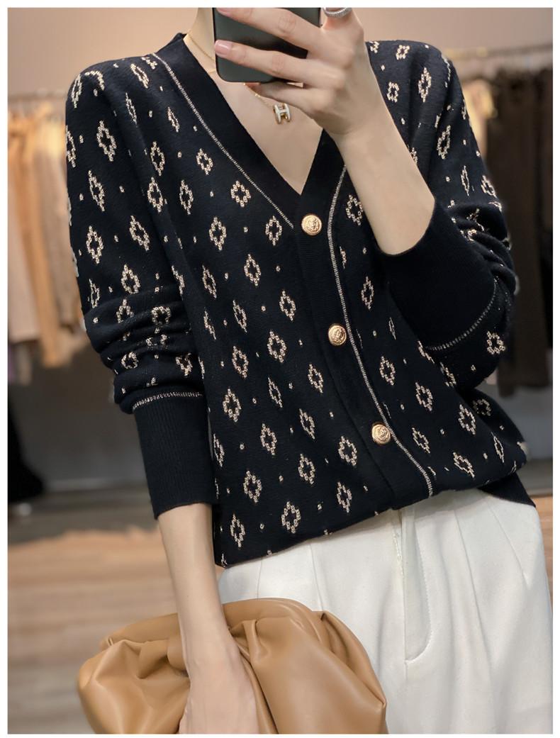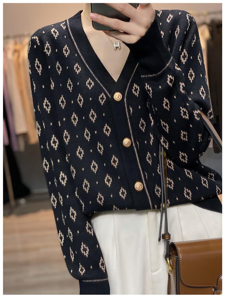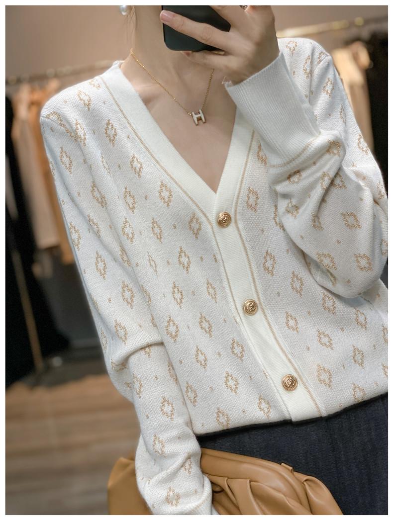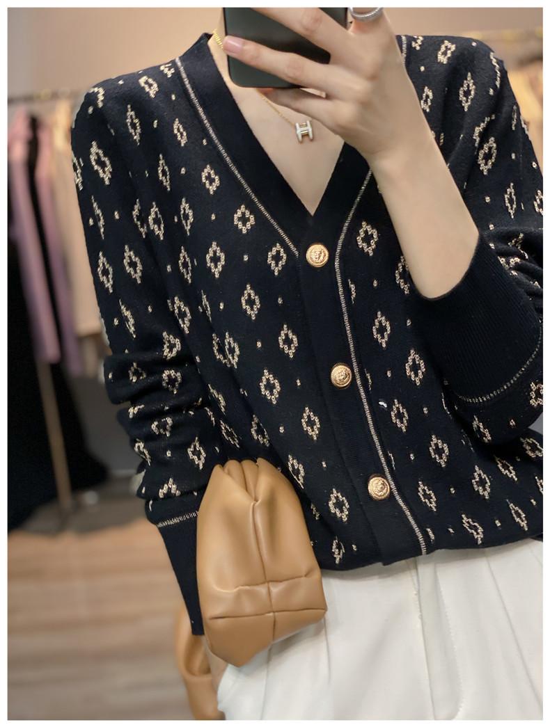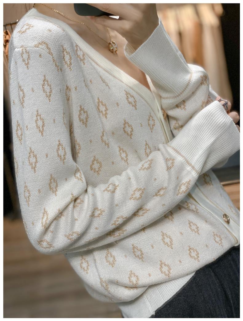 Ropa exterior versátil para mujer, lana transfronteriza, hilo dorado, nuevo cárdigan de punto, top de otoño, hilado diamante, manga larga, línea cuello en V