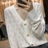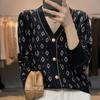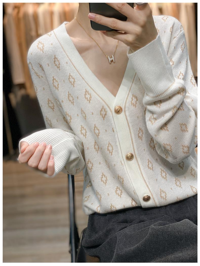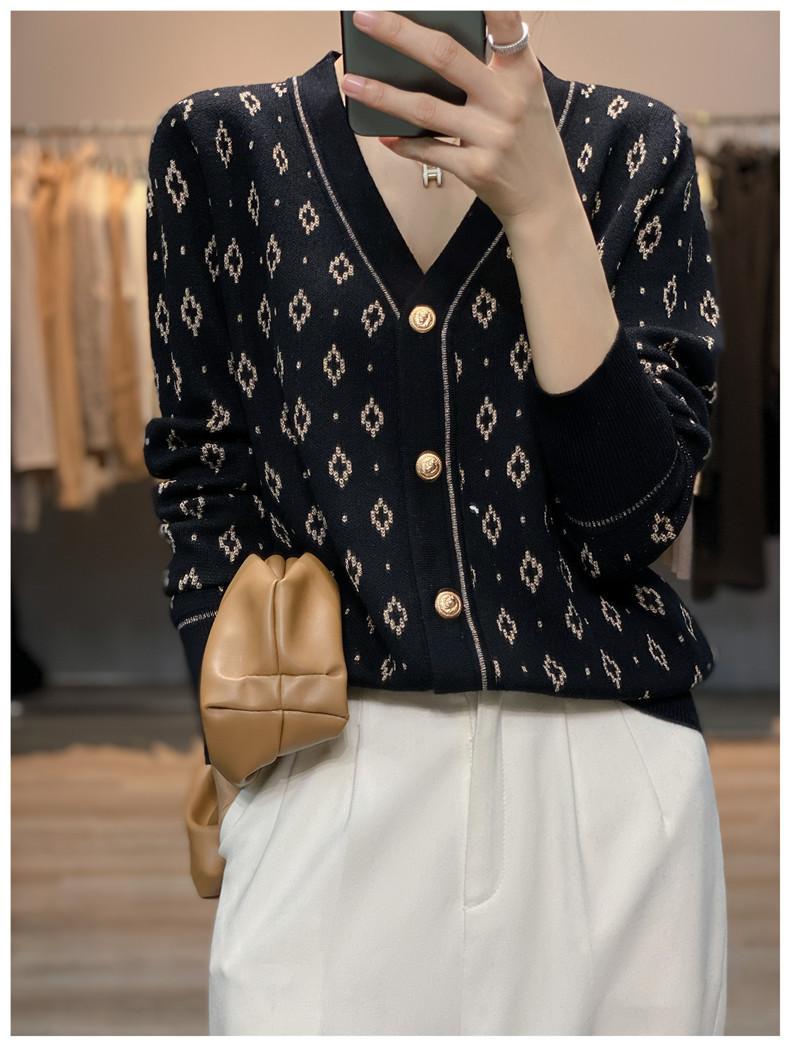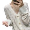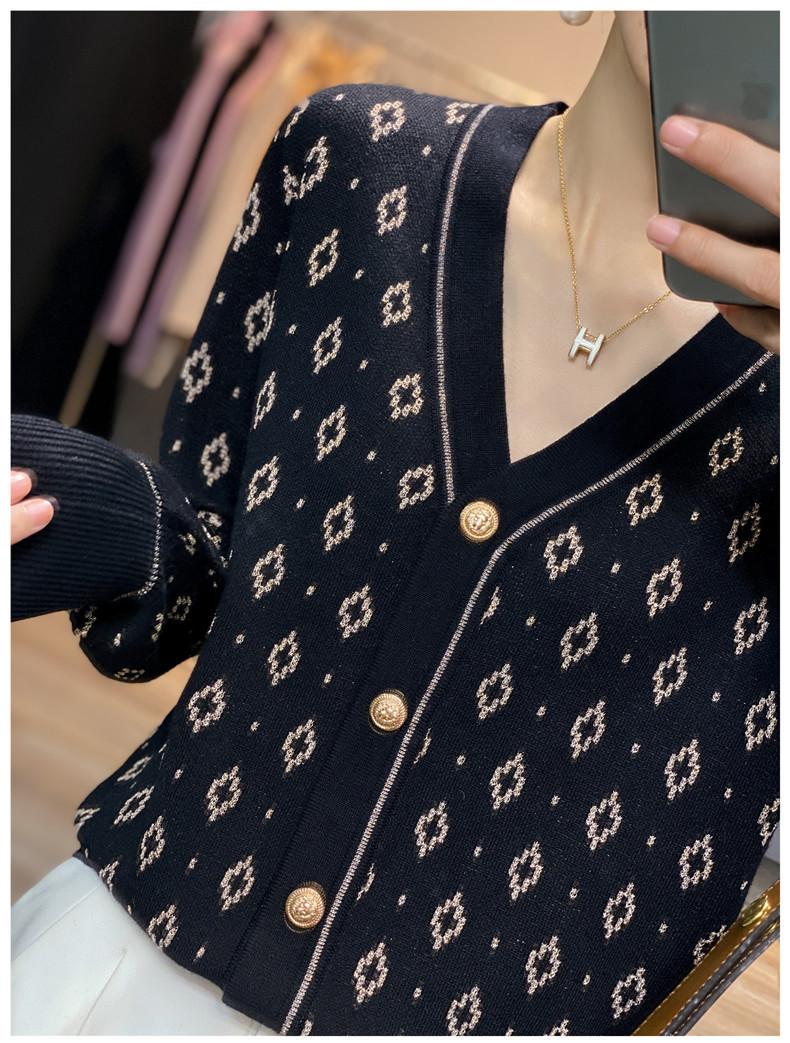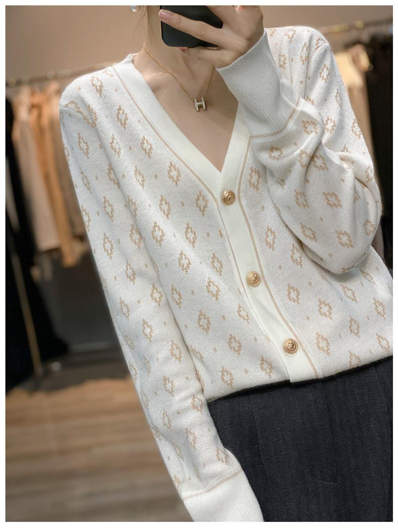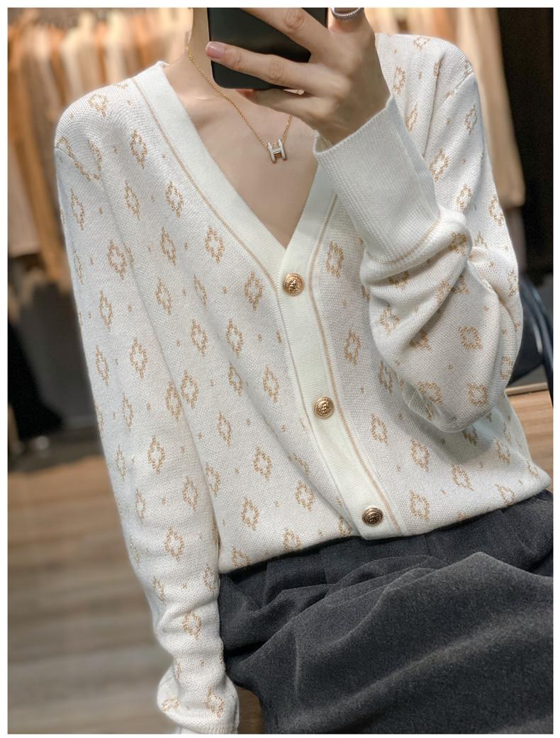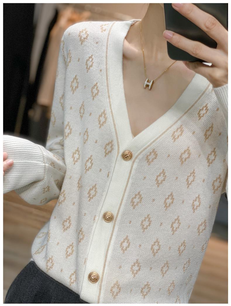 Ropa exterior versátil para mujer, lana transfronteriza, hilo dorado, nuevo cárdigan de punto, top de otoño, hilado diamante, manga larga, línea cuello en V