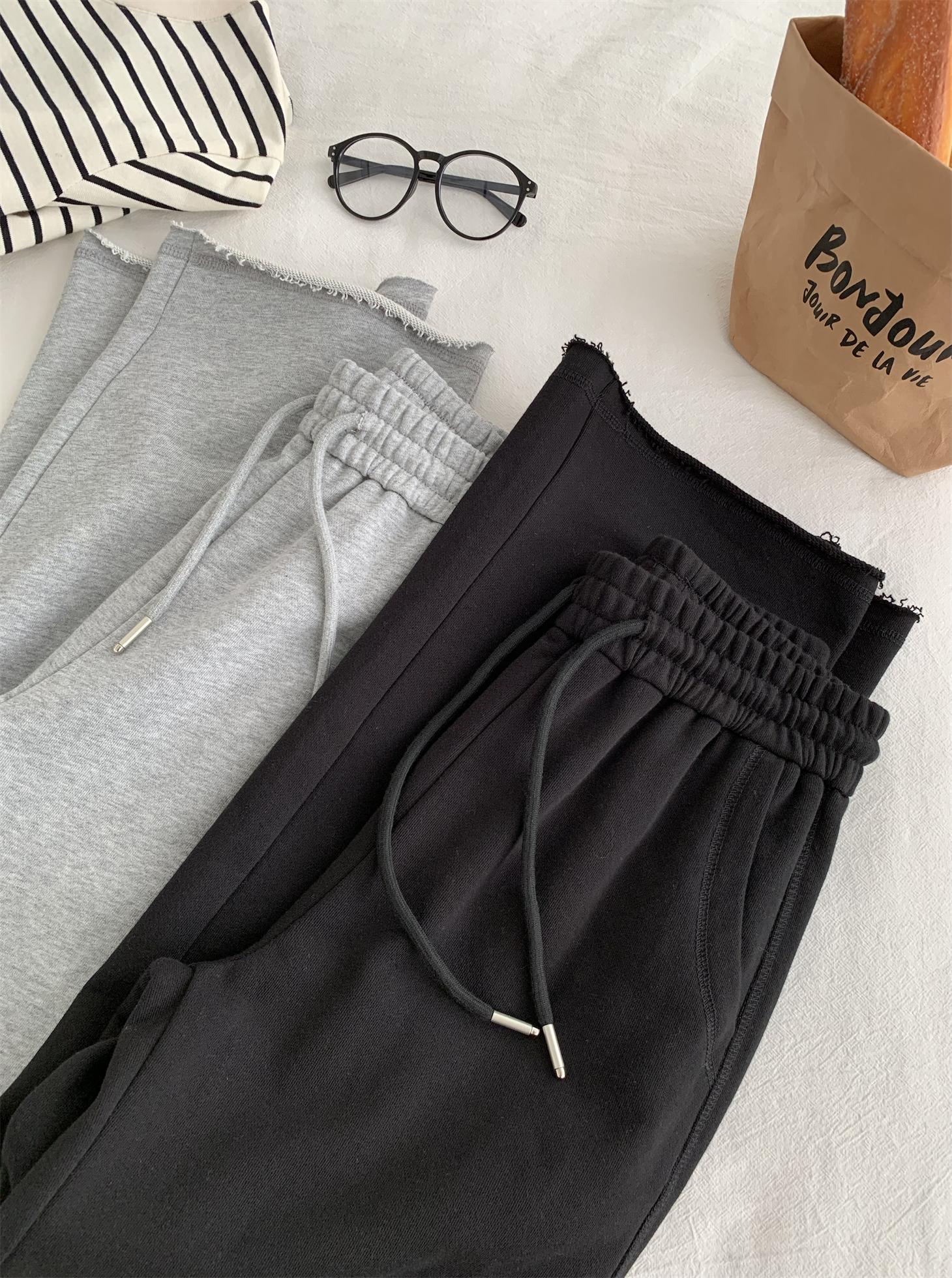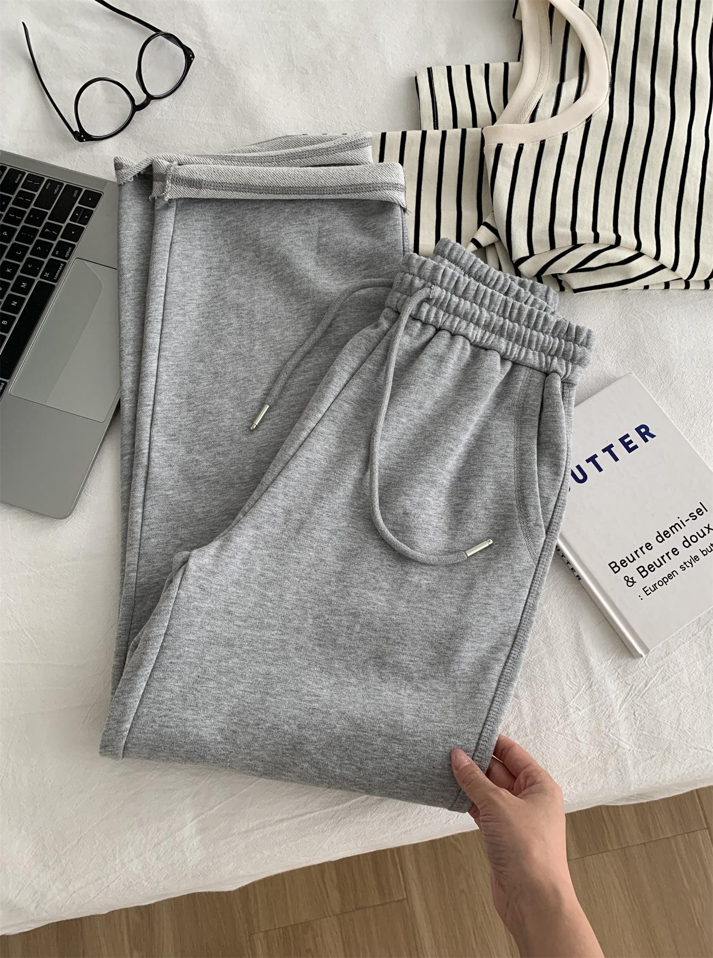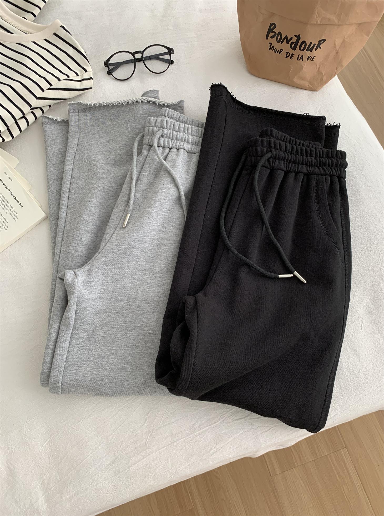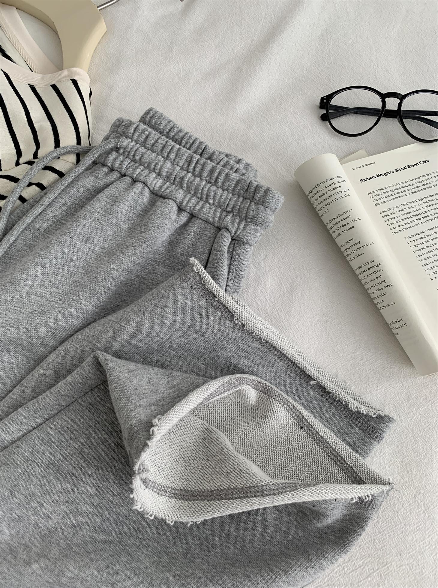 Pantalones Casuales de Pierna Recta Estilo Coreano Relajado para Mujer Otoño/Invierno Algodón Terry de Alto Gramaje Cintura Alta Cordón Ajustable Pantalones Deportivos Pantalones de Sudor con Borde Crudo