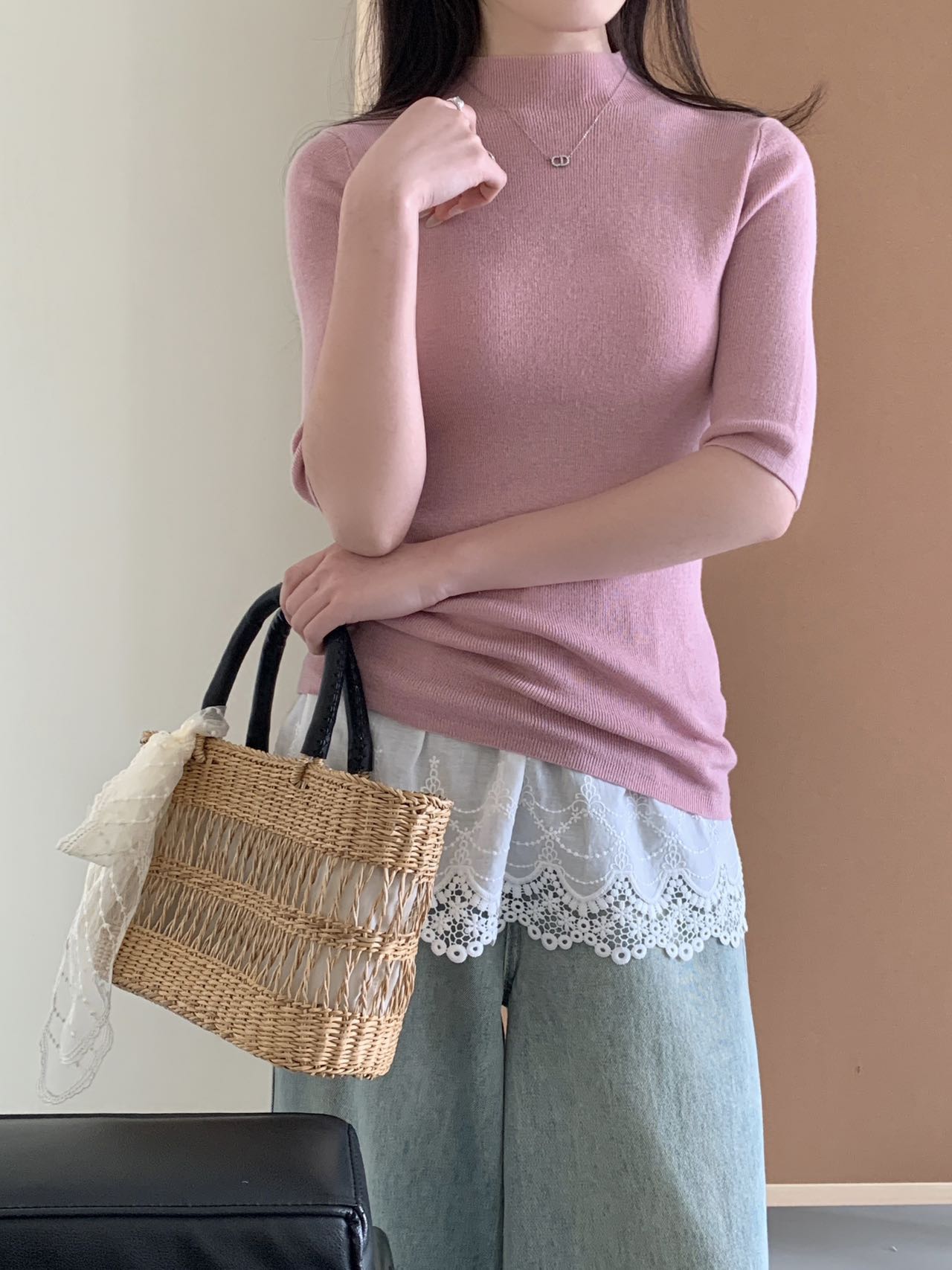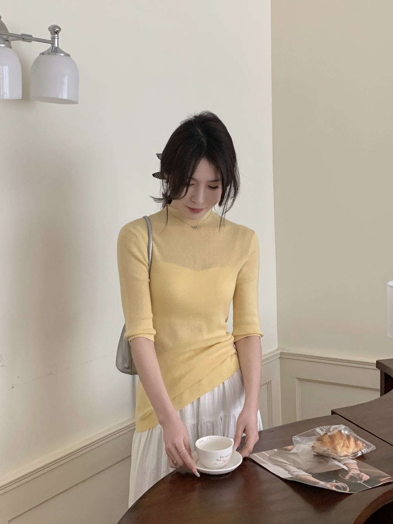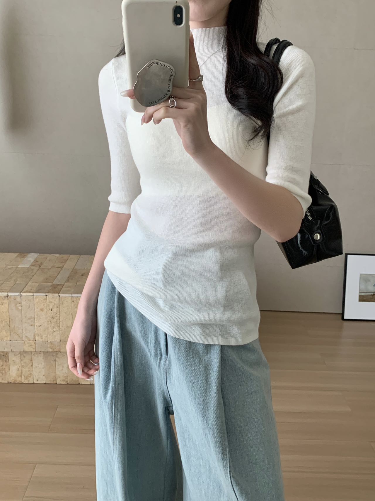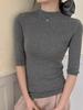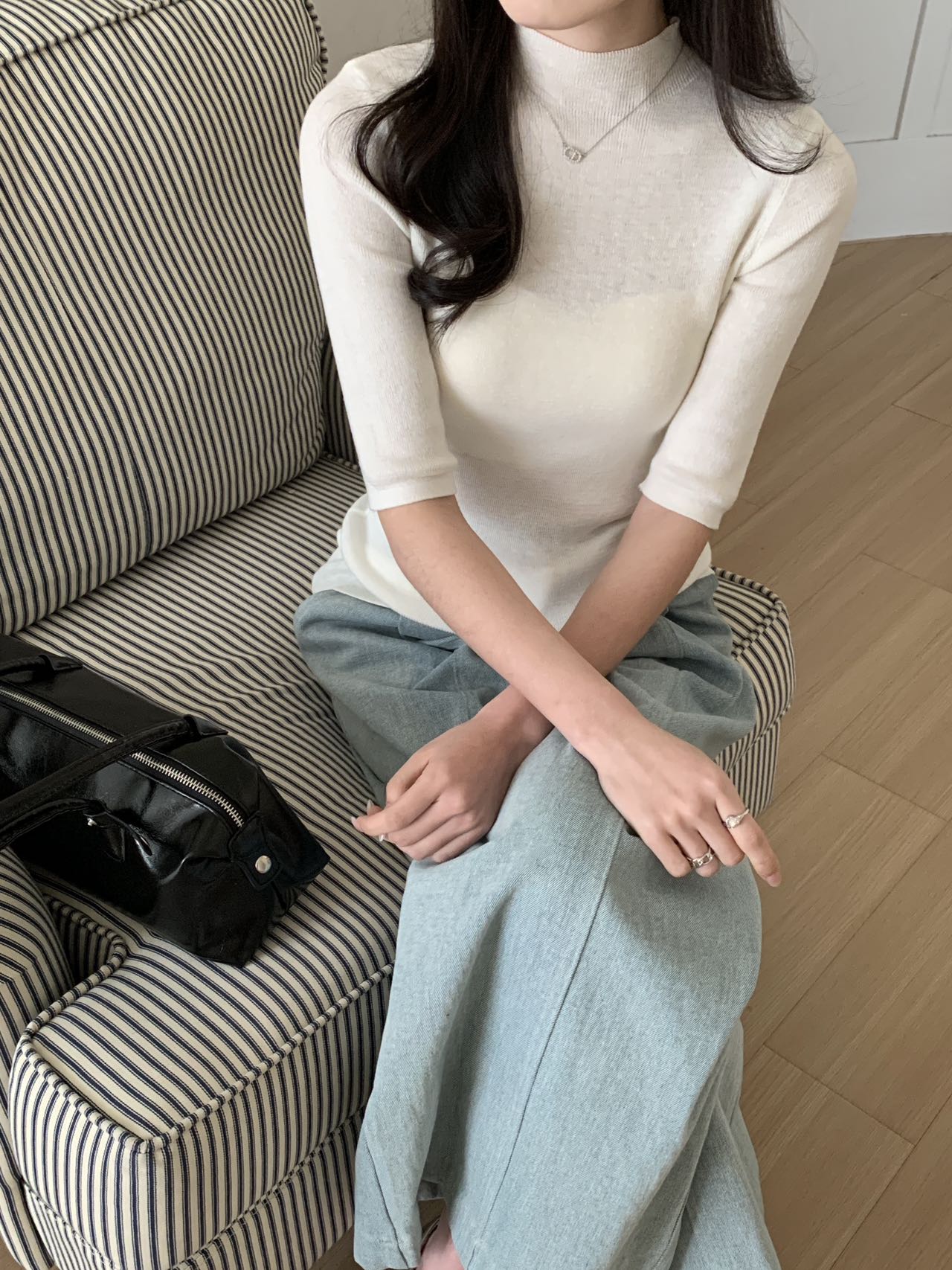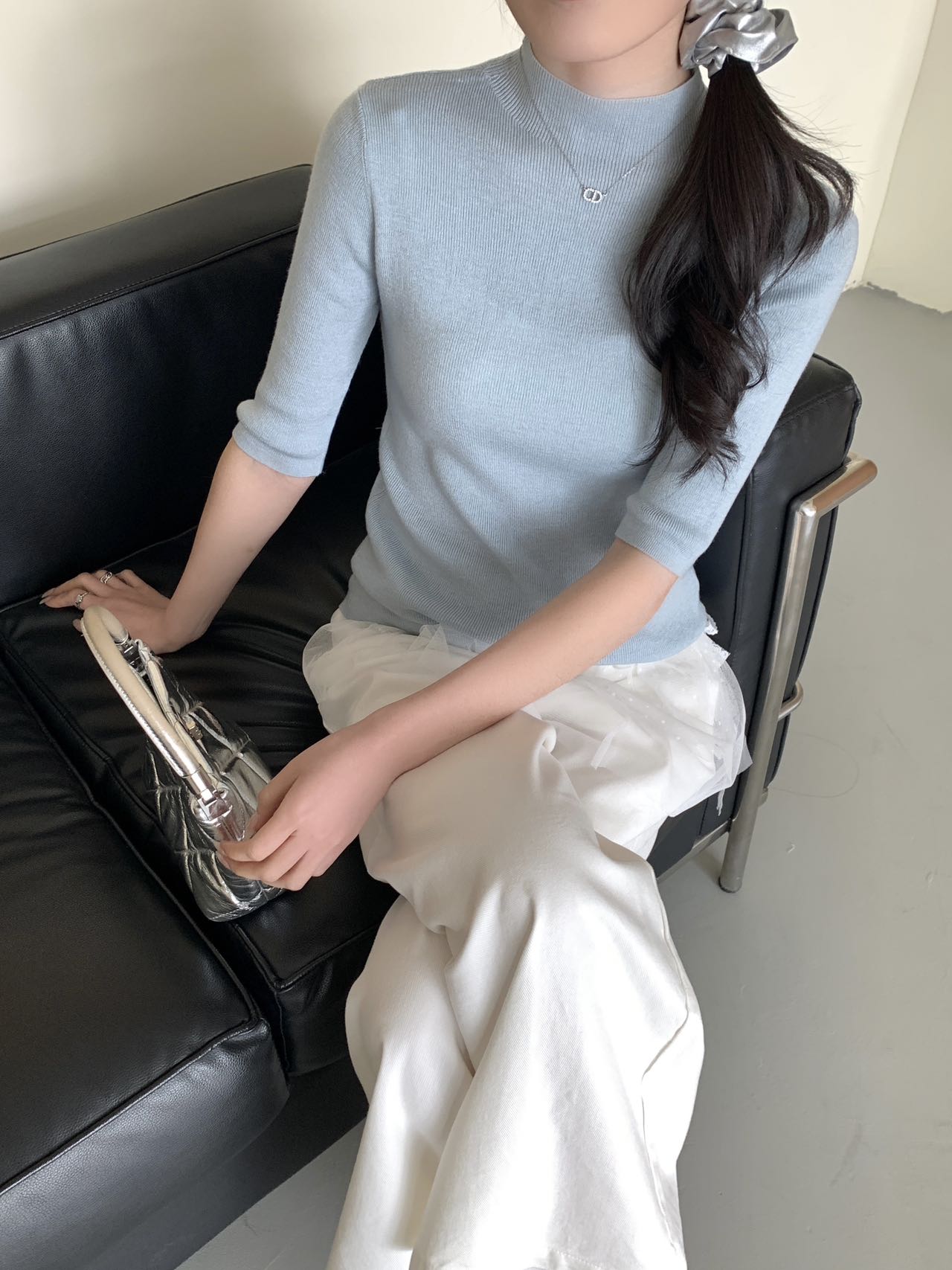 Suéter base de punto fino de lana de manga media y cuello medio alto para mujer, ropa interior nueva de primavera y otoño 2025, top ajustado
