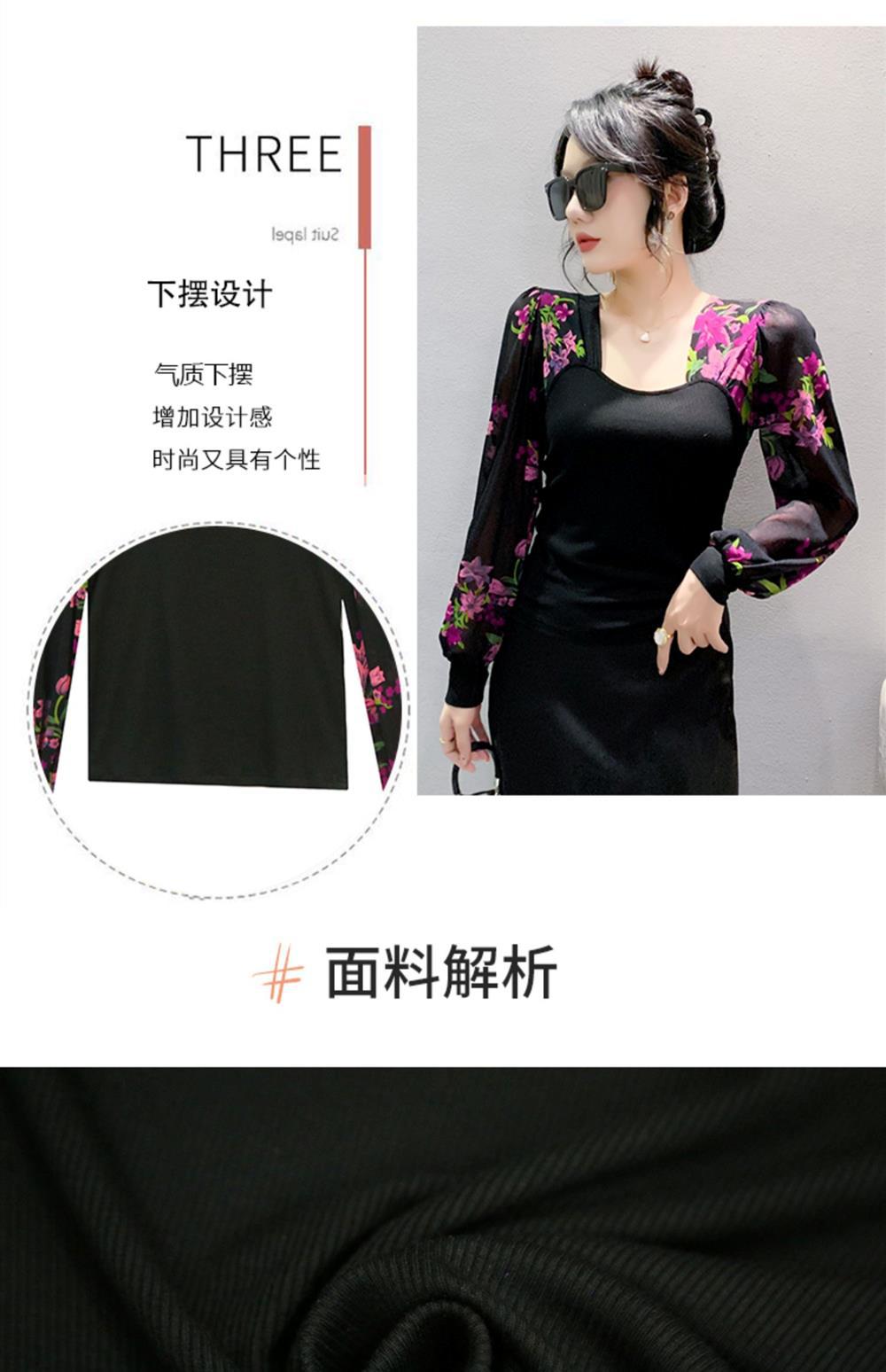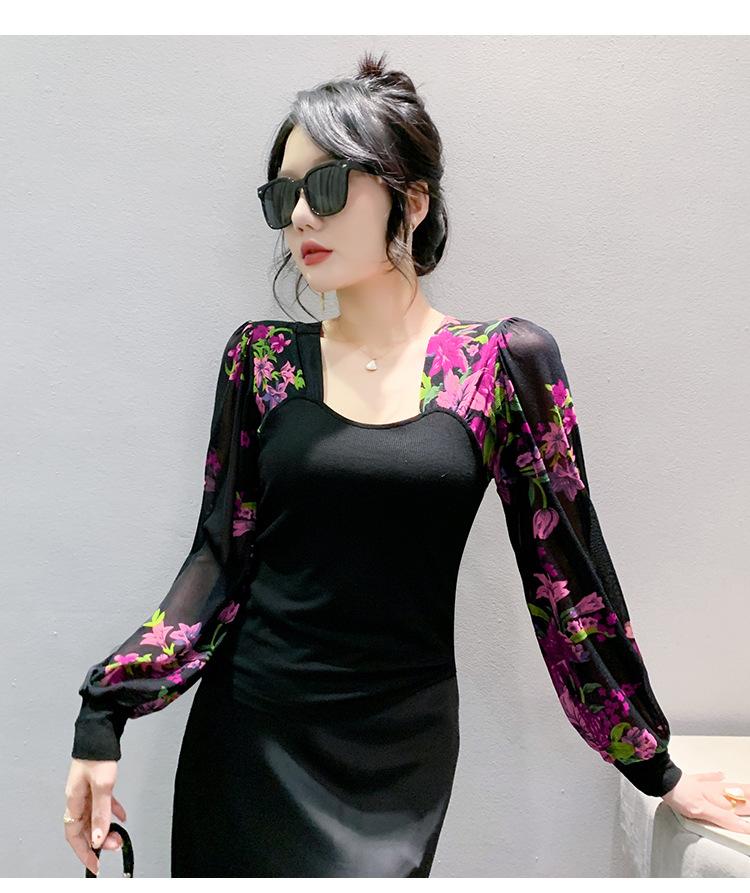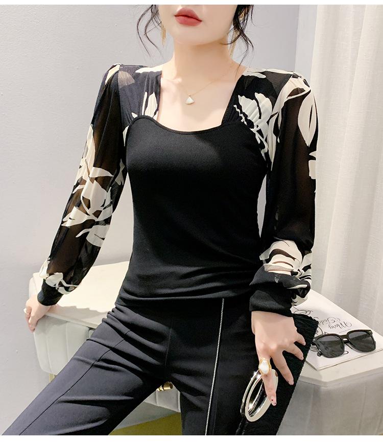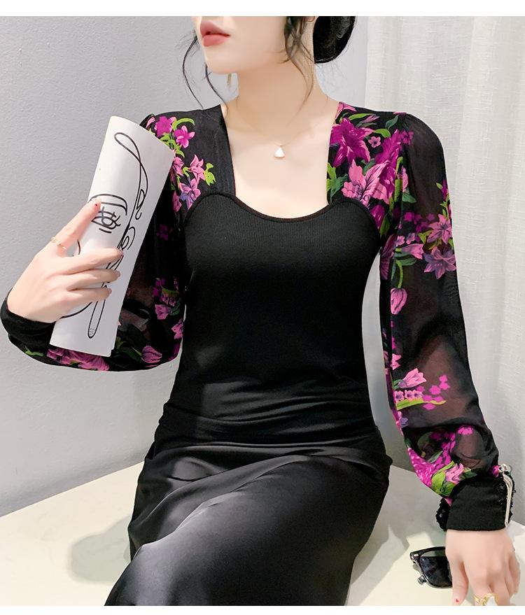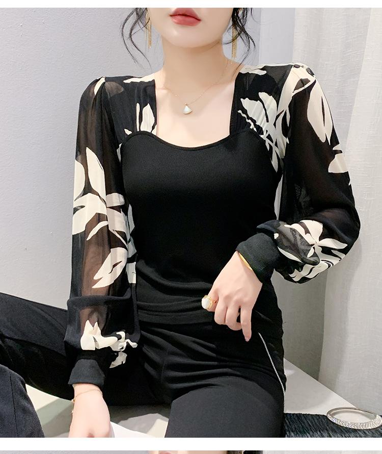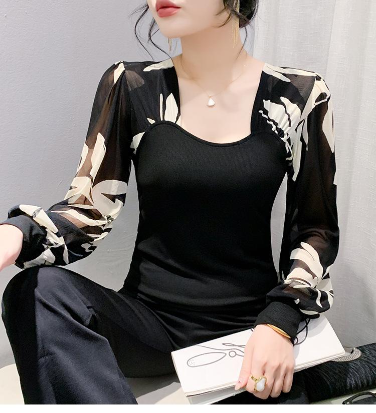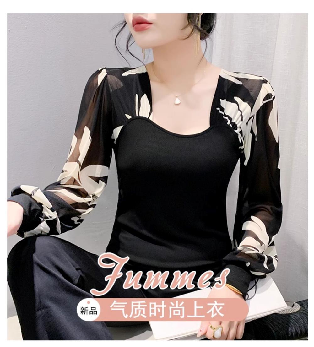 Top Retro de Estampado Floral con Cuello Cuadrado para Mujer Otoño Sentido del Diseño Parche de Malla Camiseta Base Ajustada Manga Linterna Blusa