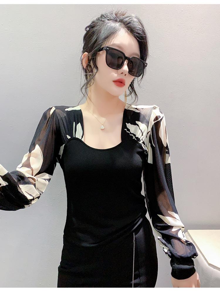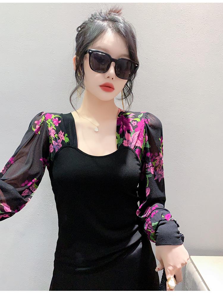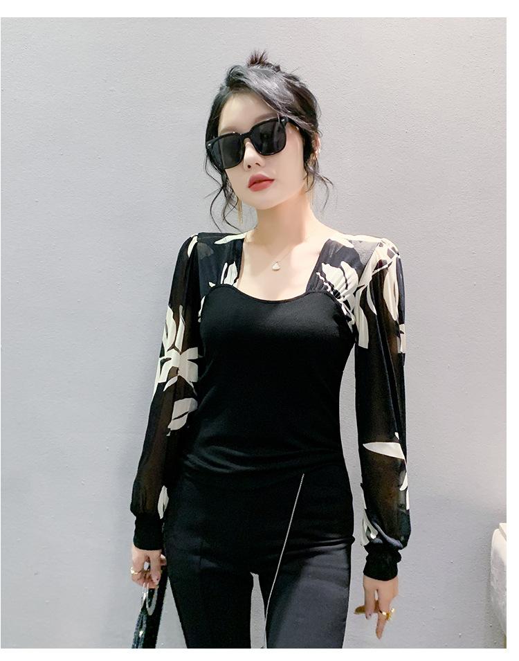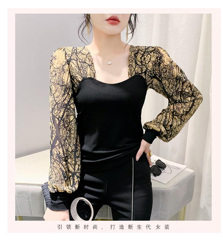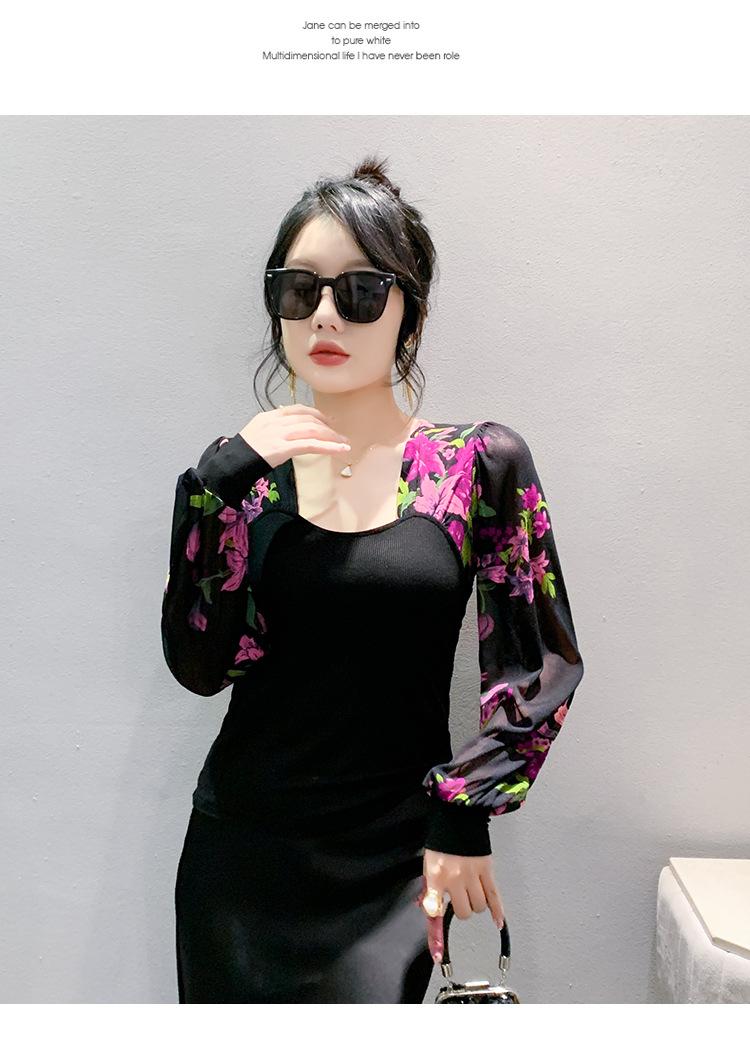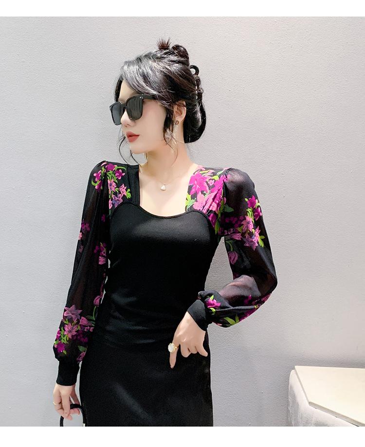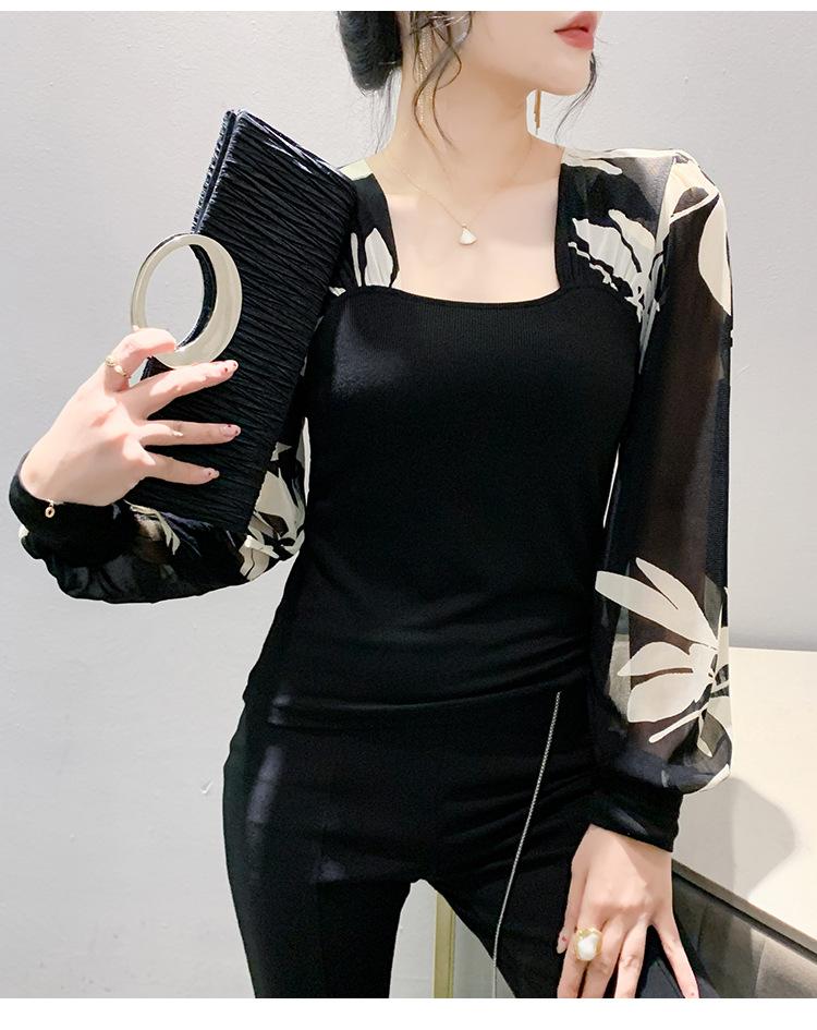 Top Retro de Estampado Floral con Cuello Cuadrado para Mujer Otoño Sentido del Diseño Parche de Malla Camiseta Base Ajustada Manga Linterna Blusa