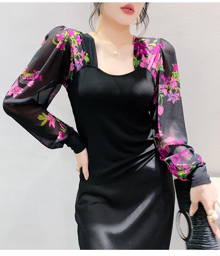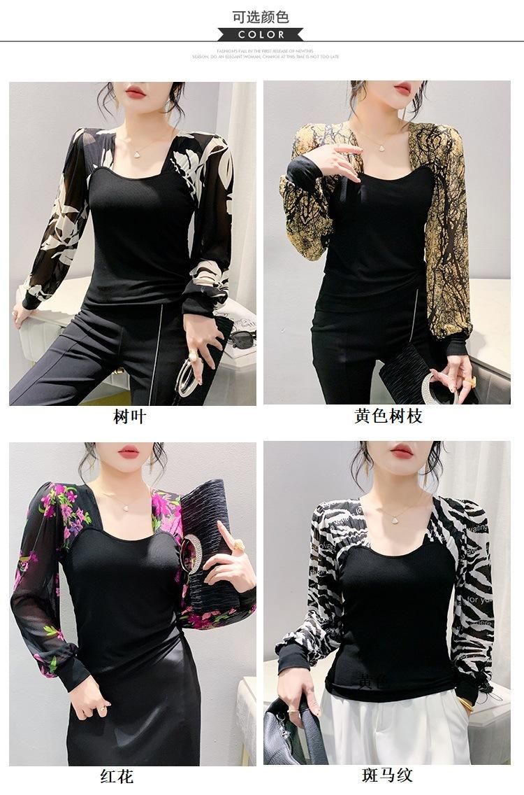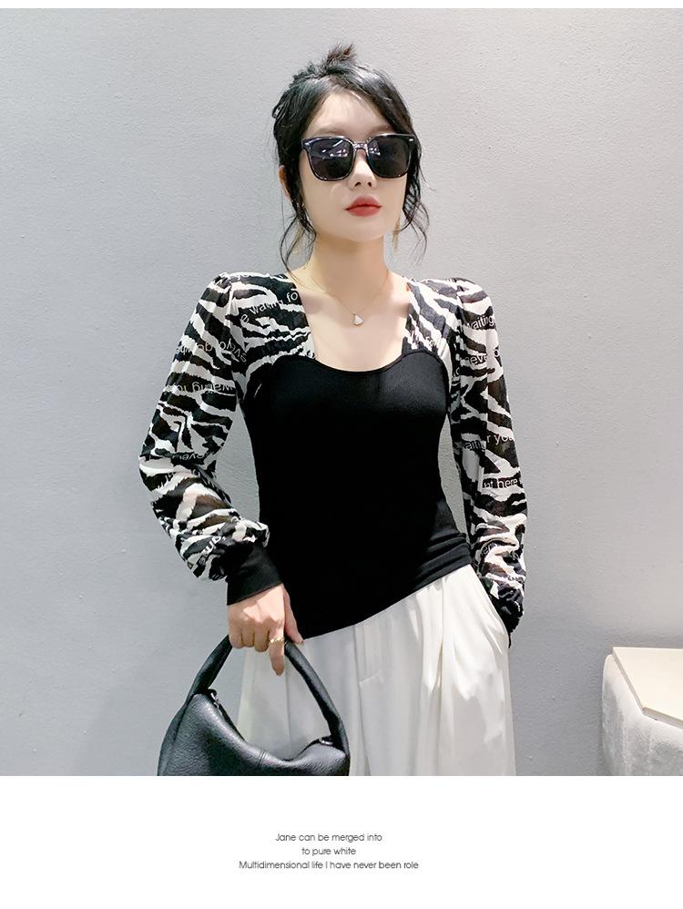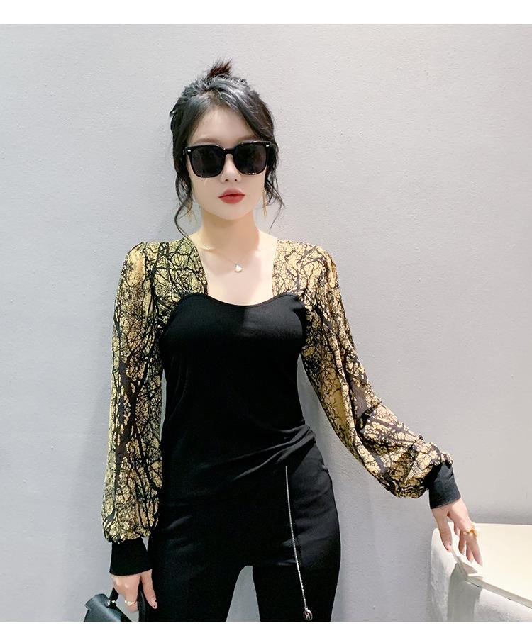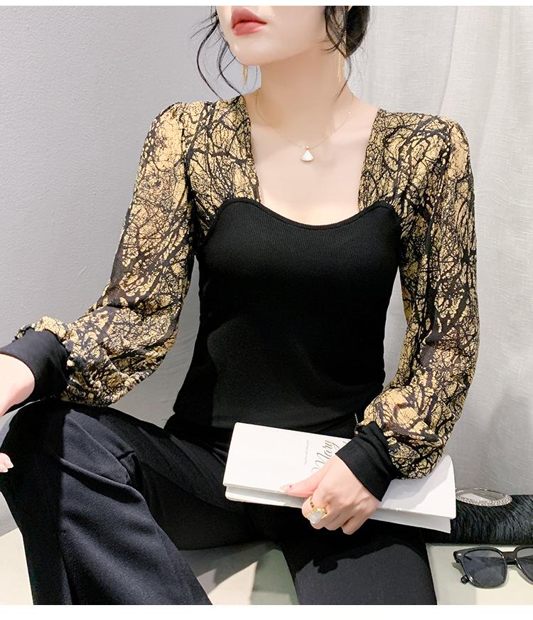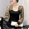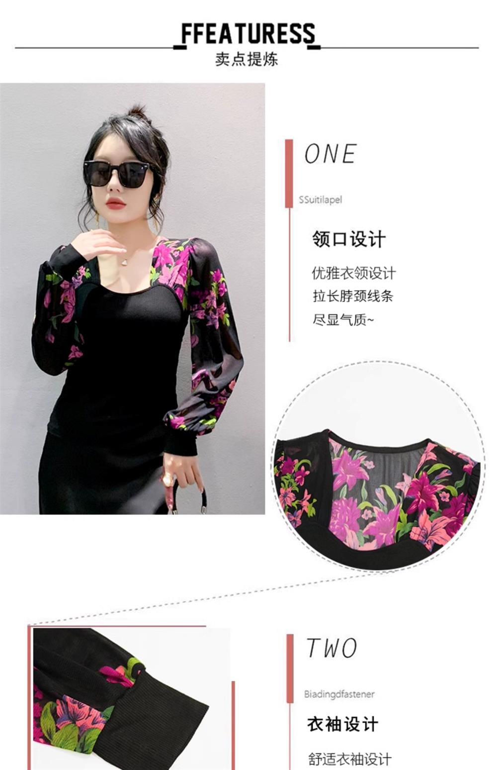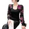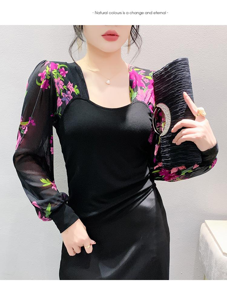Top Retro de Estampado Floral con Cuello Cuadrado para Mujer Otoño Sentido del Diseño Parche de Malla Camiseta Base Ajustada Manga Linterna Blusa