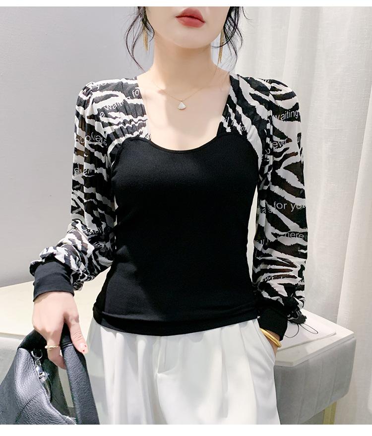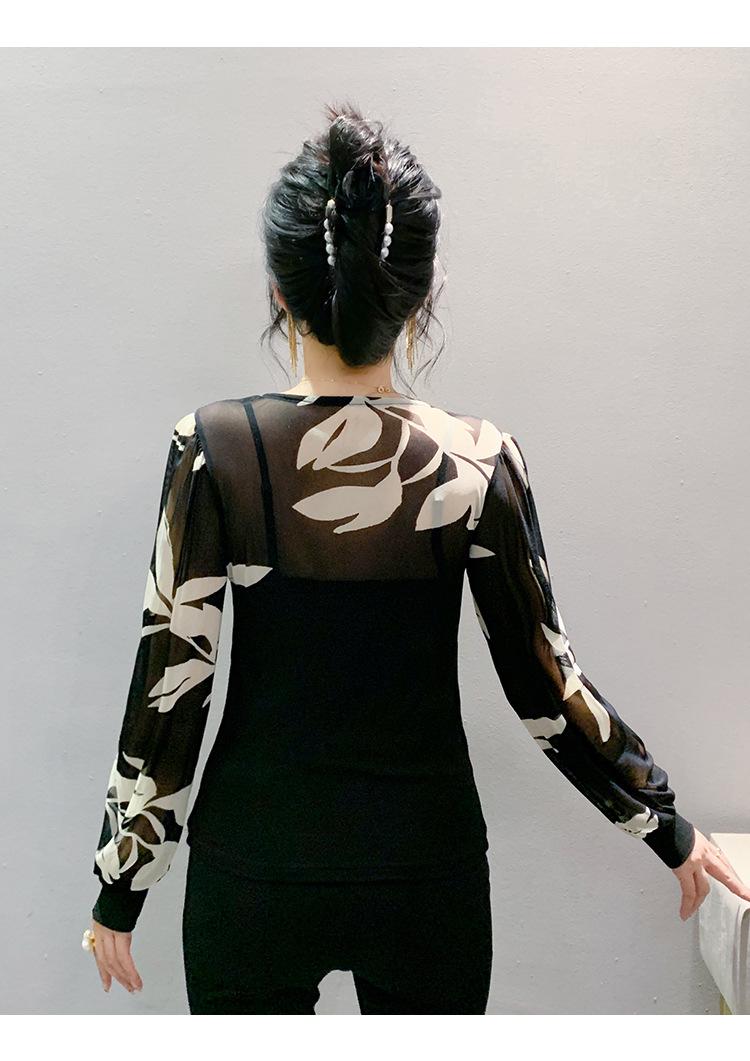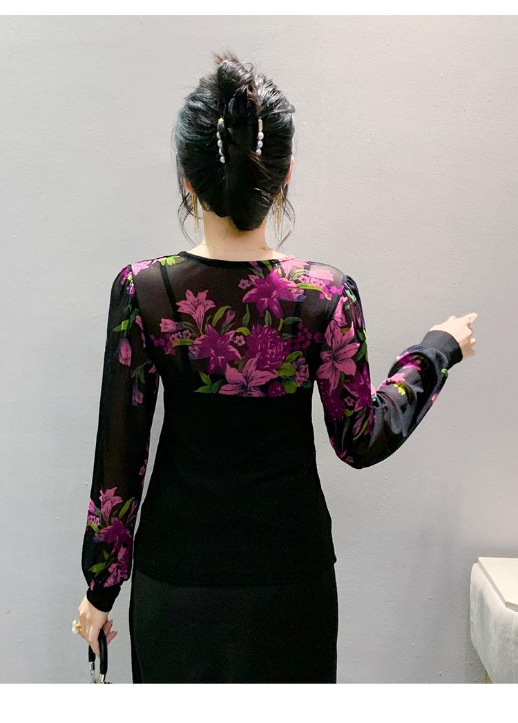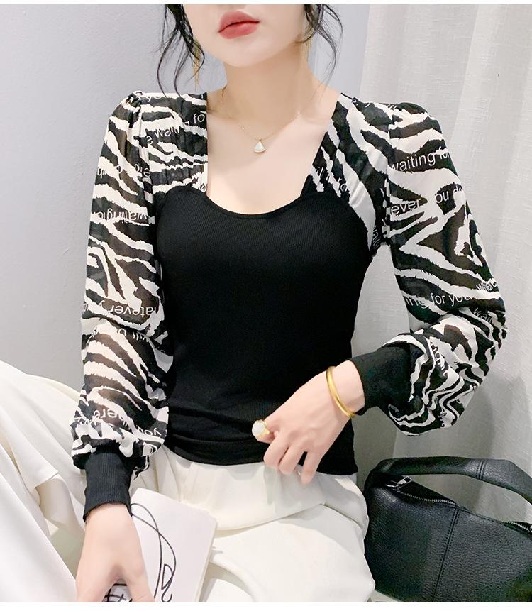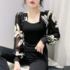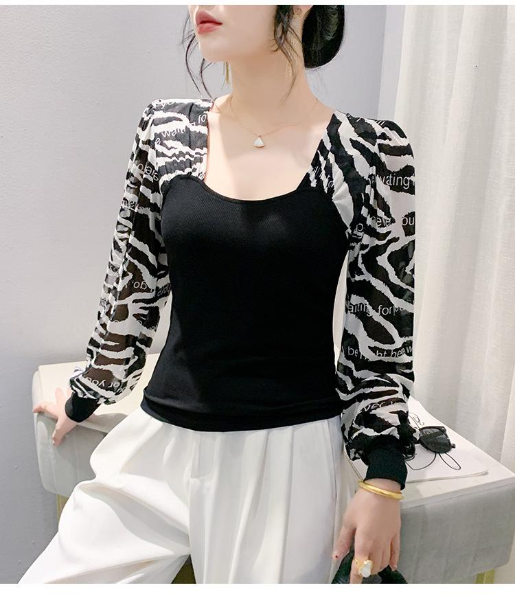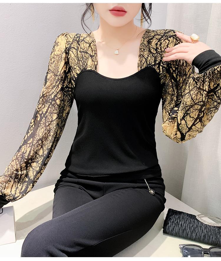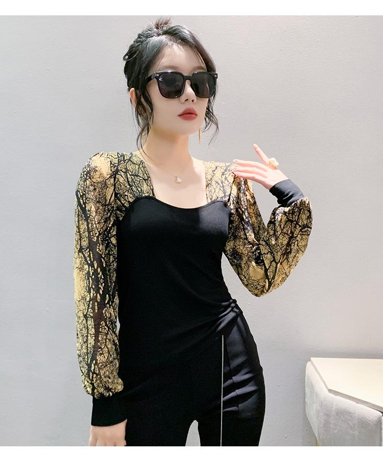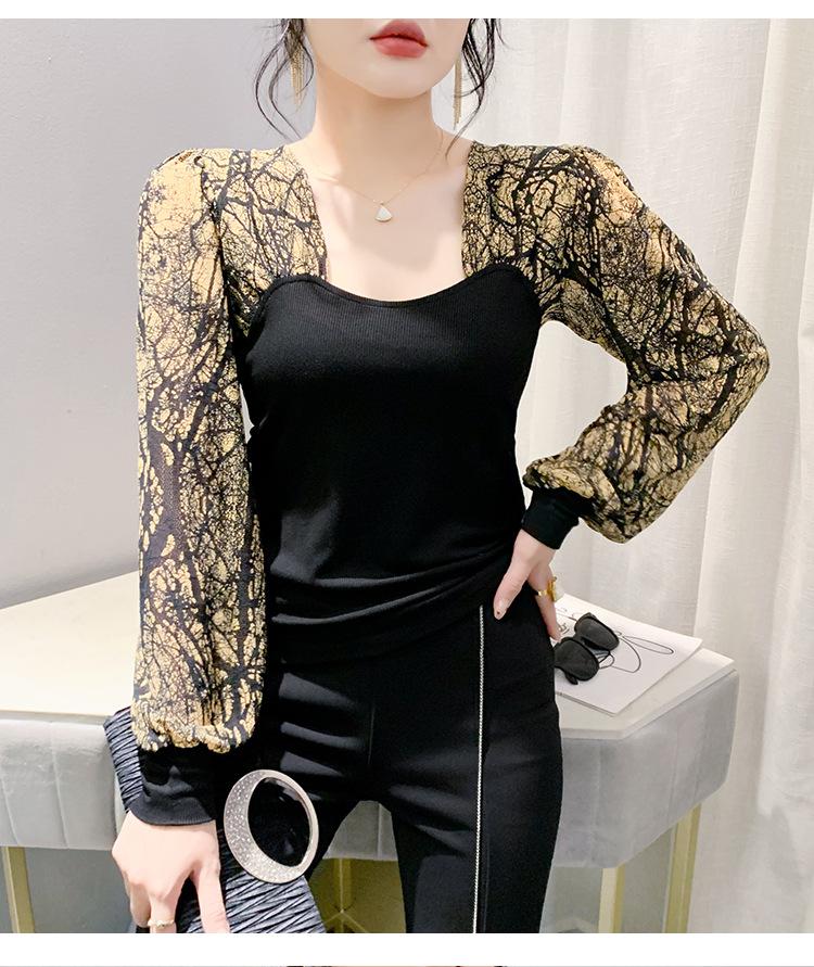 Top Retro de Estampado Floral con Cuello Cuadrado para Mujer Otoño Sentido del Diseño Parche de Malla Camiseta Base Ajustada Manga Linterna Blusa