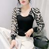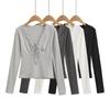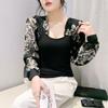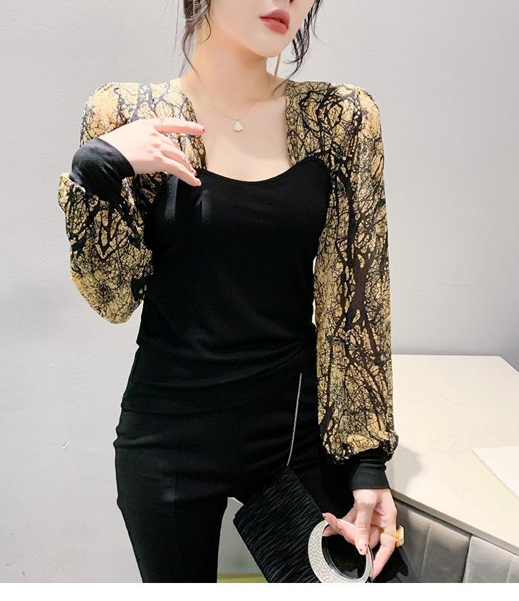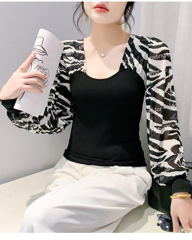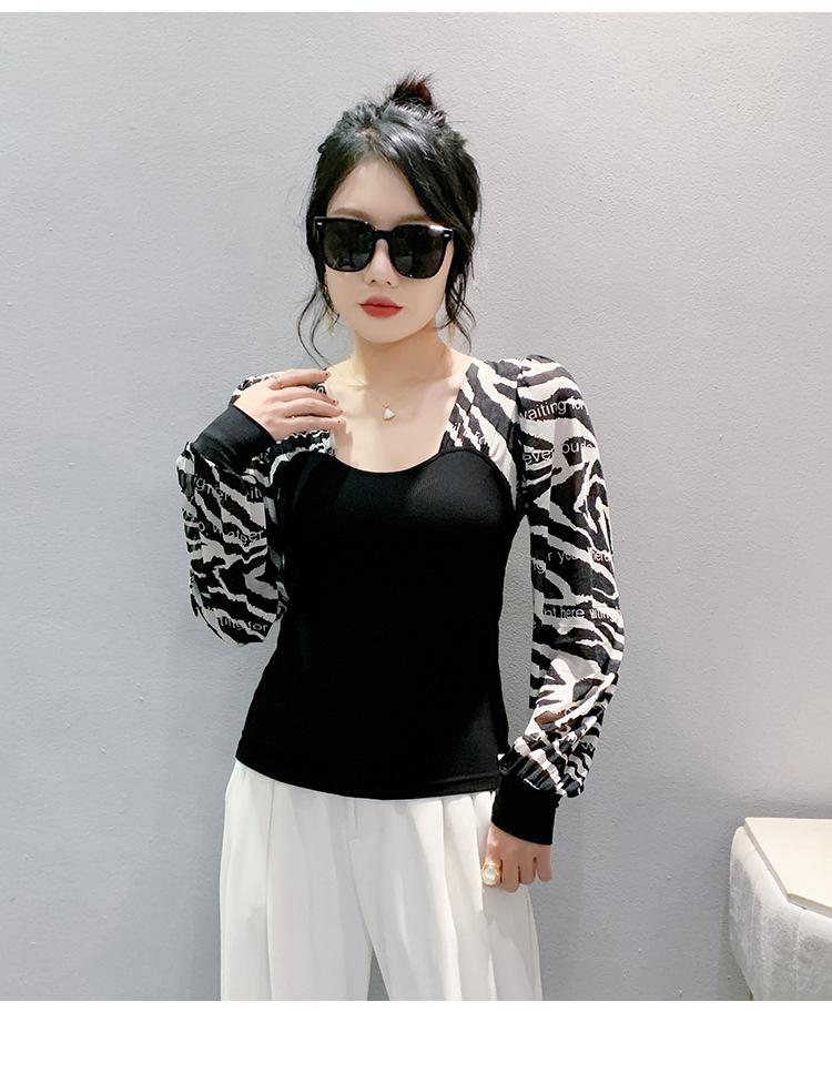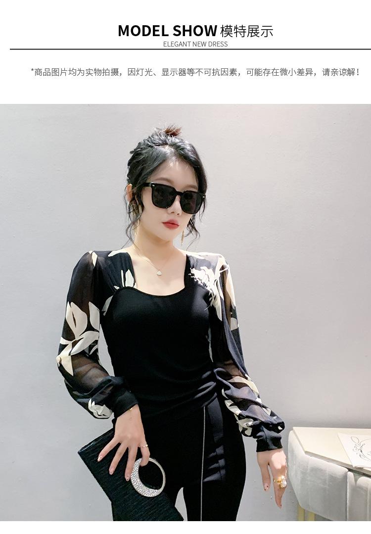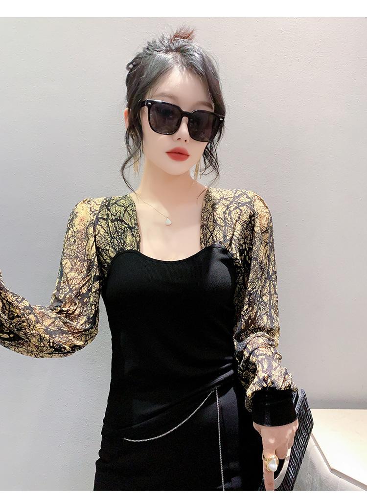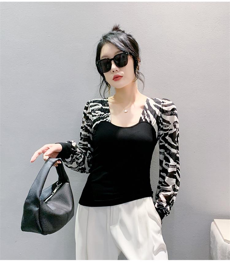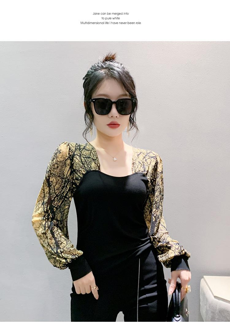 Top Retro de Estampado Floral con Cuello Cuadrado para Mujer Otoño Sentido del Diseño Parche de Malla Camiseta Base Ajustada Manga Linterna Blusa