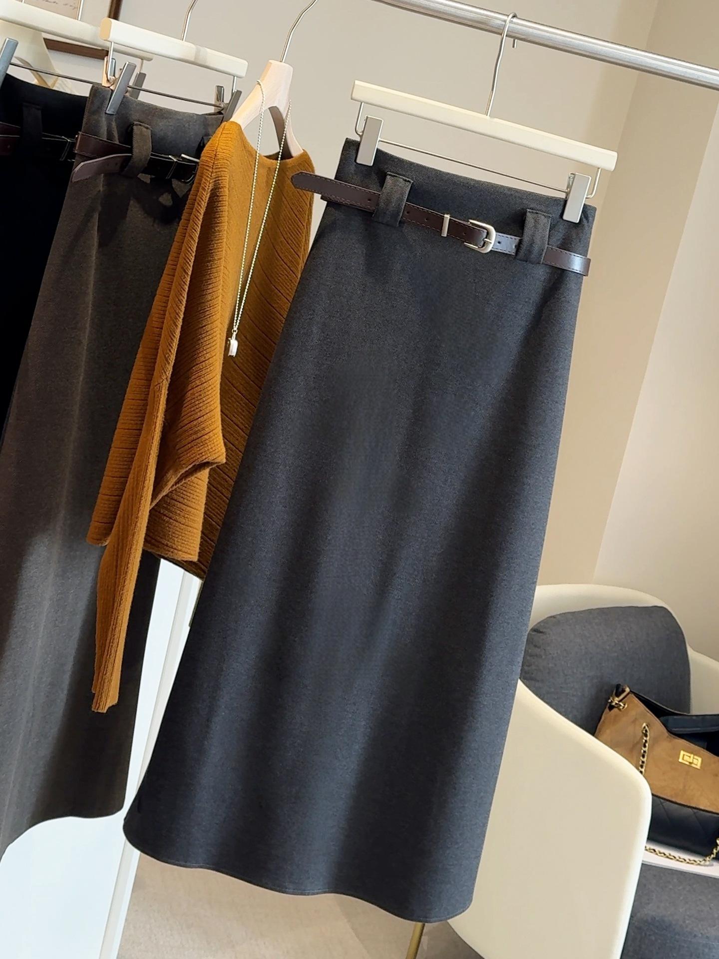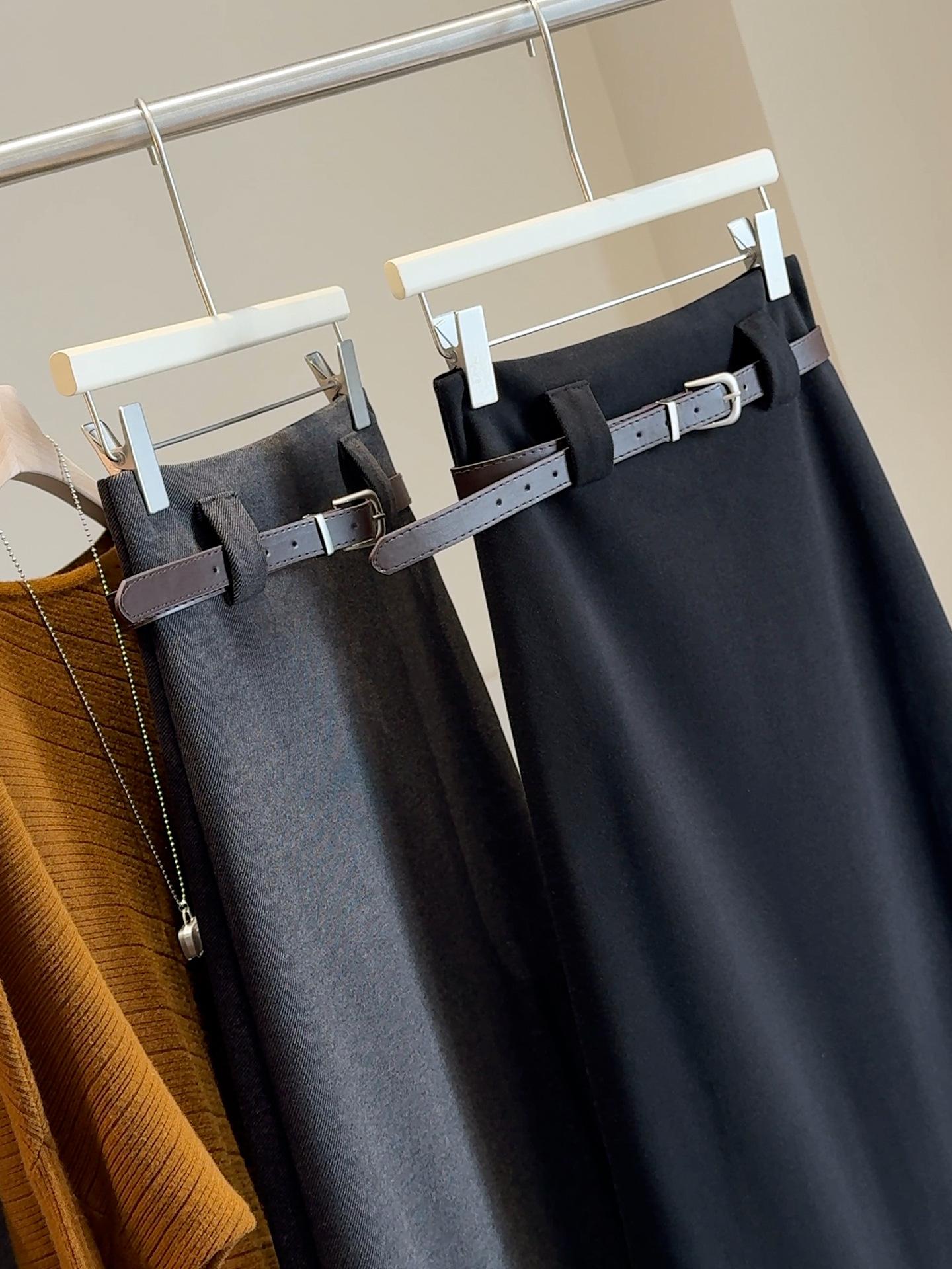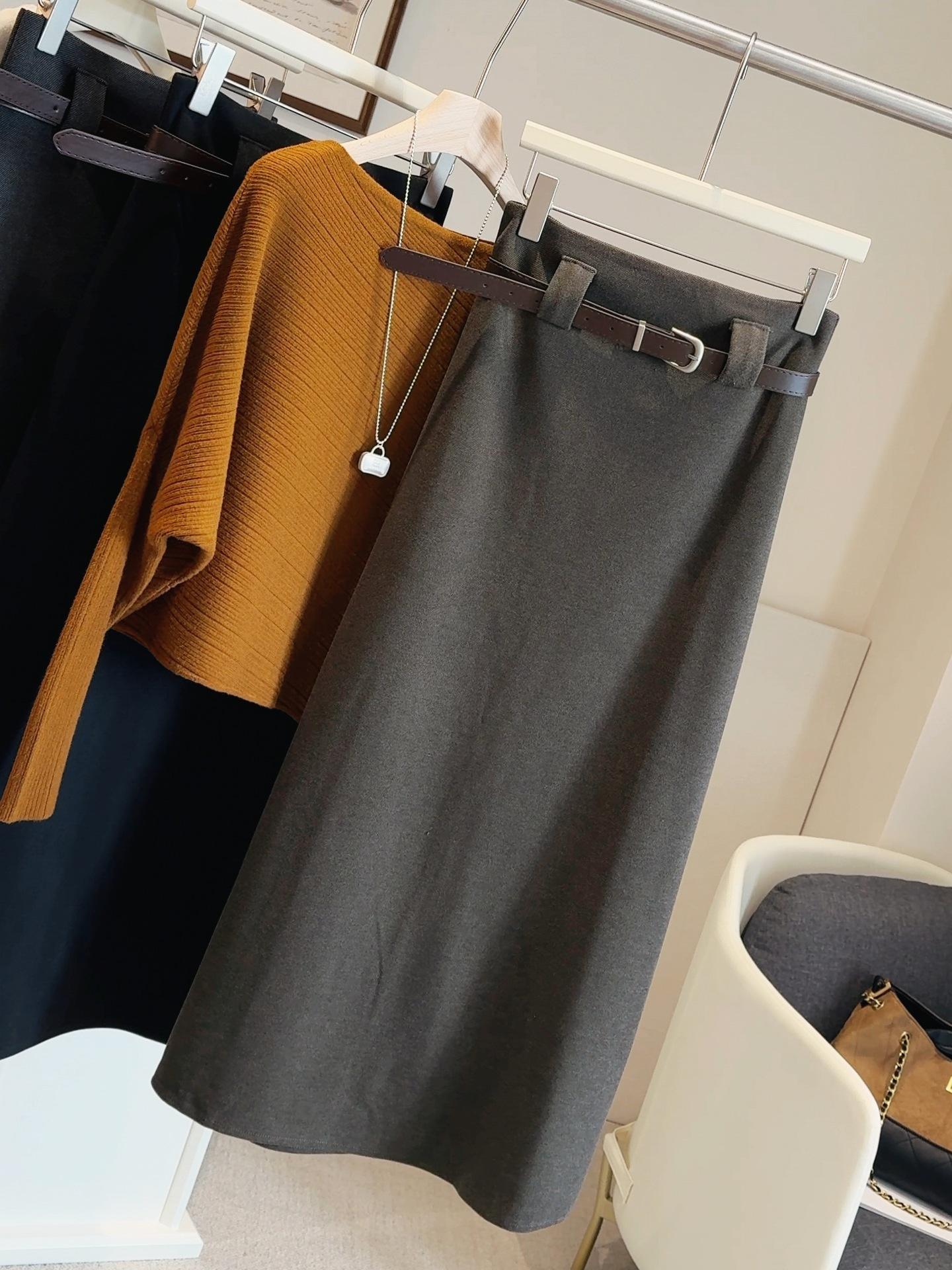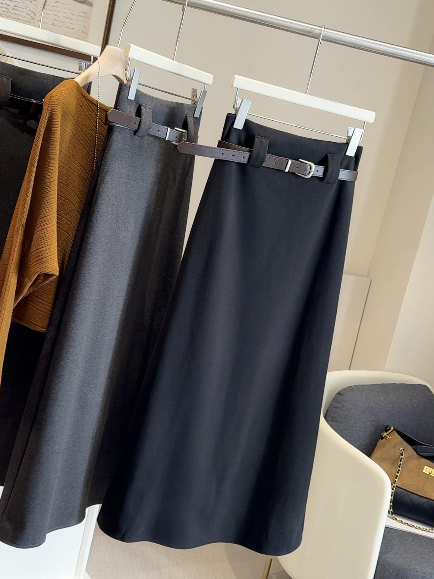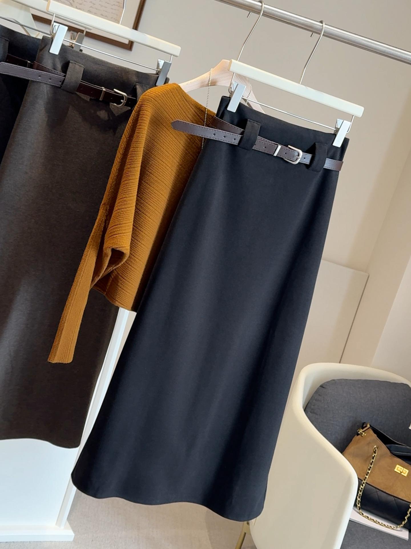 Traje negro de temperamento de alta gama falda midi de mezcla de lana para mujer otoño e invierno nuevo cintura alta adelgazante versátil falda acampanada
