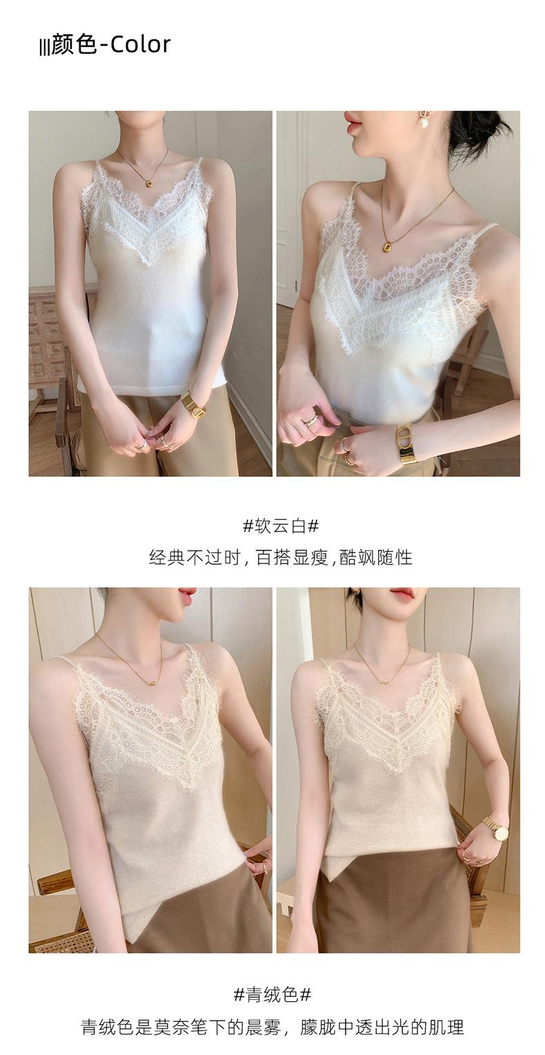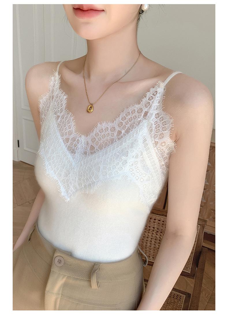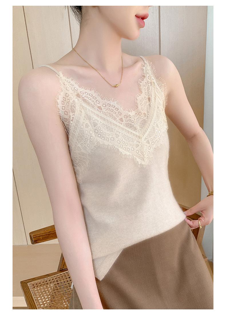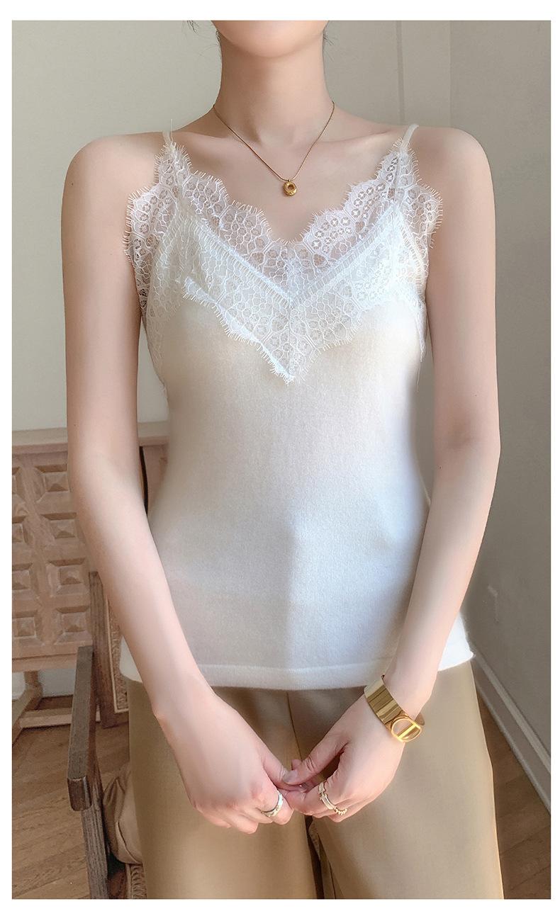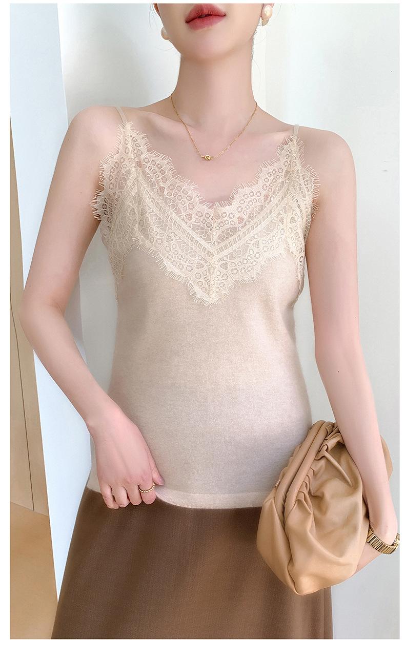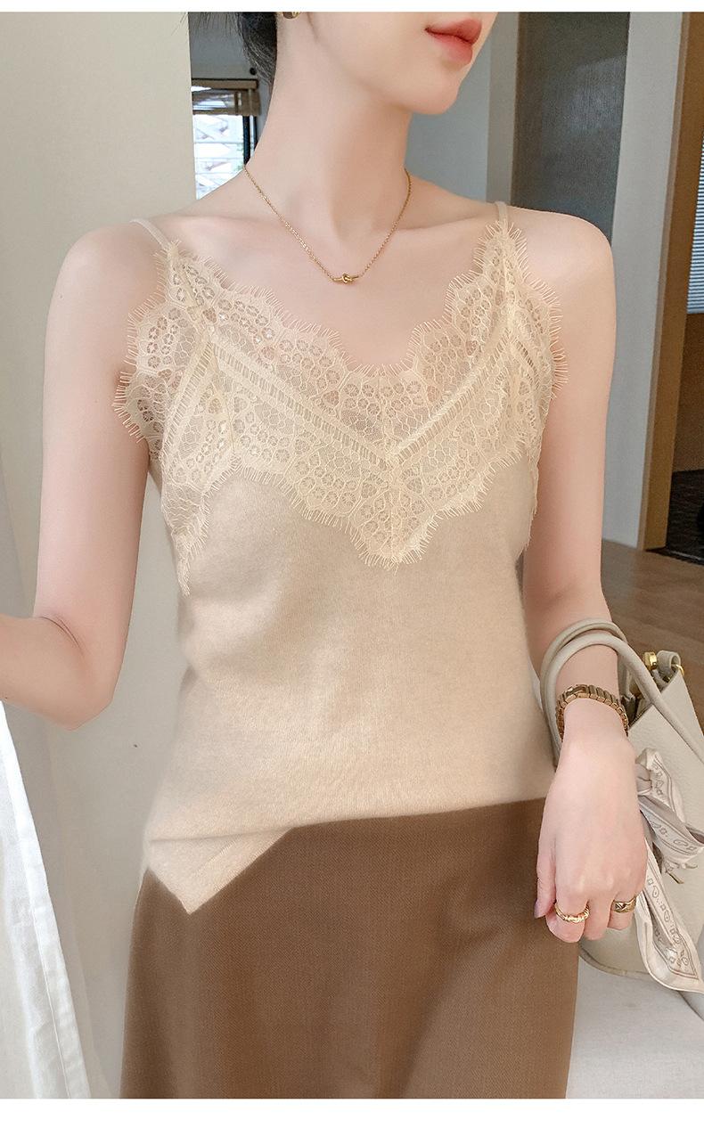 Francés Nuevo Suave y Agradable para la Piel Cuello en V Doble Tirante Diseño de Encaje Camisola de Punto de Cachemira Top para Mujer