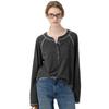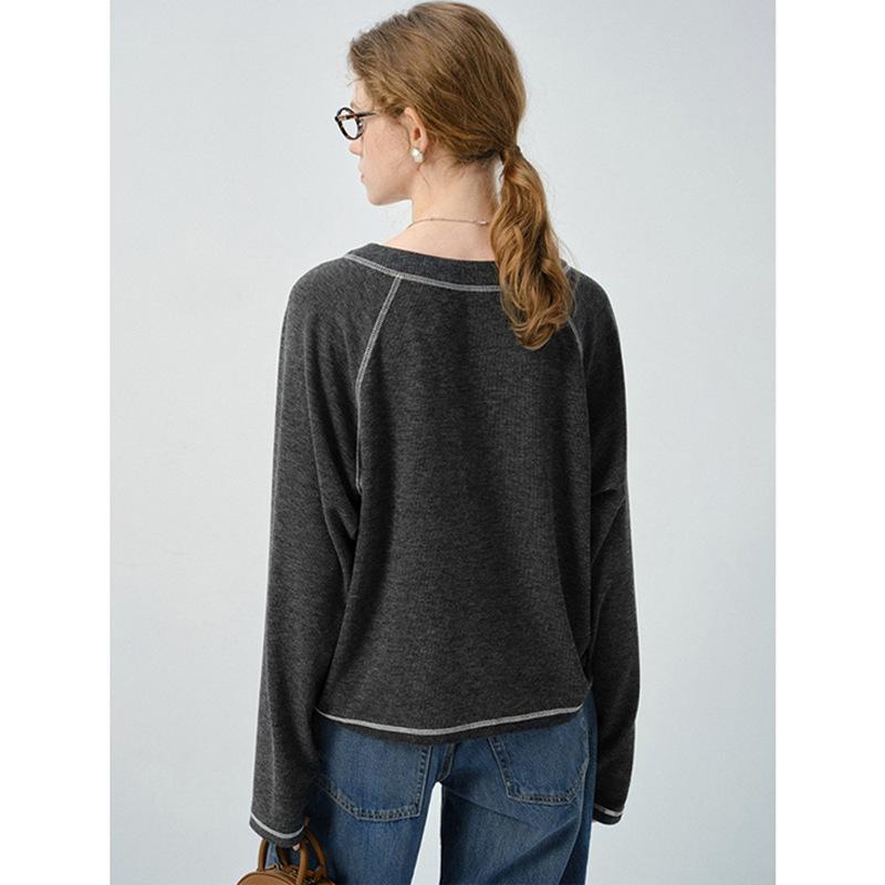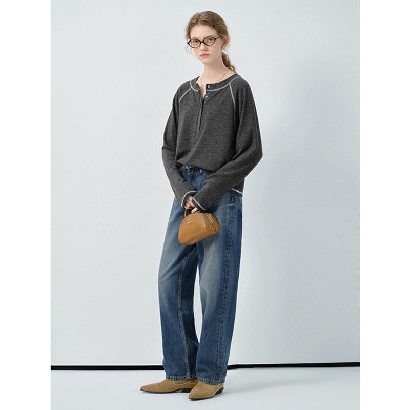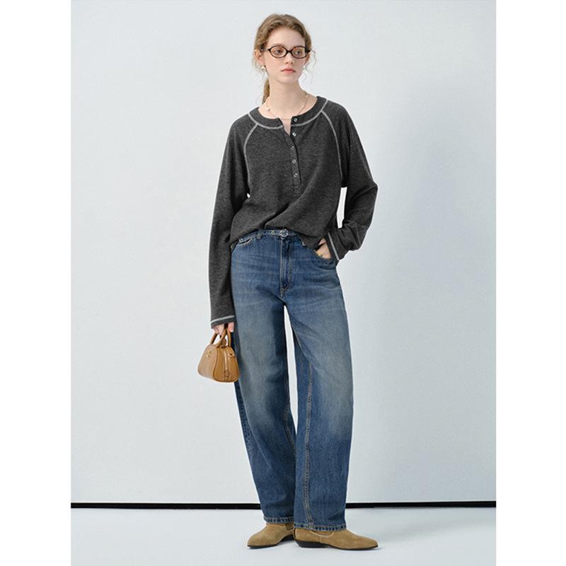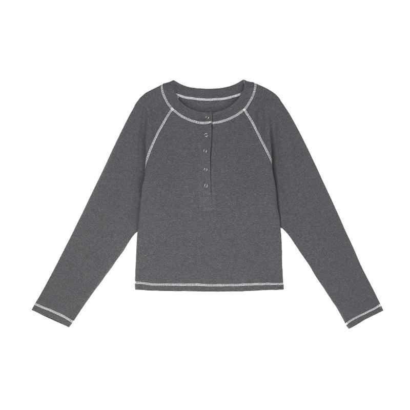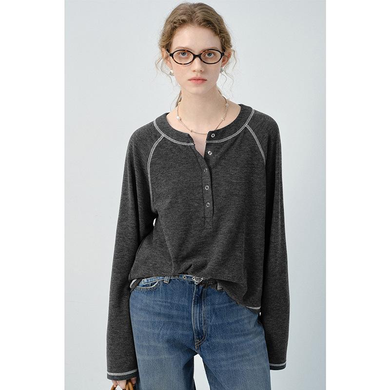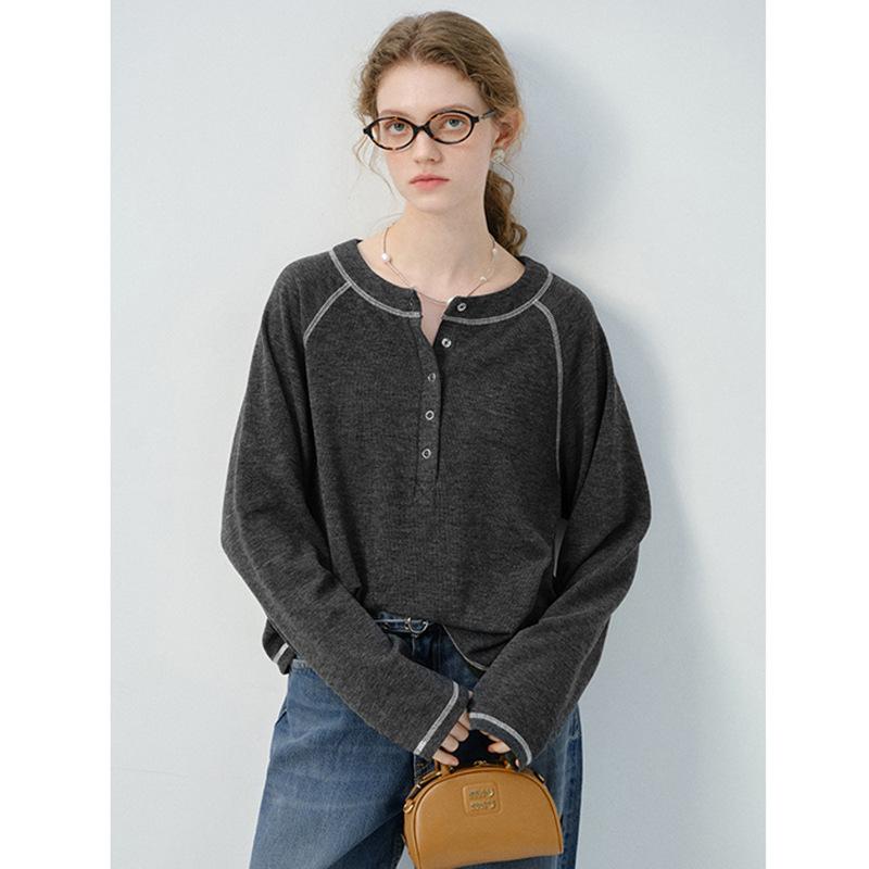 Camiseta básica de manga larga con cuello semiabierto de botón francés para mujer, diseño de otoño, sentido del diseño, decoración de línea brillante, top holgado que se puede llevar por fuera