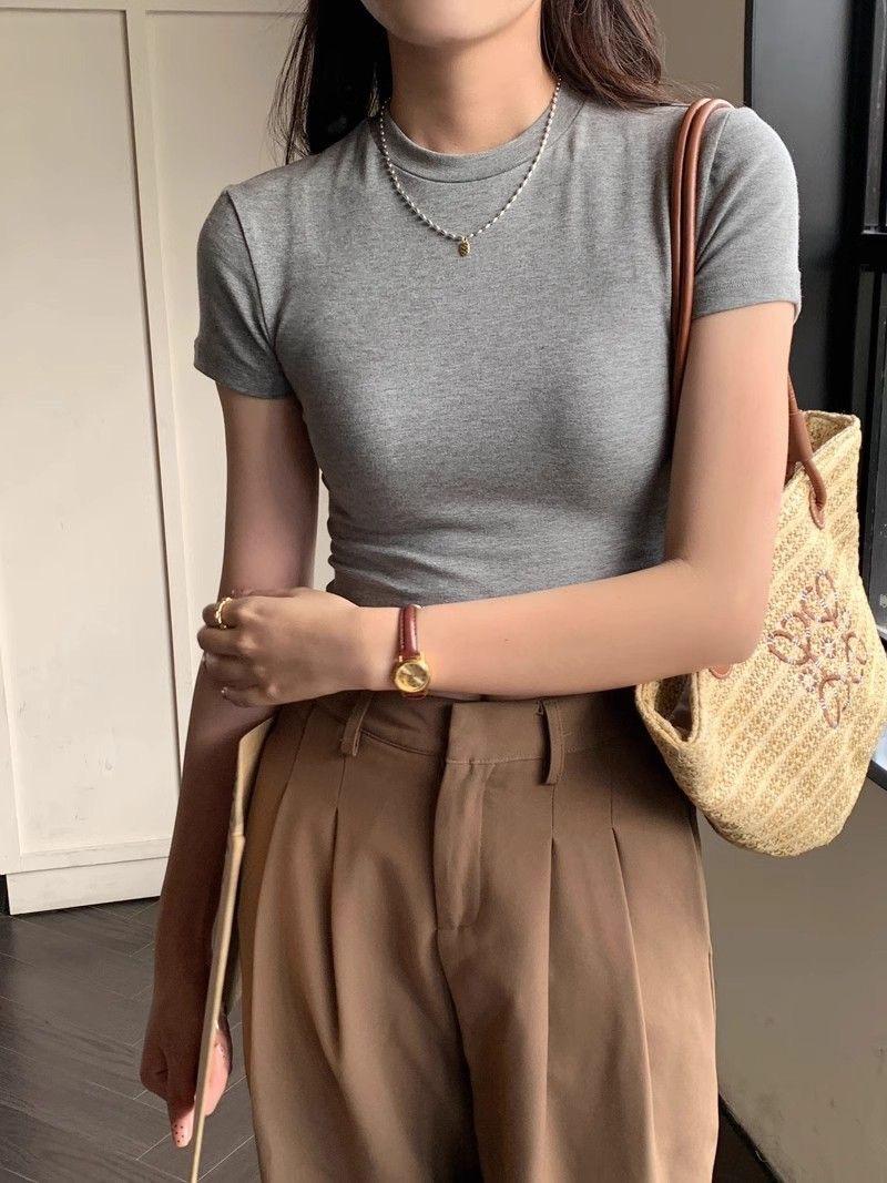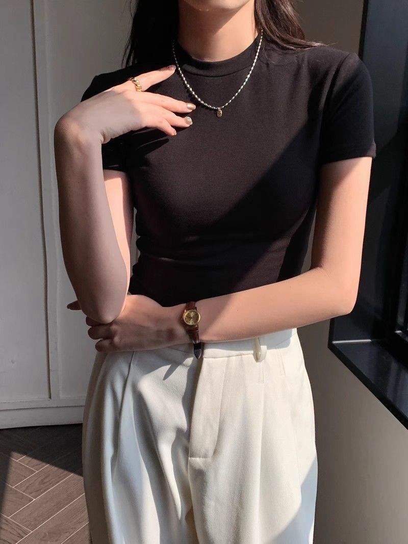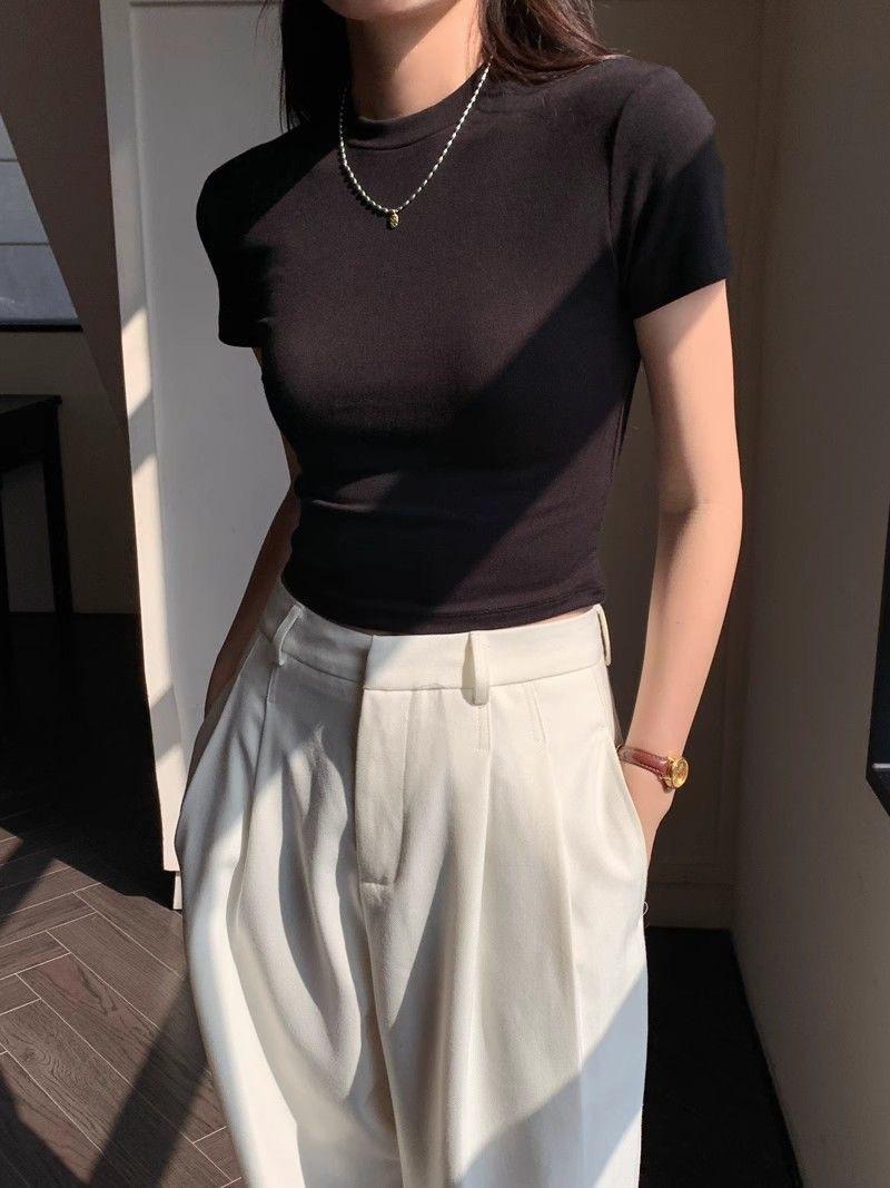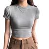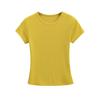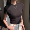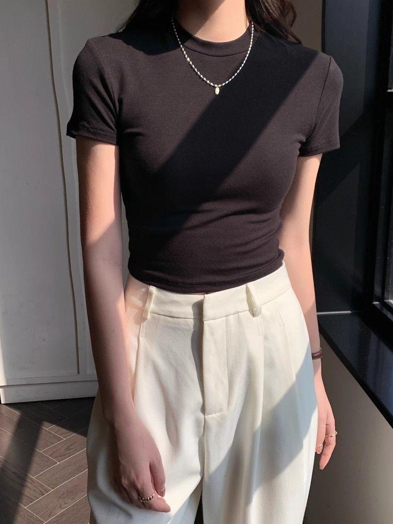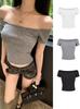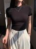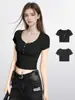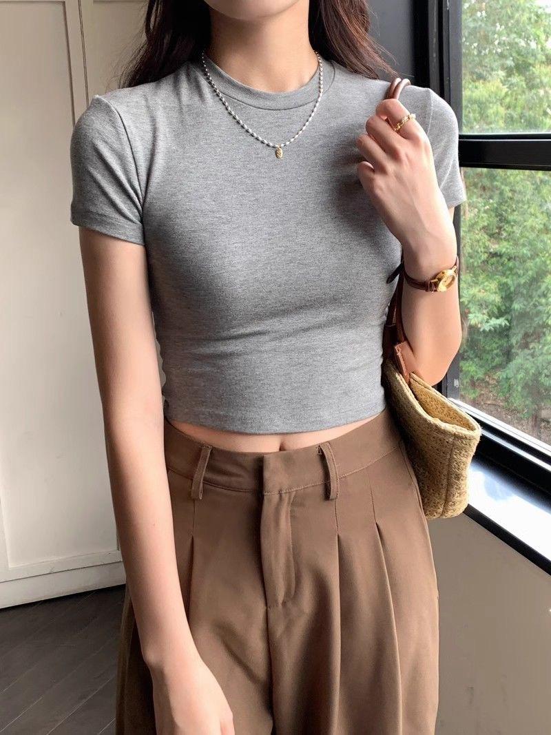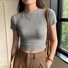 Primavera y Verano Nueva Camiseta Ajustada de Hombro Derecho con Cuello Redondo Pequeño y Manga Corta para Mujer Top Sexy Ajustado de Cintura Alta que Deja al Descubierto el Ombligo