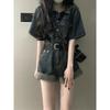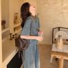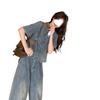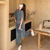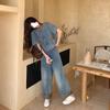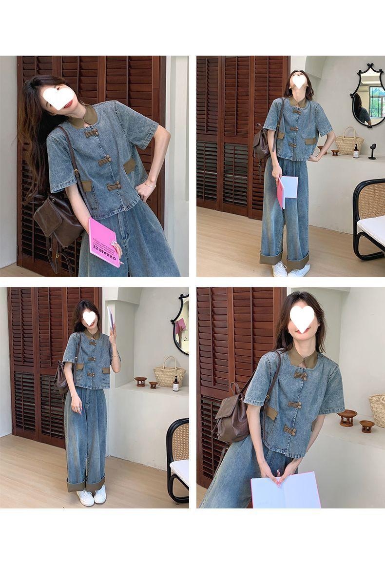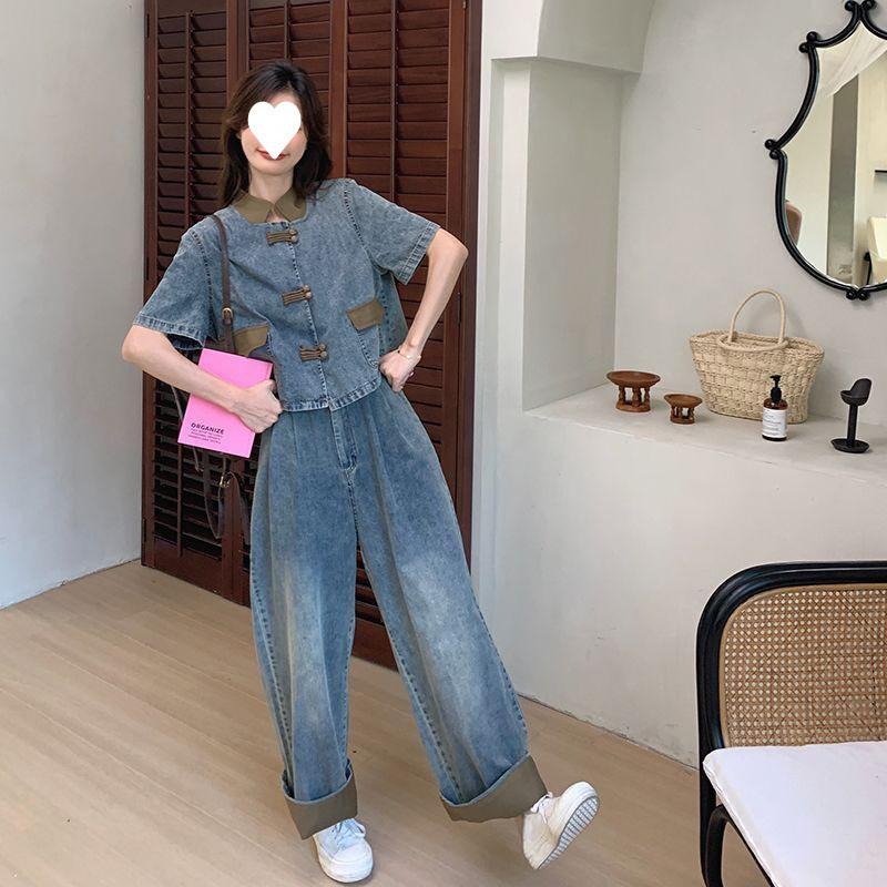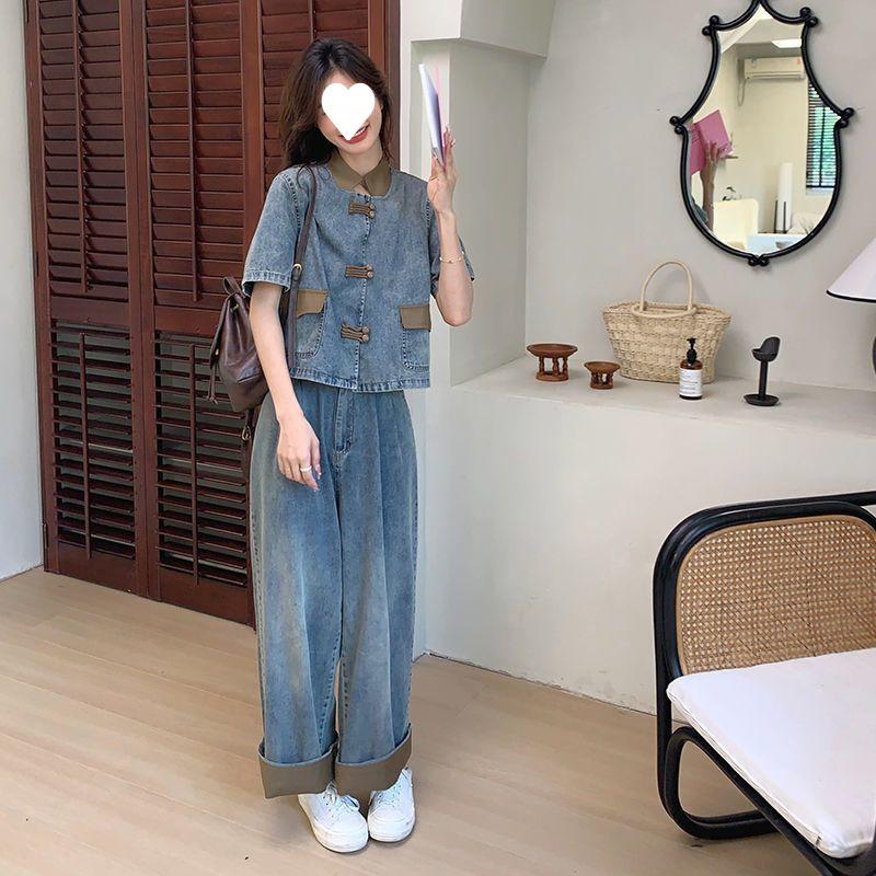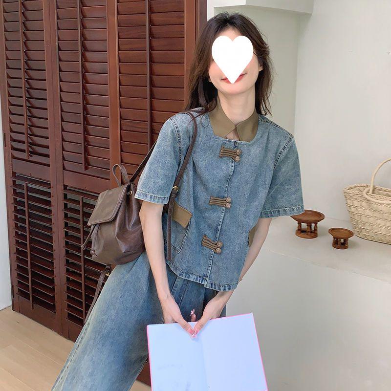 Traje de mezclilla estilo chino con hebilla, Verano 2024 Retro Nuevo Chaqueta corta, Pierna ancha de alta gama