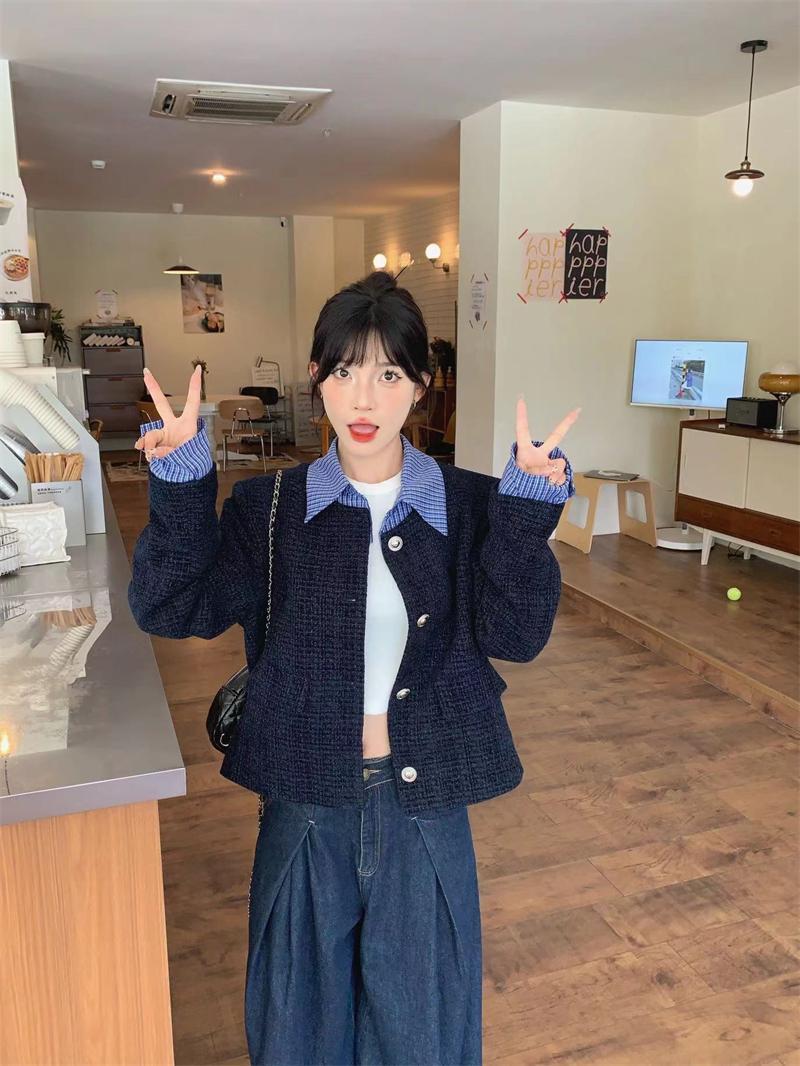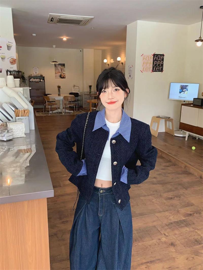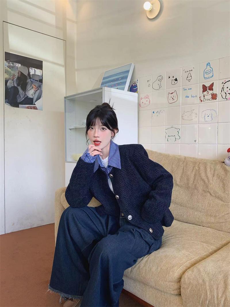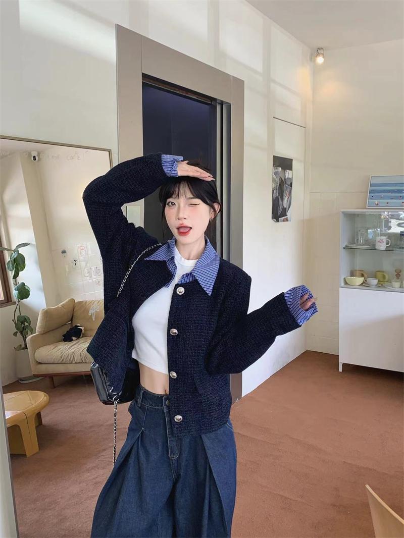 Otoño 2025 nuevo estilo coreano patchwork de dos piezas falsas cuello vuelto abrigo estilo pequeña fragancia top corto casual suelto para mujer