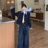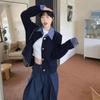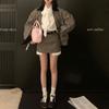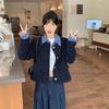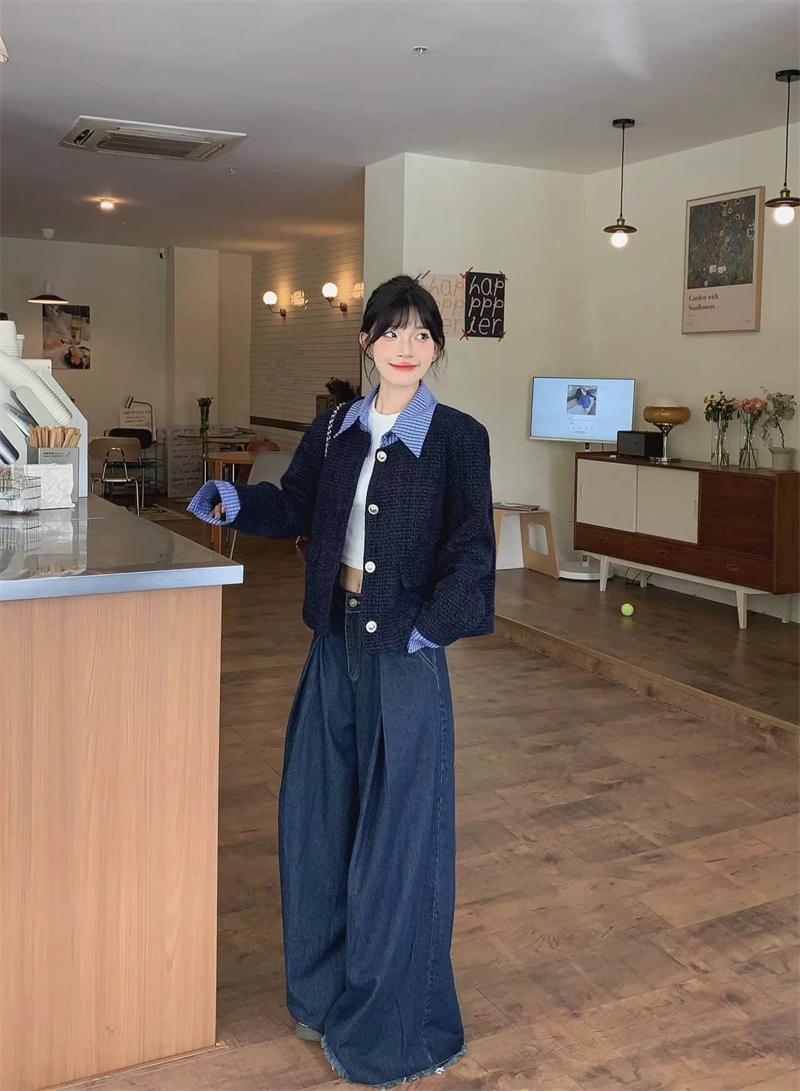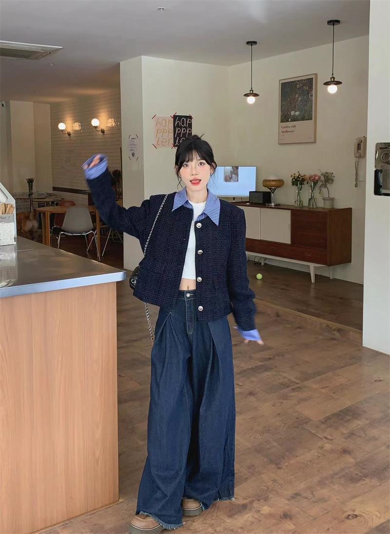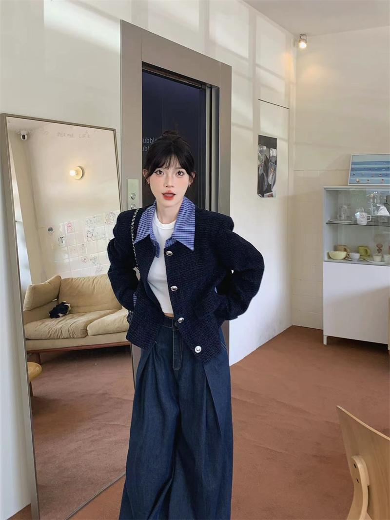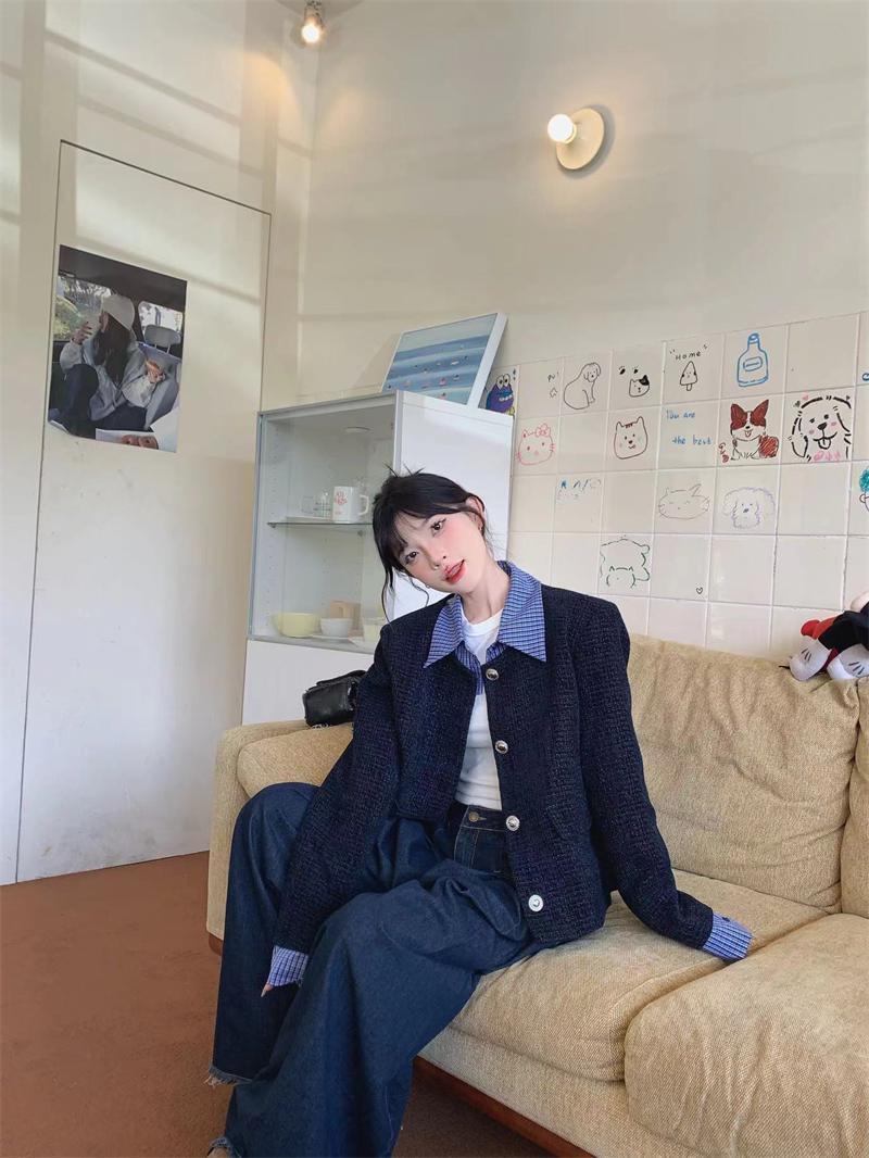Otoño 2025 nuevo estilo coreano patchwork de dos piezas falsas cuello vuelto abrigo estilo pequeña fragancia top corto casual suelto para mujer