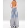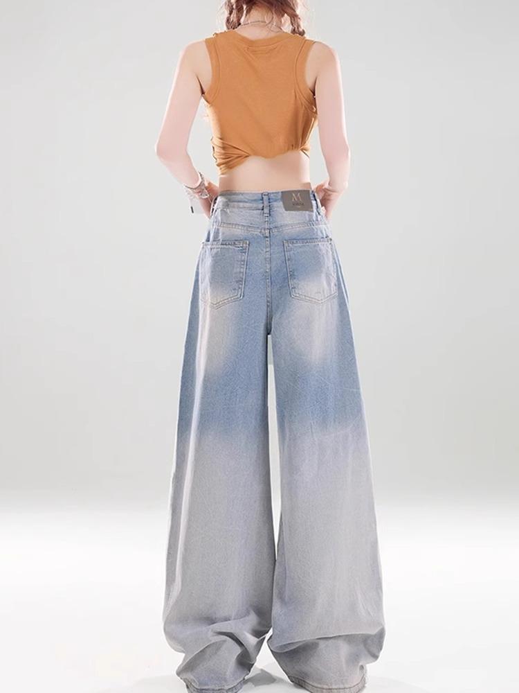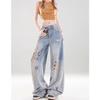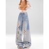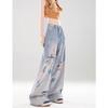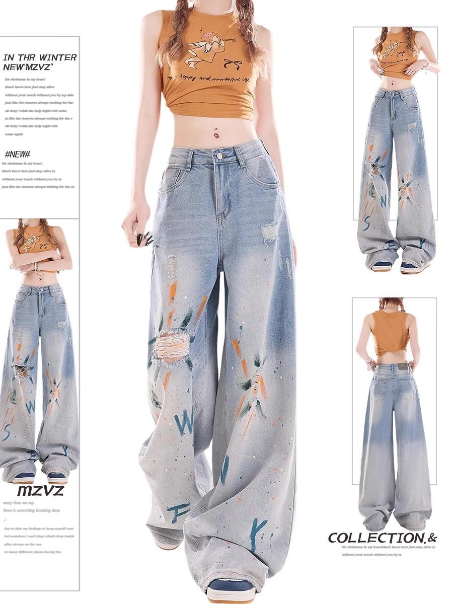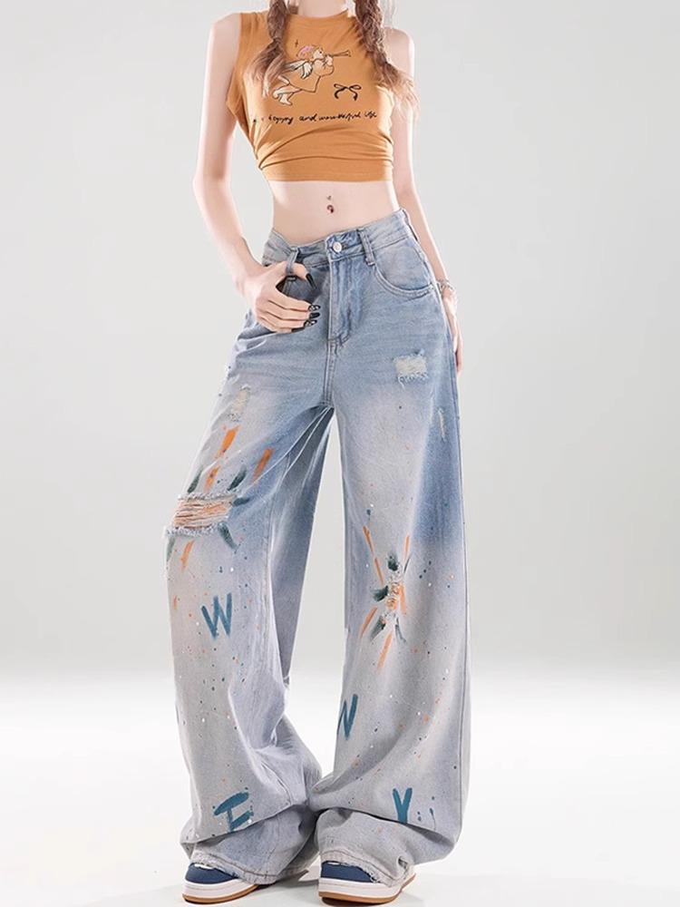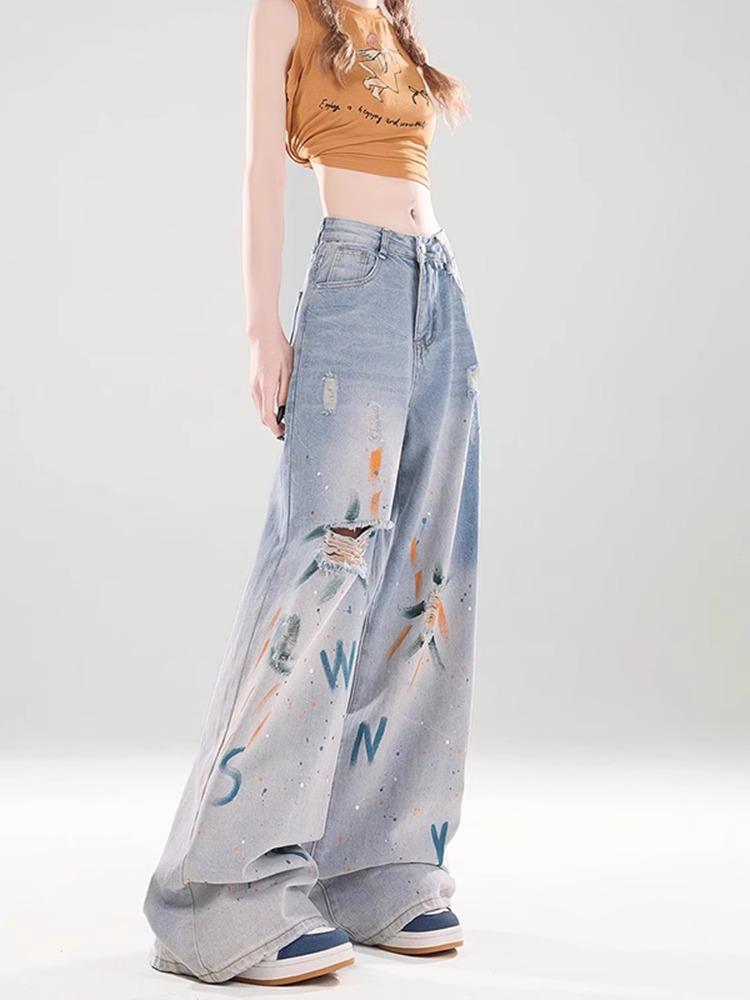 Jeans Rotos Graffiti Retro Americano Azul para Mujer Verano Cintura Alta Chica Hot Sueltos Rectos Pierna Ancha
