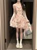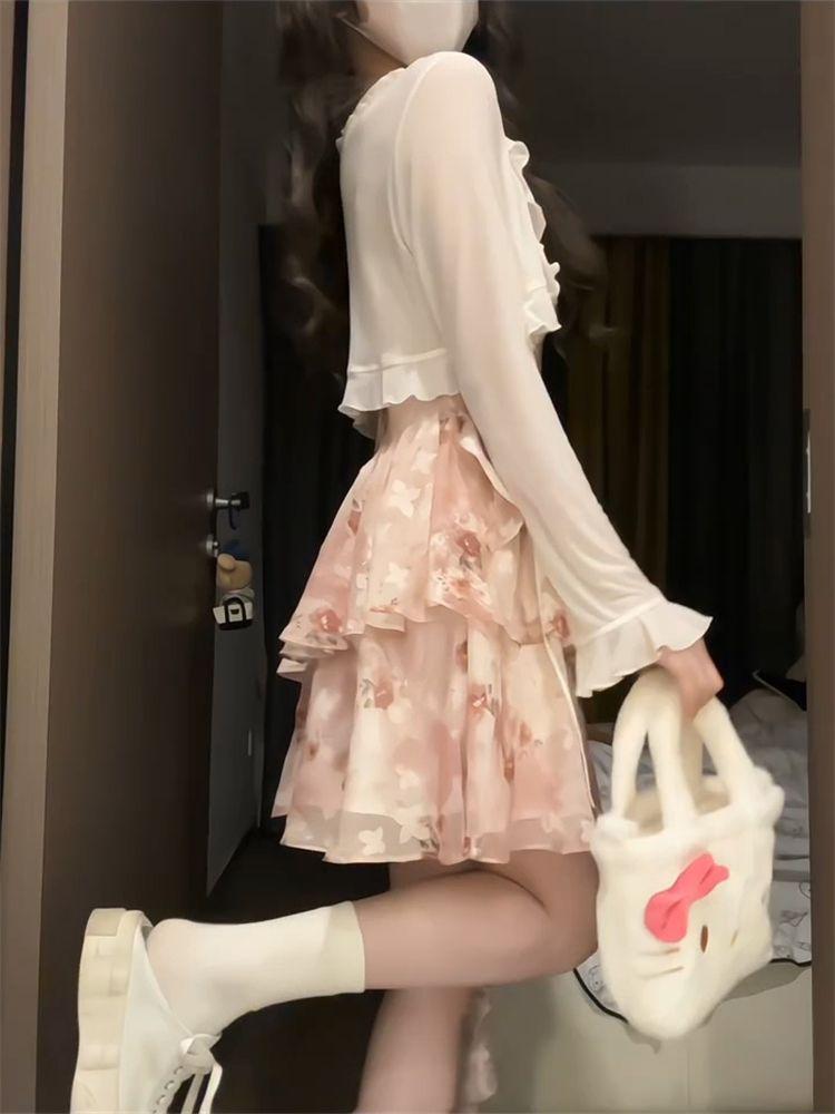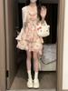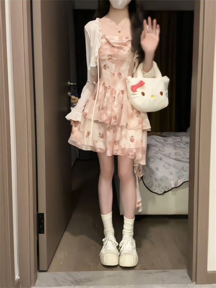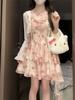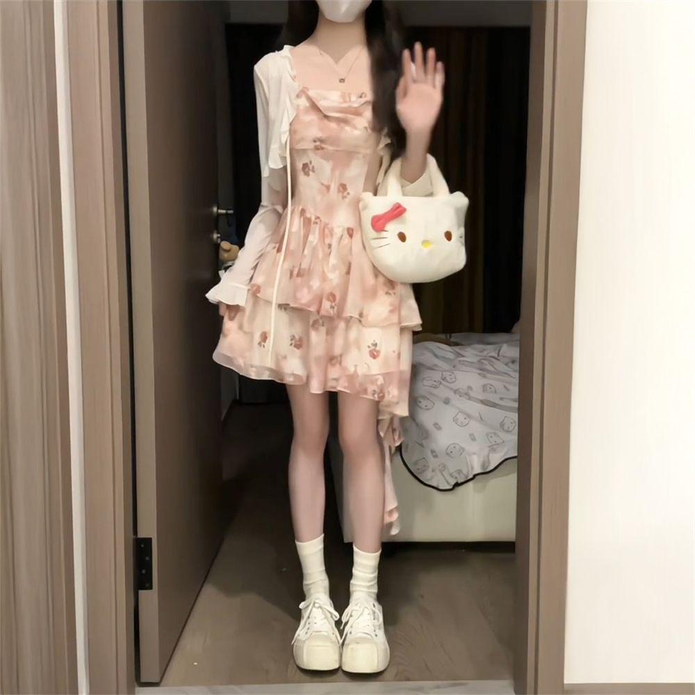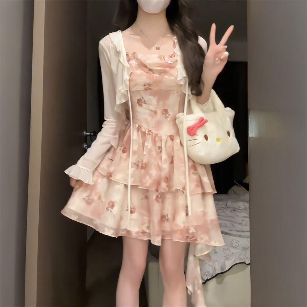 Vestido Irregular Floral con Tirantes de Primer Amor de Niña Dulce Combinado con Cárdigan Chal Tejido Conjunto de Dos Piezas