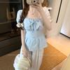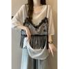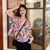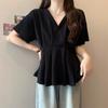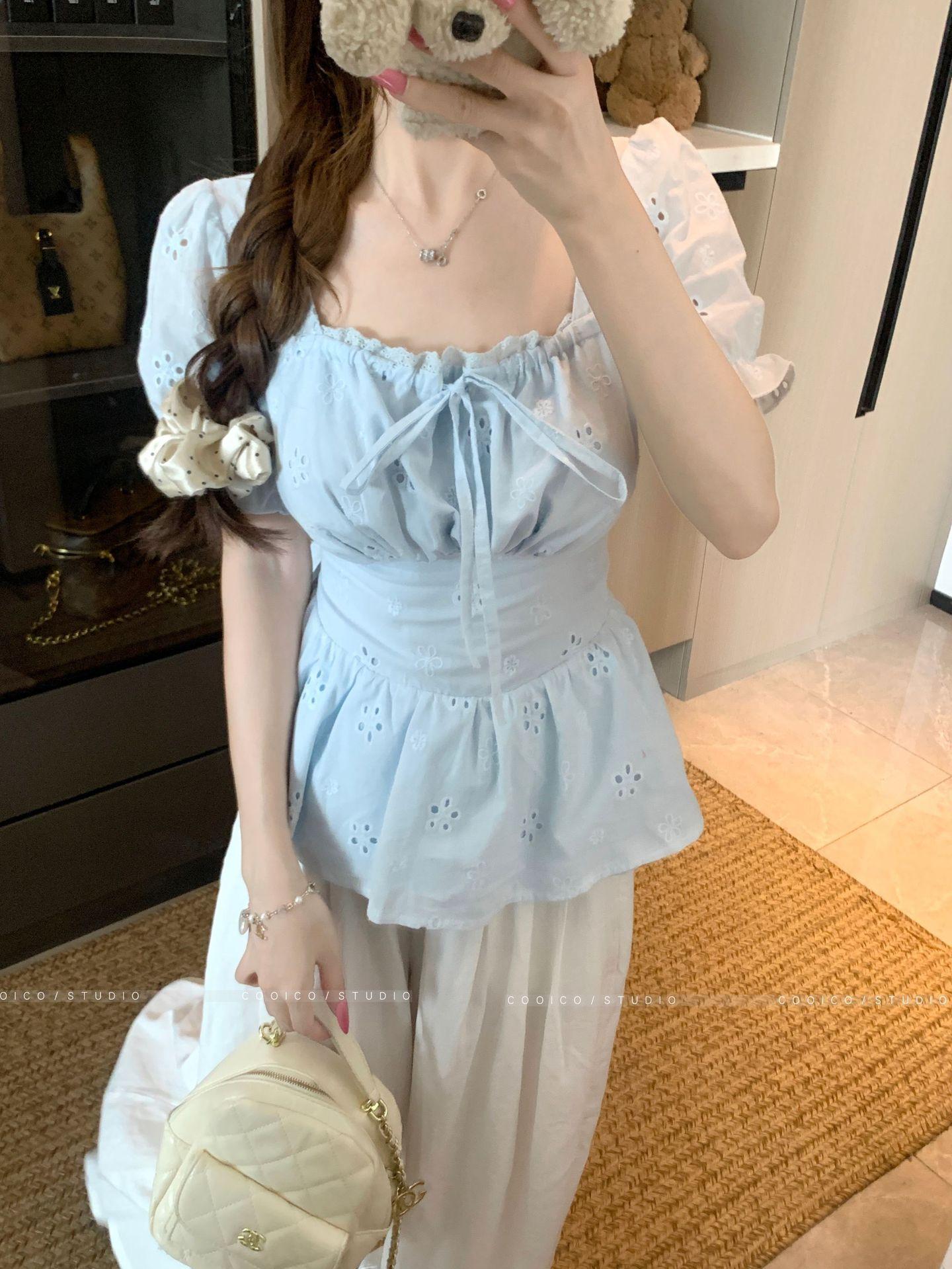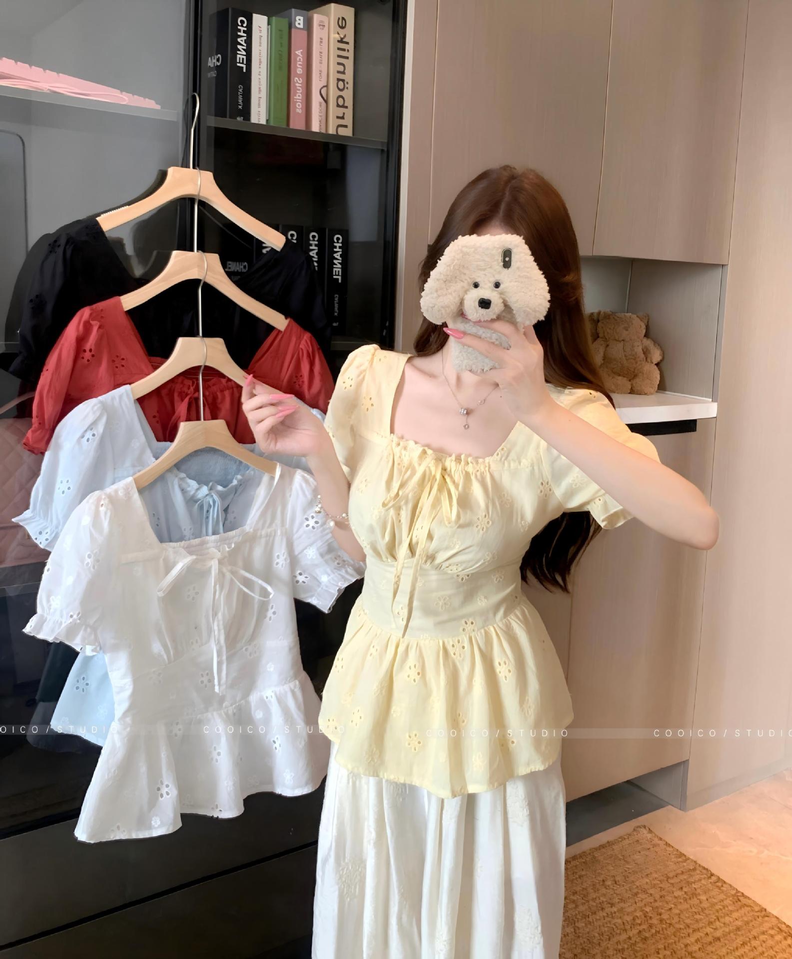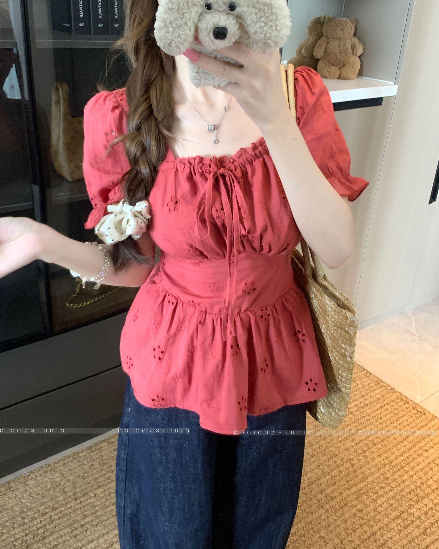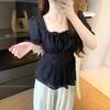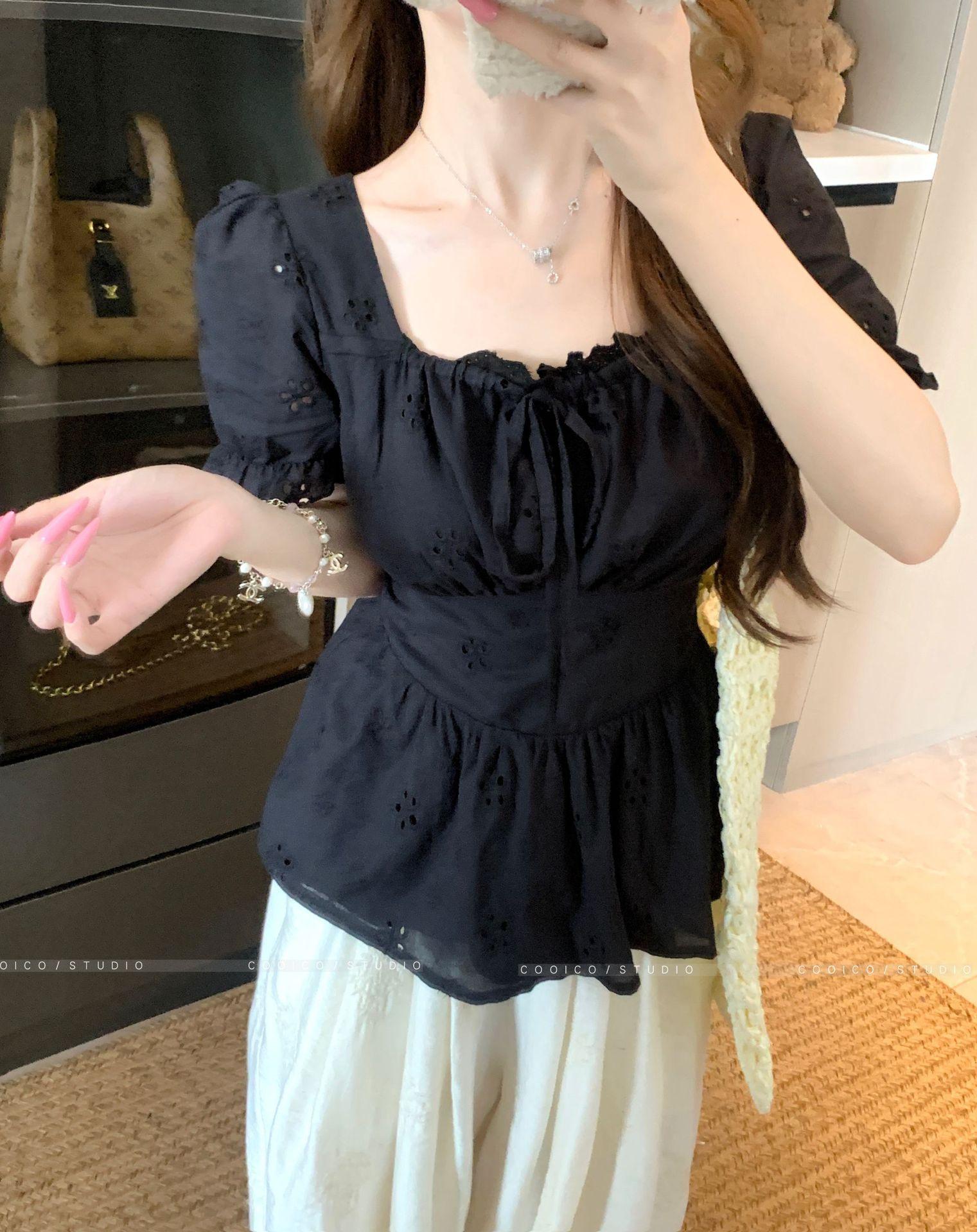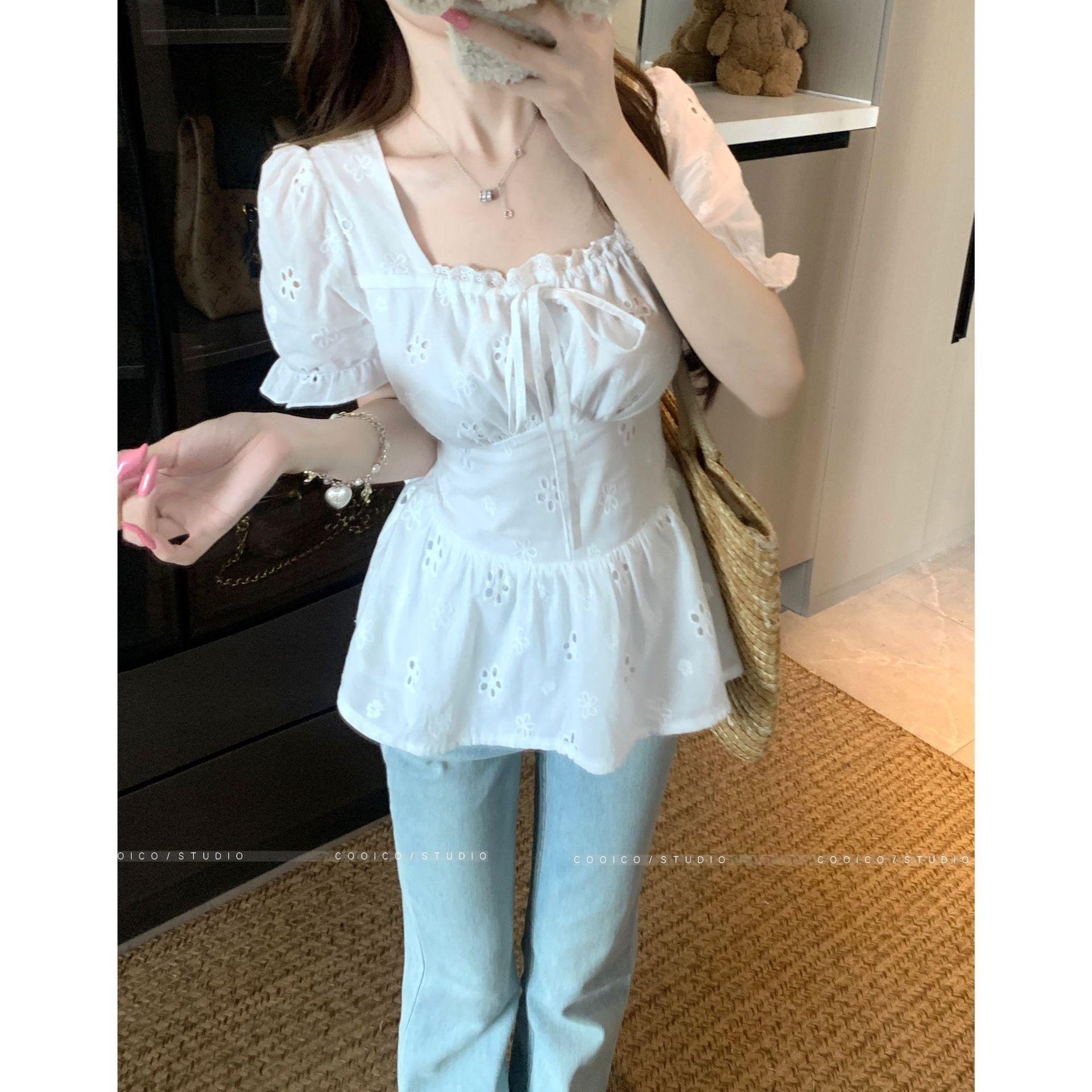 Talla Grande Camisa Francesa Dulce Cuello Cuadrado Calada Manga Corta para Mujer Verano Nueva MM Gorda Estilo Suave Top Adelgazante