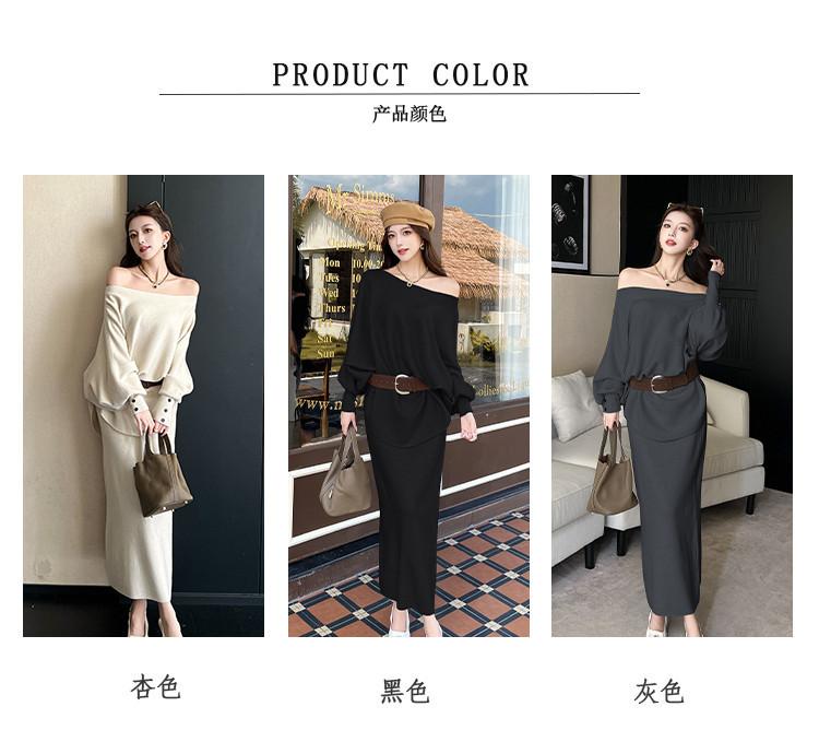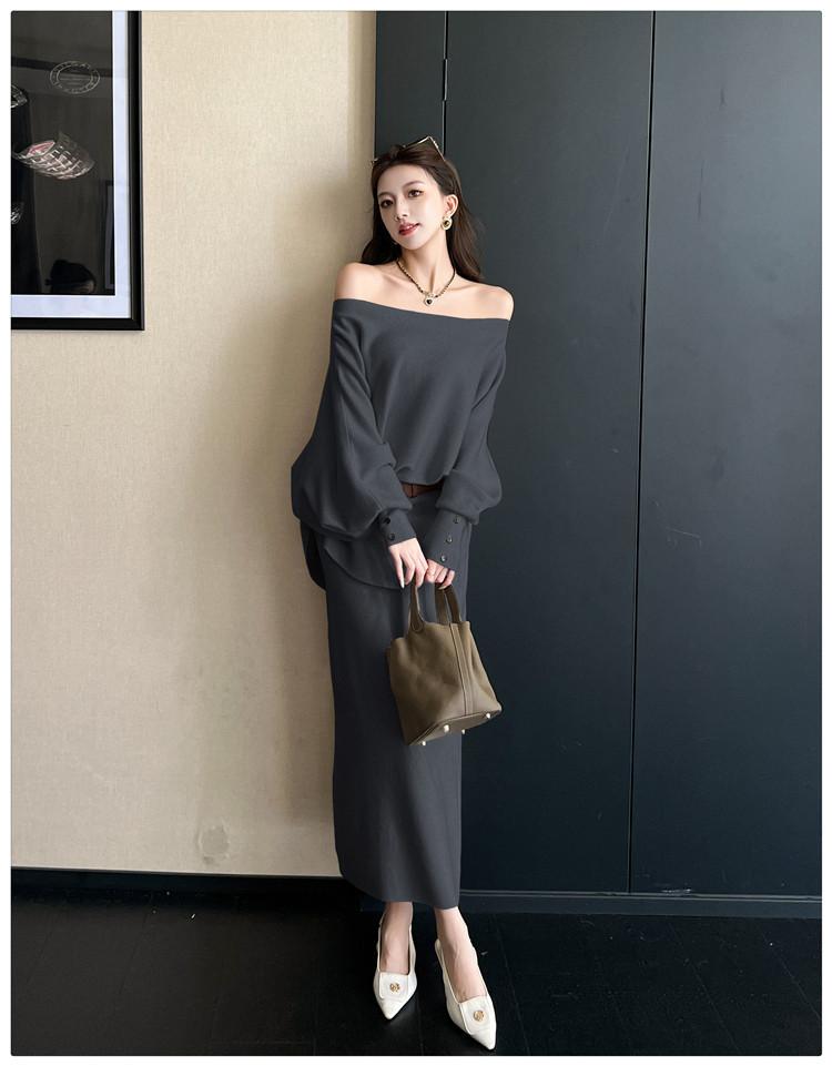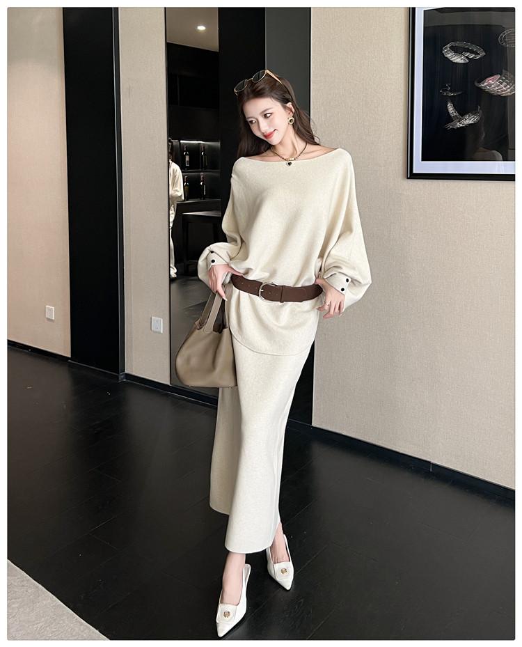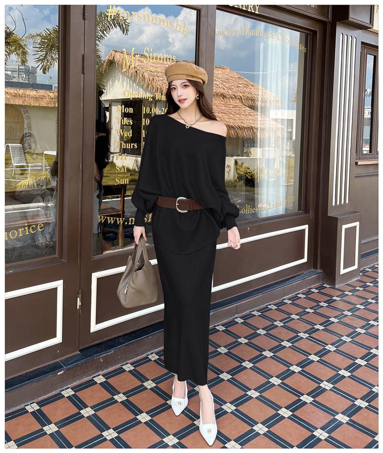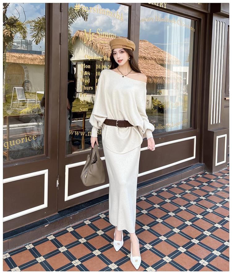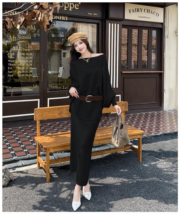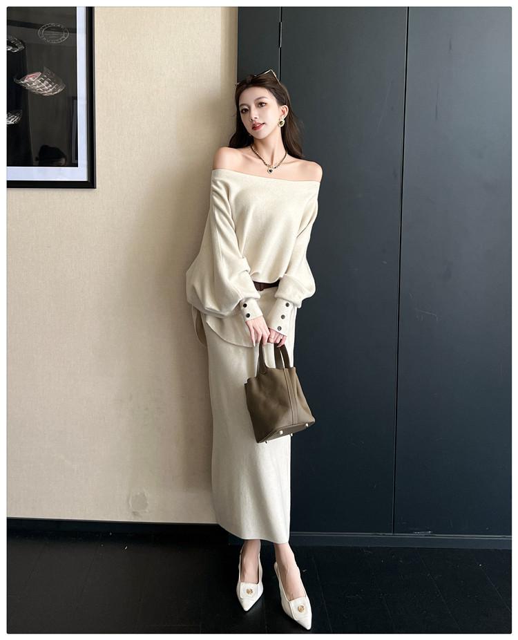 Conjunto de Suéter Versátil Adelgazante de Temperamento Francés Otoñal Transfronterizo 2025 + Falda Midi Coreana con Abertura de Cintura Alta