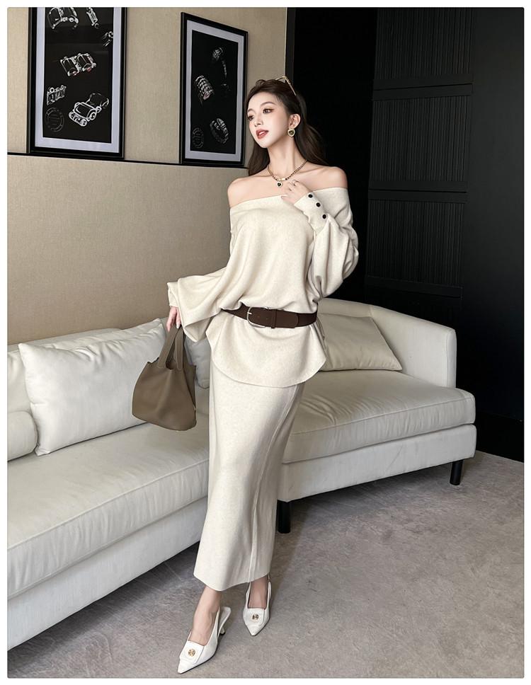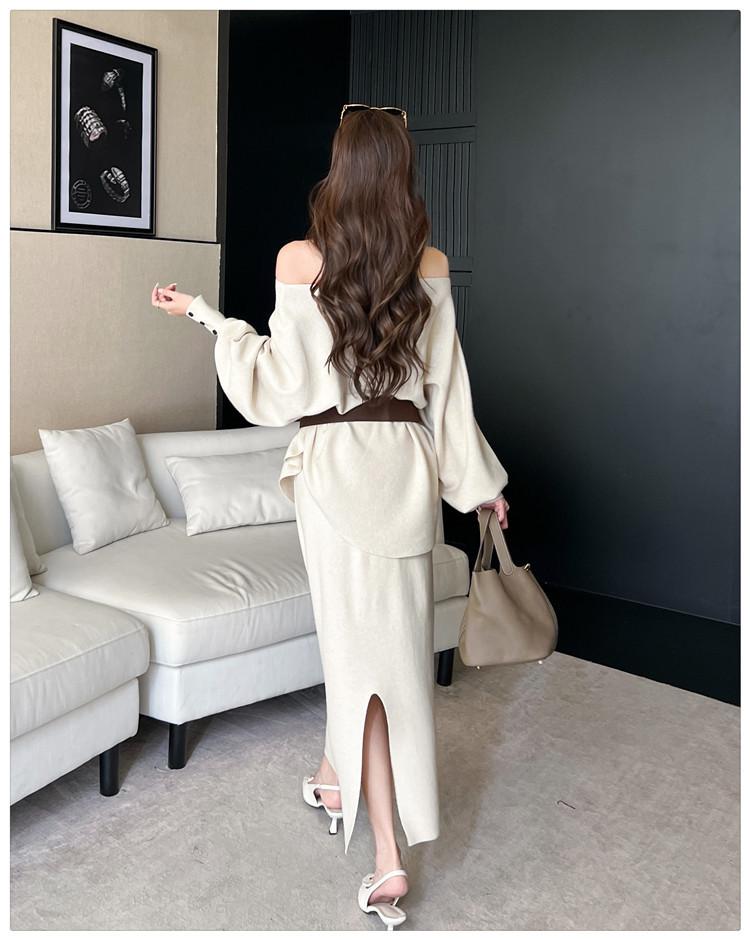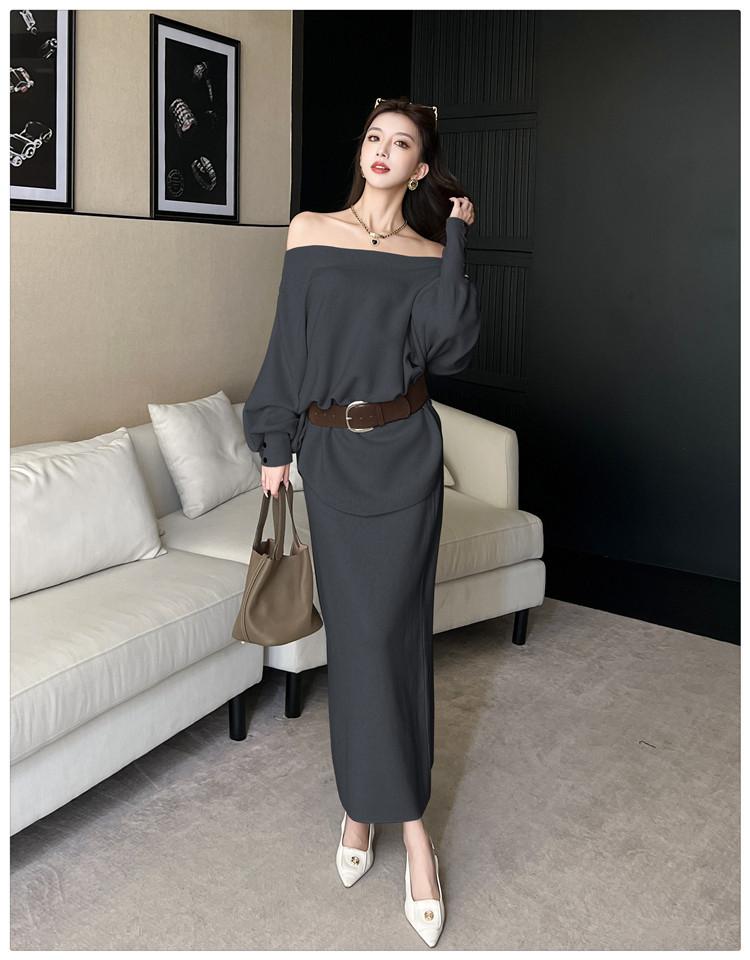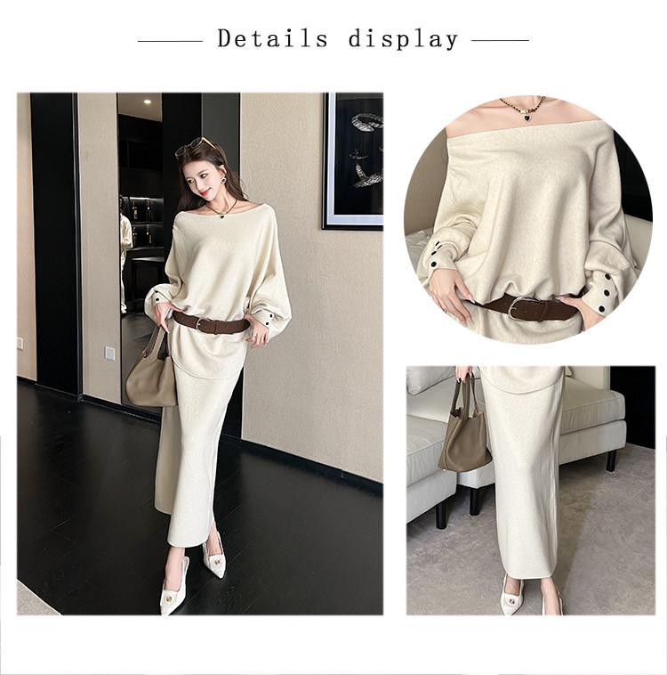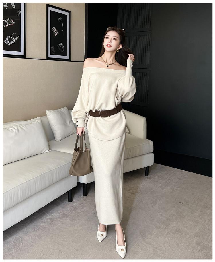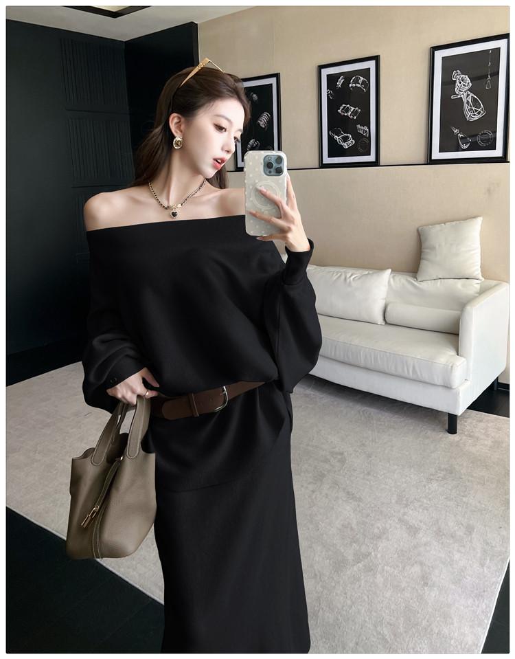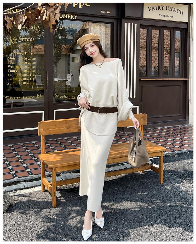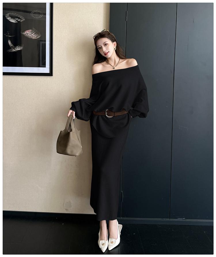 Conjunto de Suéter Versátil Adelgazante de Temperamento Francés Otoñal Transfronterizo 2025 + Falda Midi Coreana con Abertura de Cintura Alta