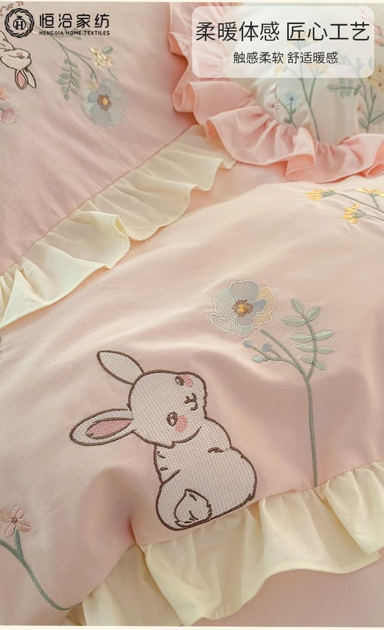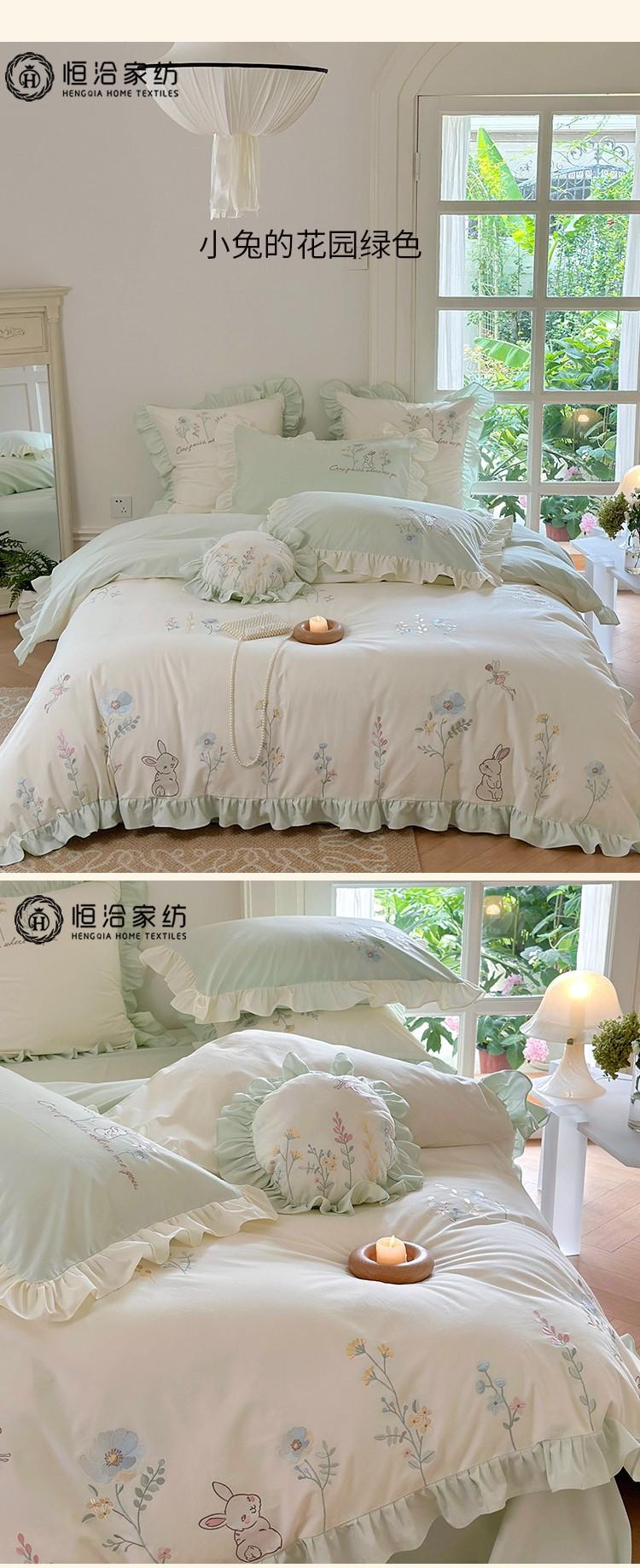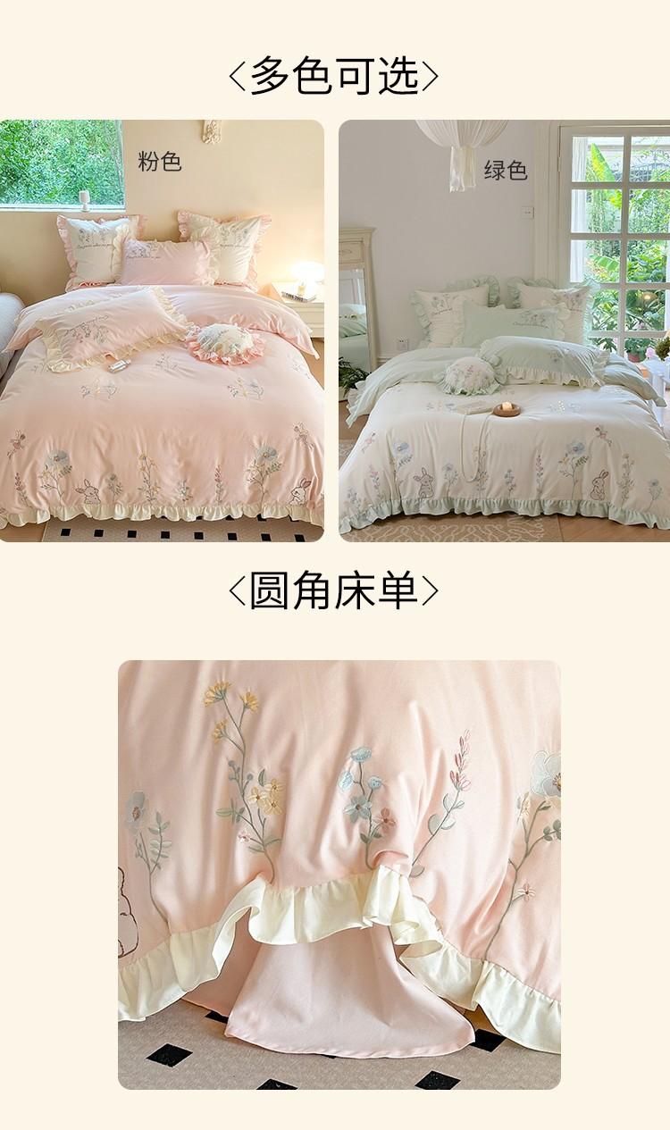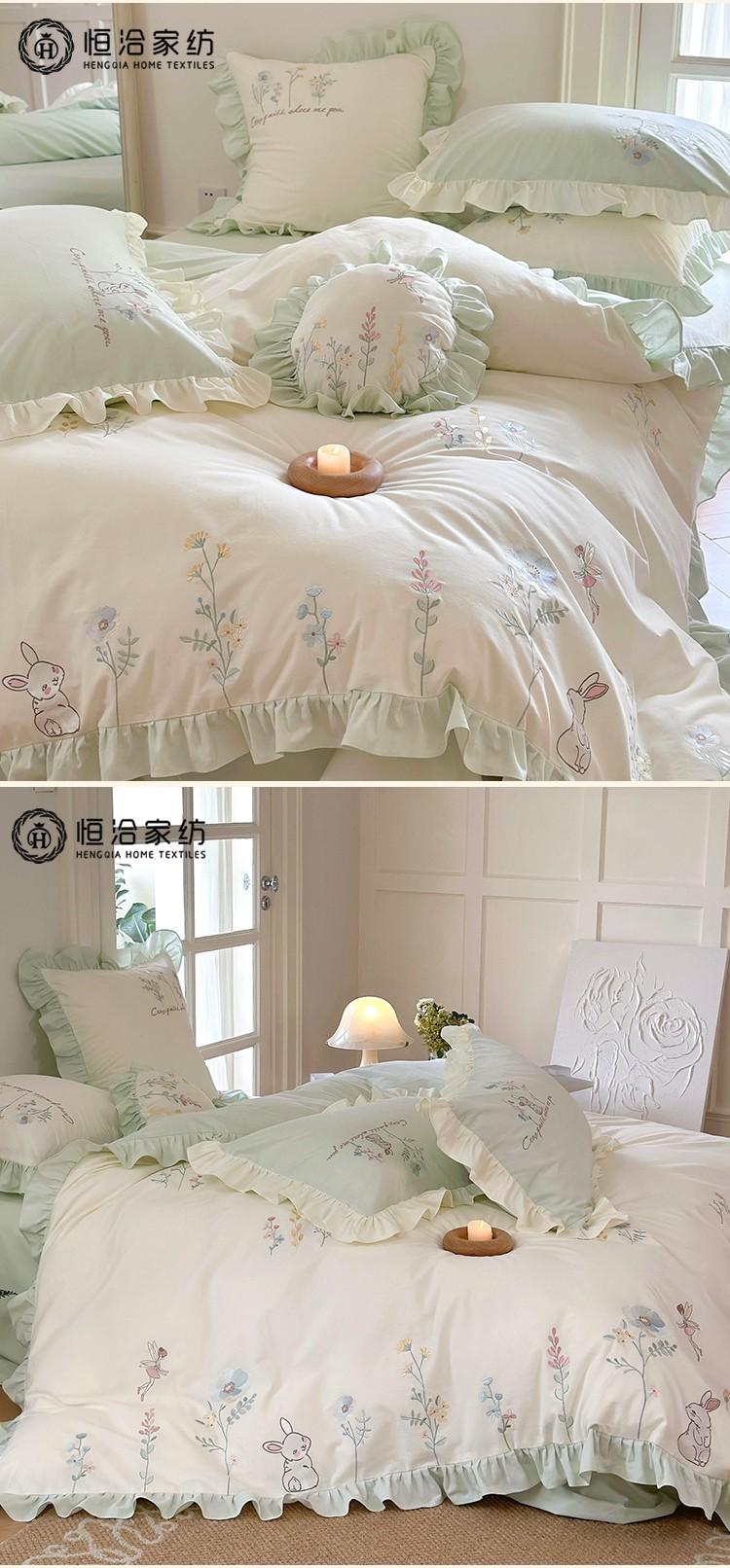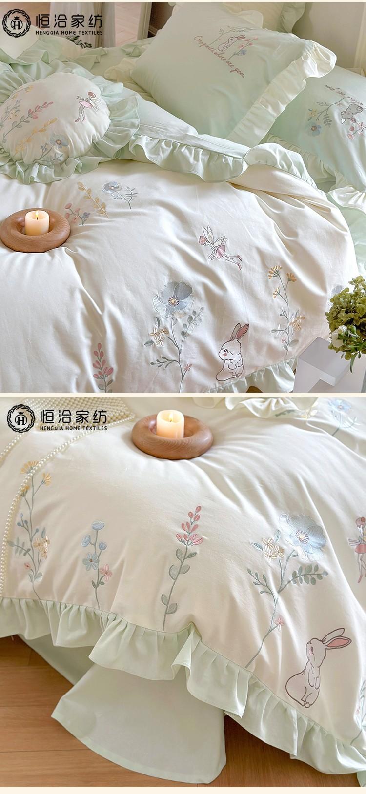 Conjunto de cuatro piezas de franela de algodón para niña de otoño e invierno, algodón puro engrosado, bordado de conejito, encaje, funda nórdica, ropa de cama, verde