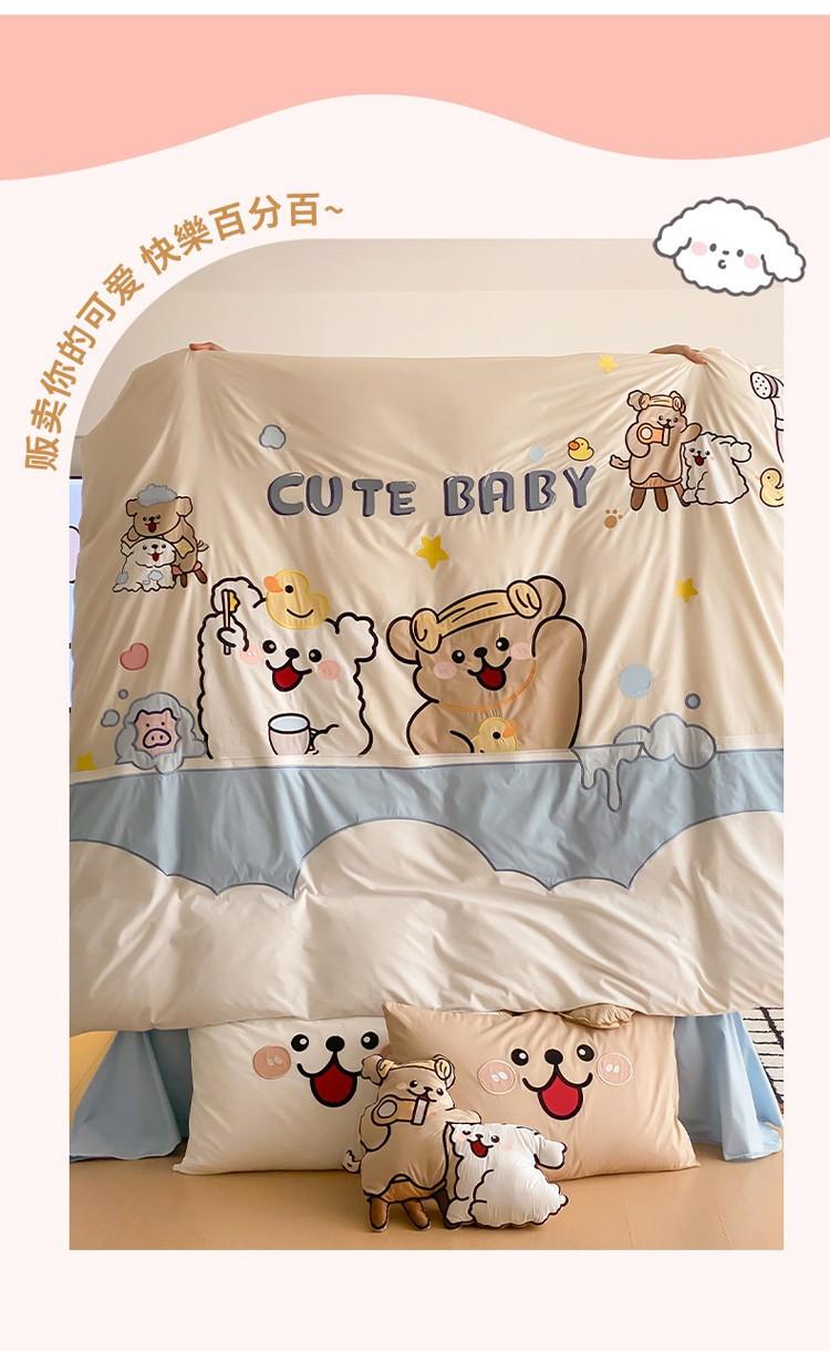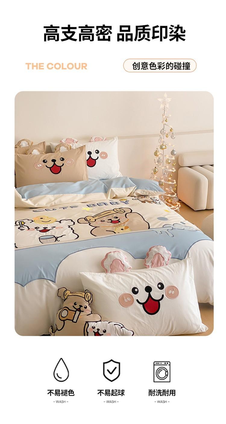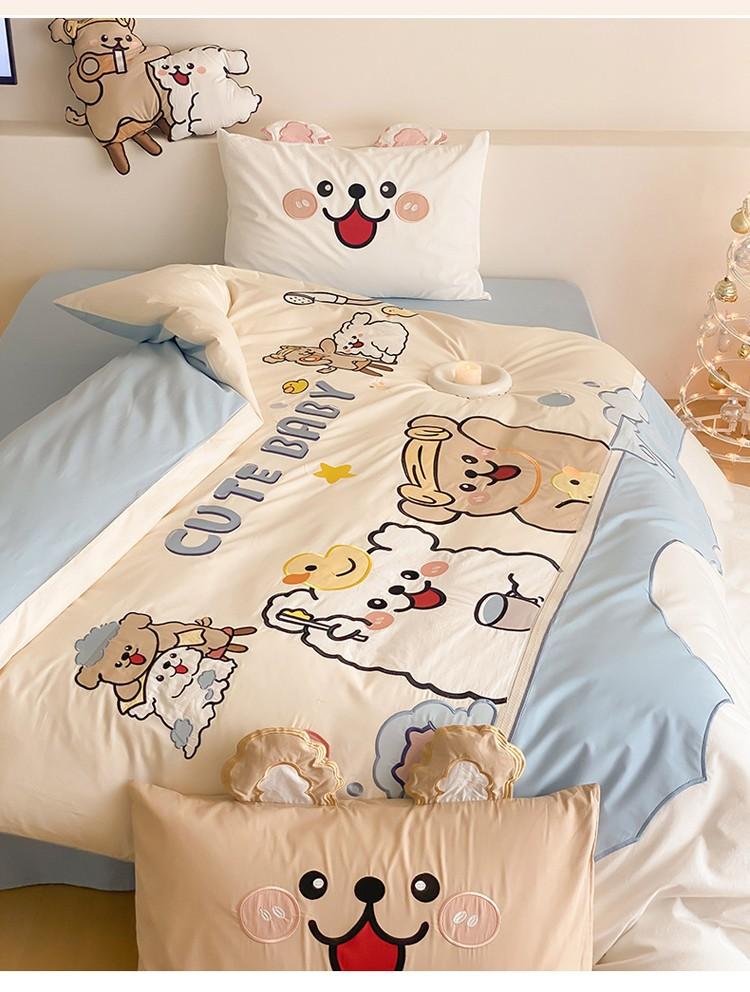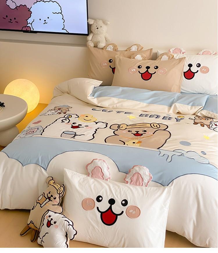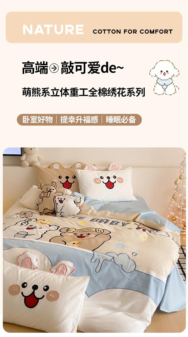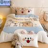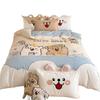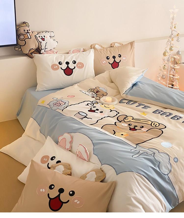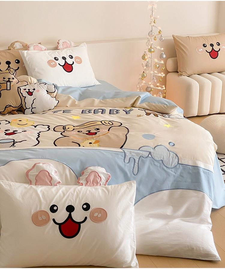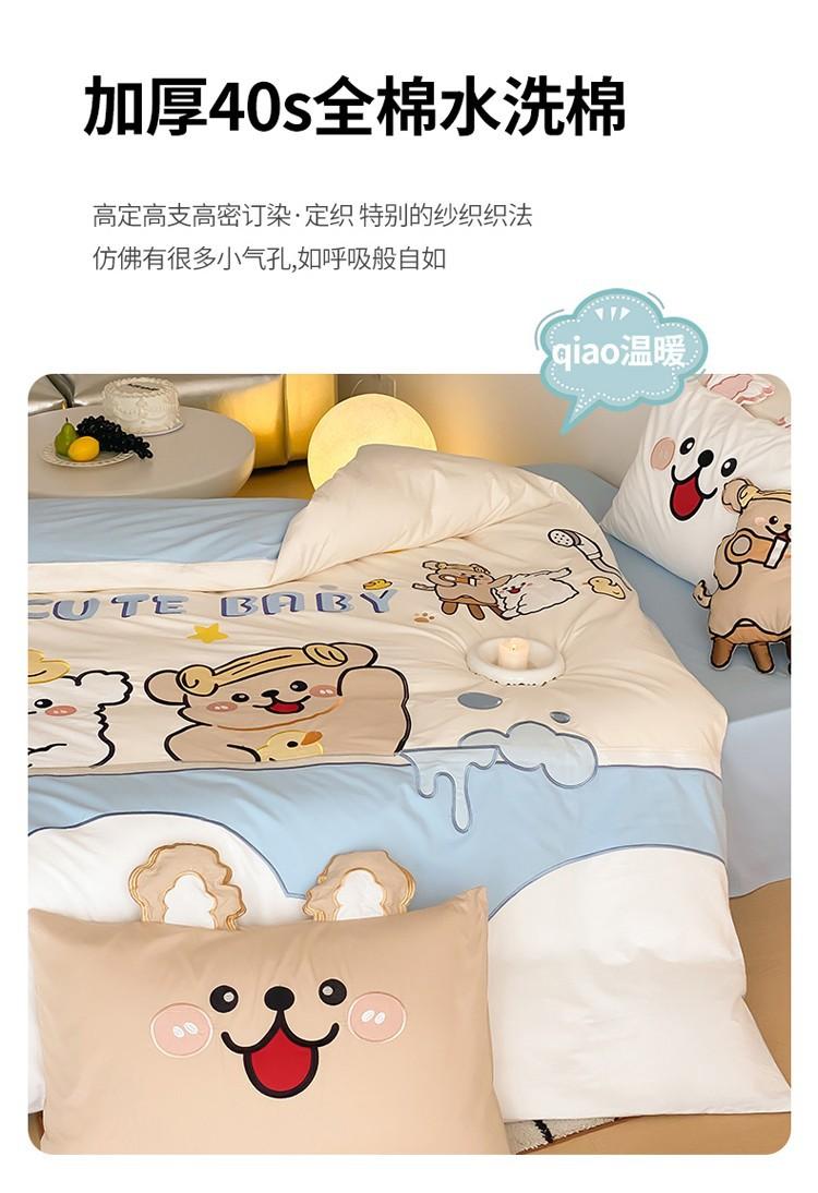 Juego de cuatro piezas de algodón puro engrosado Clase A, algodón lavado, bordado de oso de dibujos animados, lindo, funda de edredón, sábana, ropa de cama 1.2 niños