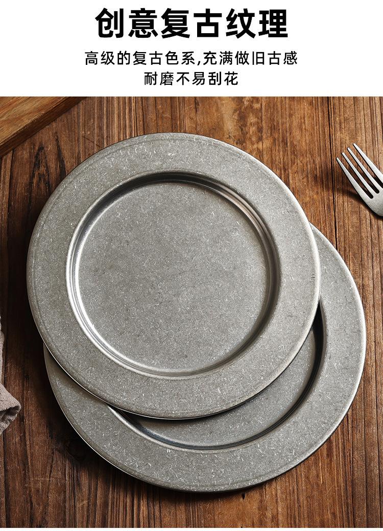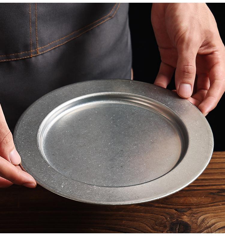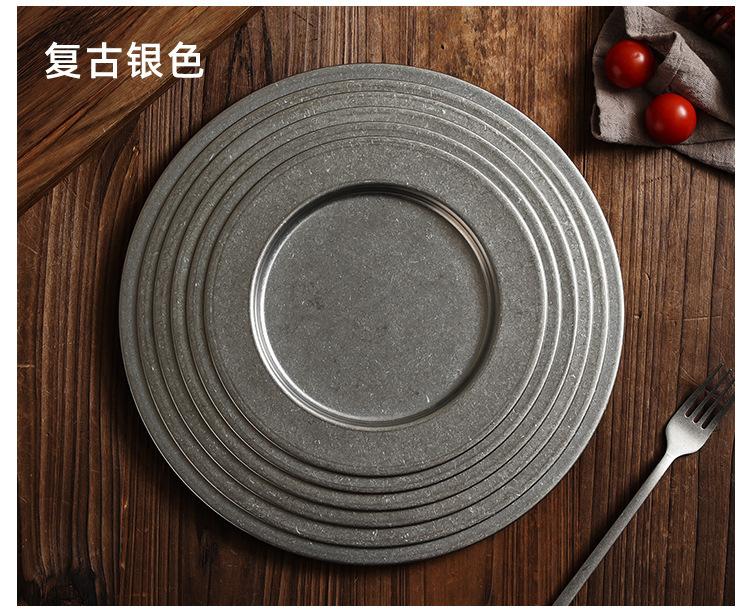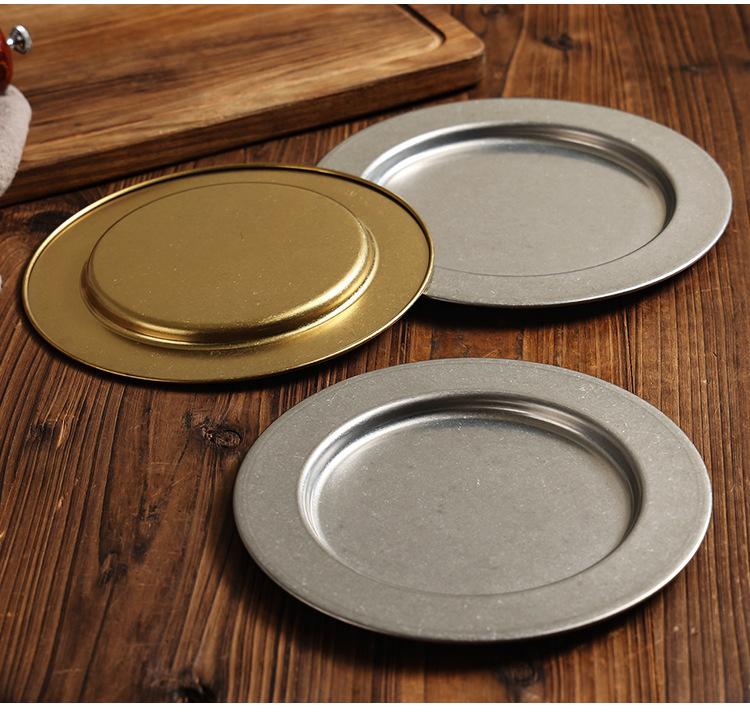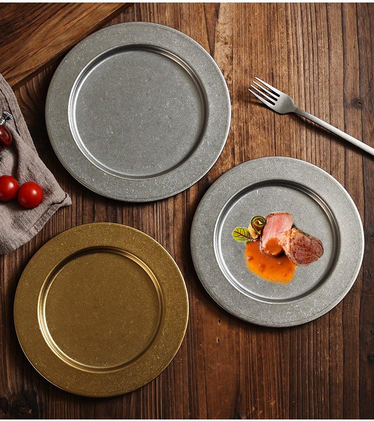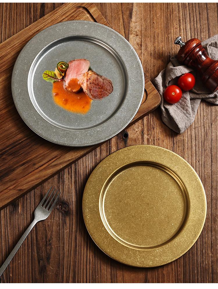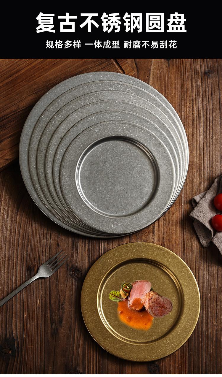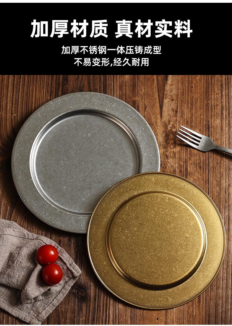 Plato Redondo Retro de Acero Inoxidable Dorado Plato para Bistec Plato para Barbacoa Plato para Cena Plato para Pizza Plato Hondo para Comida Occidental Bandeja Plana para Buffet