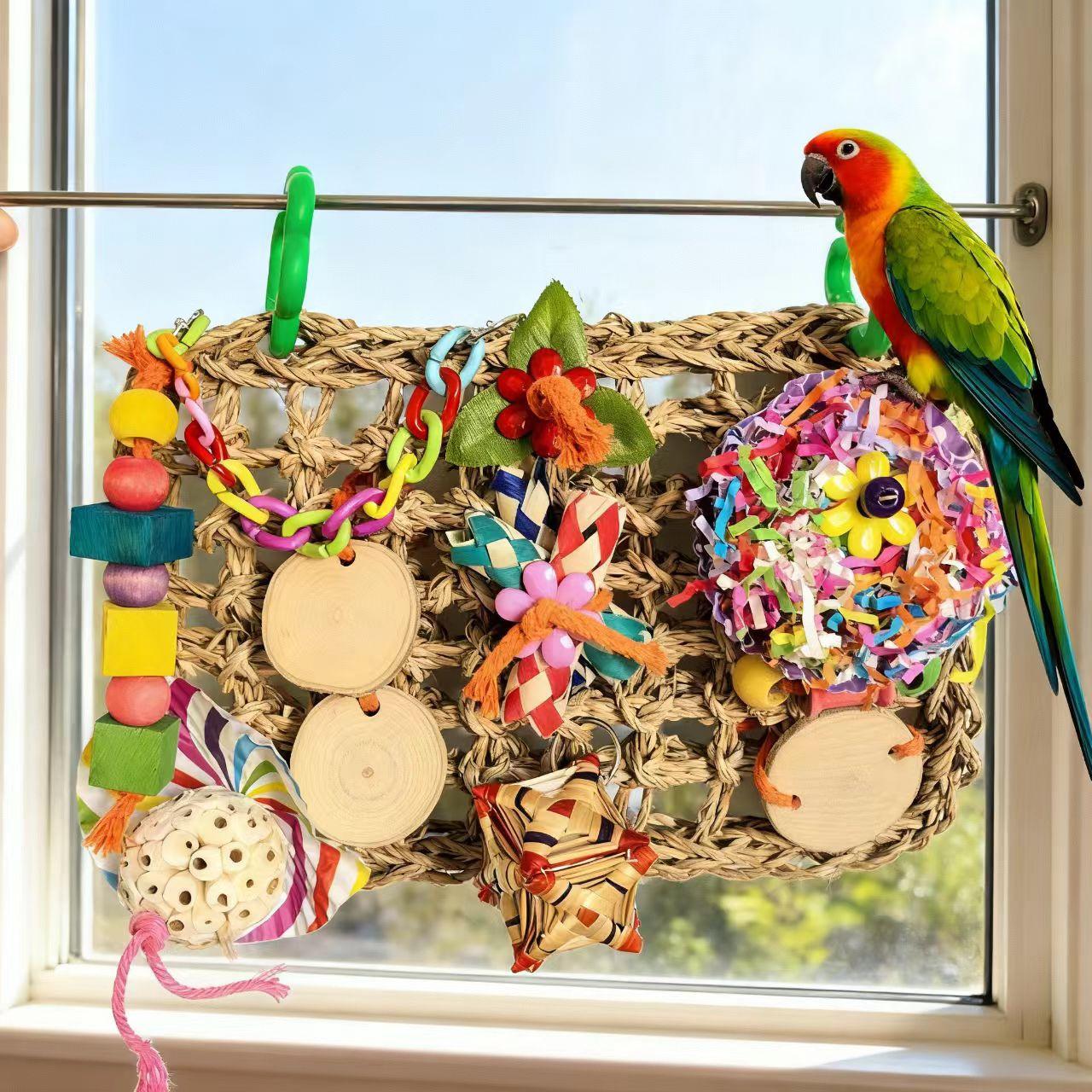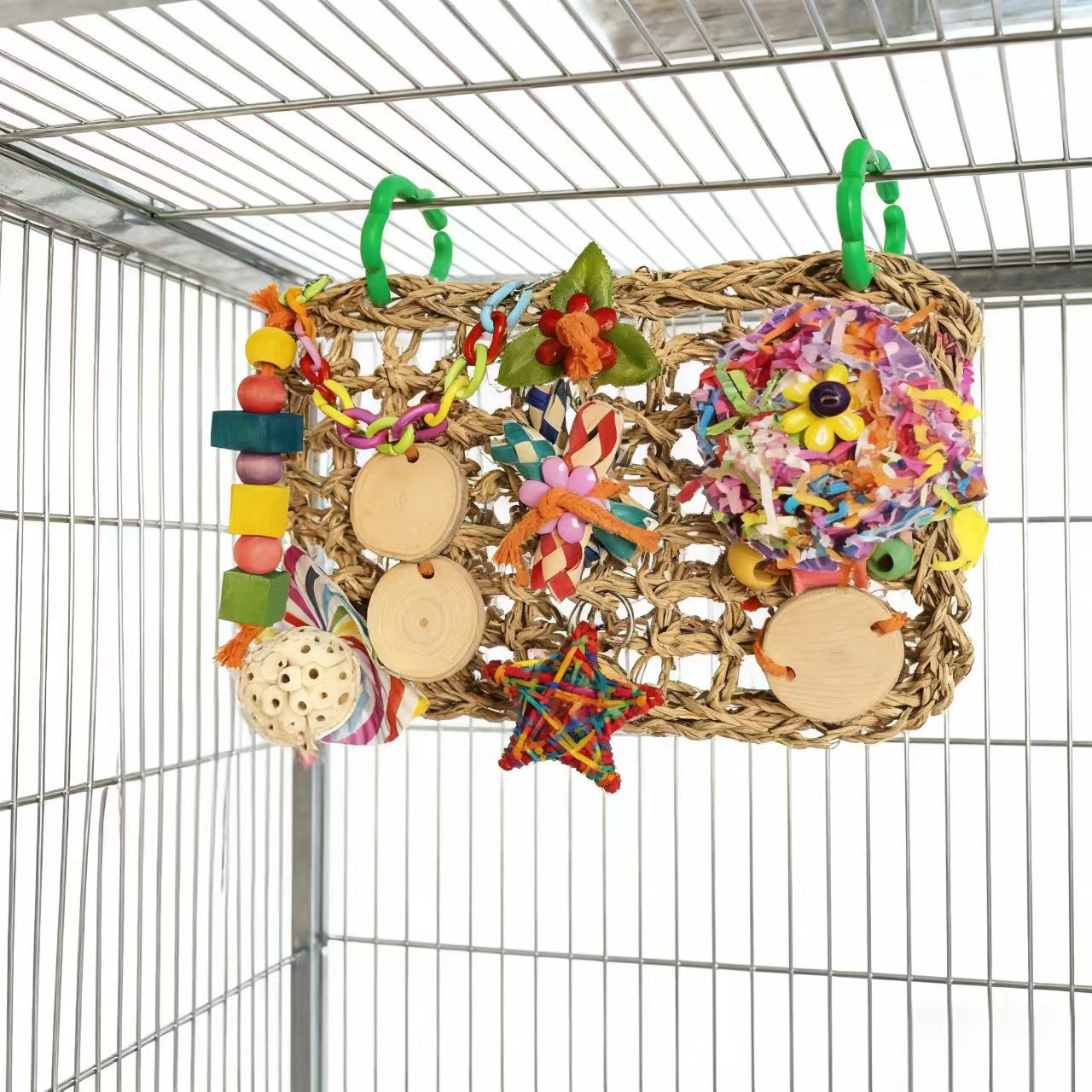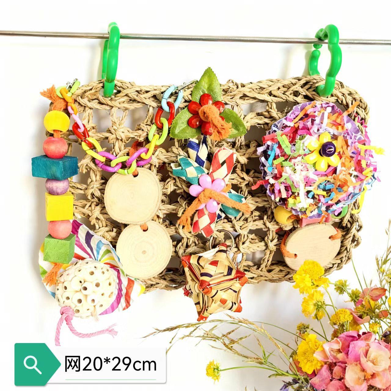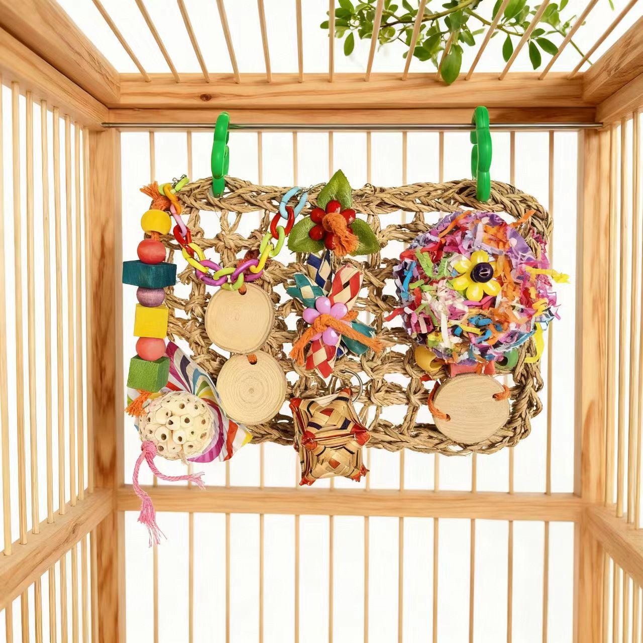 Juguetes para loros, suministros para pájaros, redes de hierba acuática, pelotas para morder, tubos tejidos, redes de escalada de alambre de papel, redes de juego, molienda de pico y alivio del aburrimiento