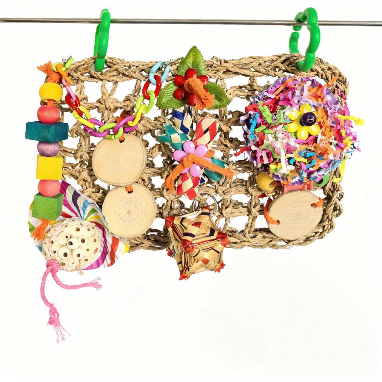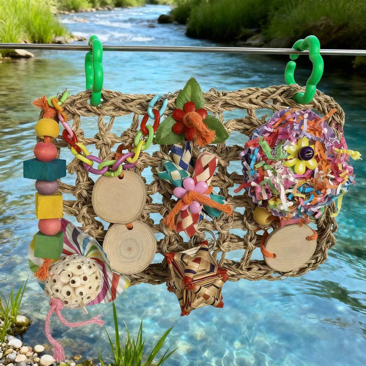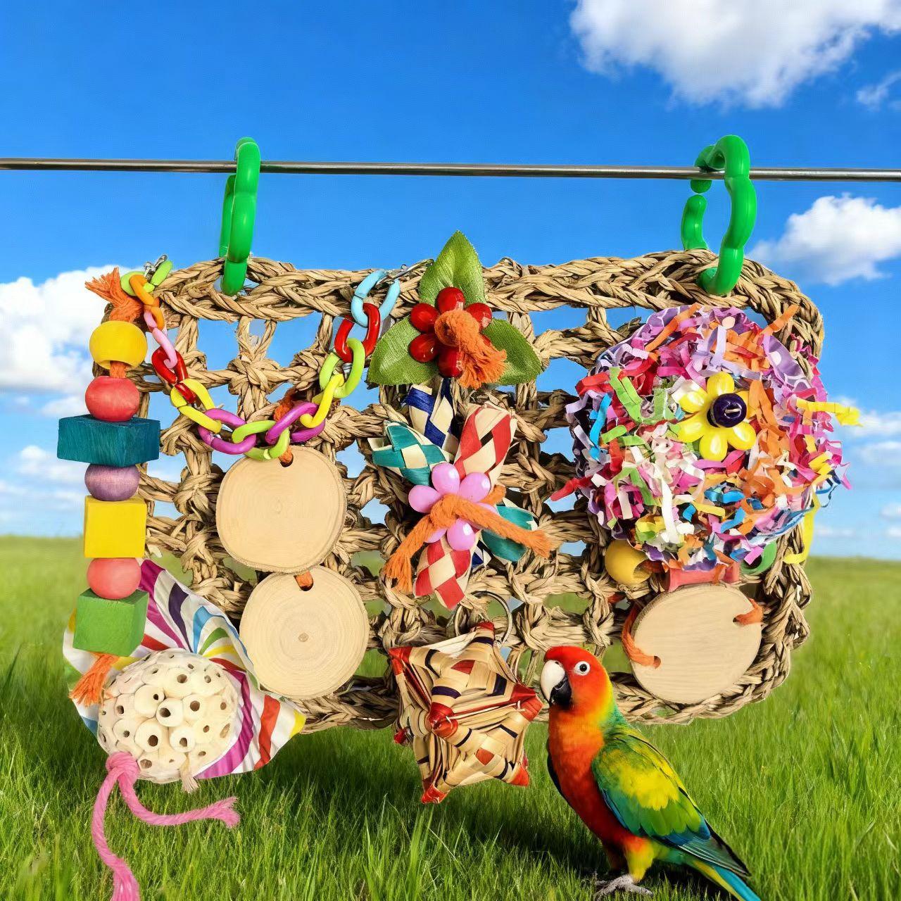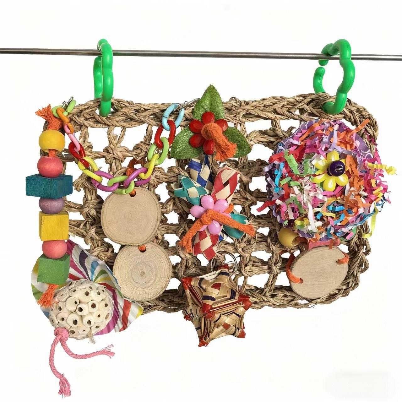 Juguetes para loros, suministros para pájaros, redes de hierba acuática, pelotas para morder, tubos tejidos, redes de escalada de alambre de papel, redes de juego, molienda de pico y alivio del aburrimiento