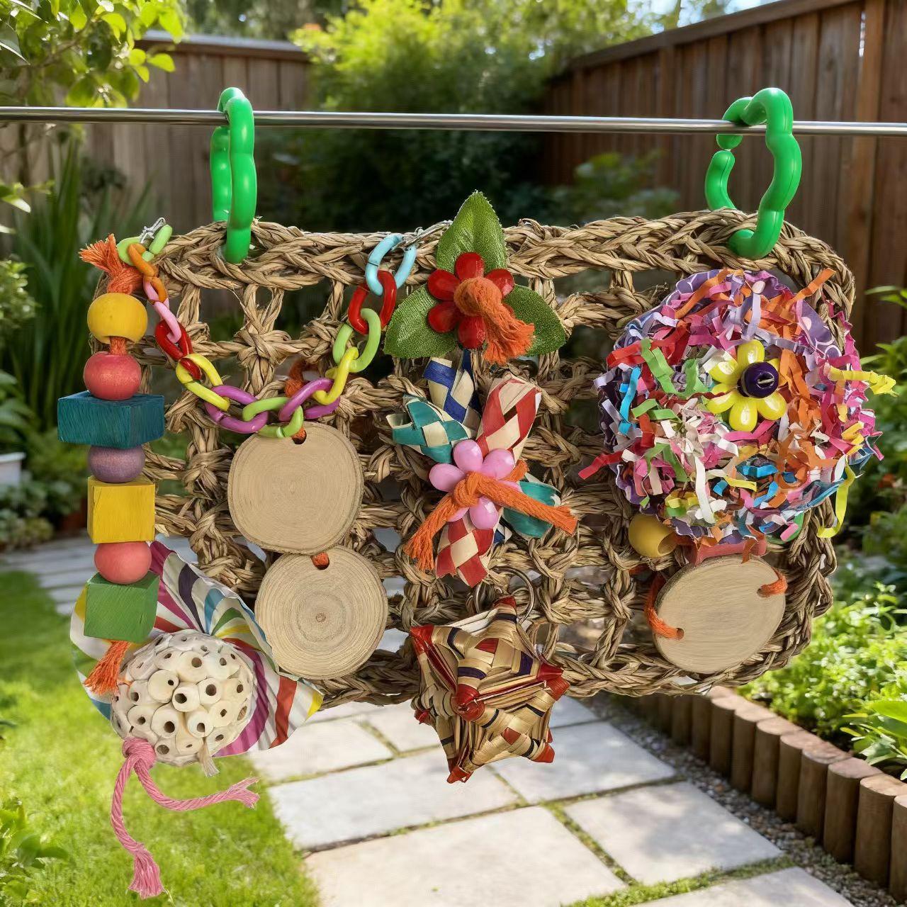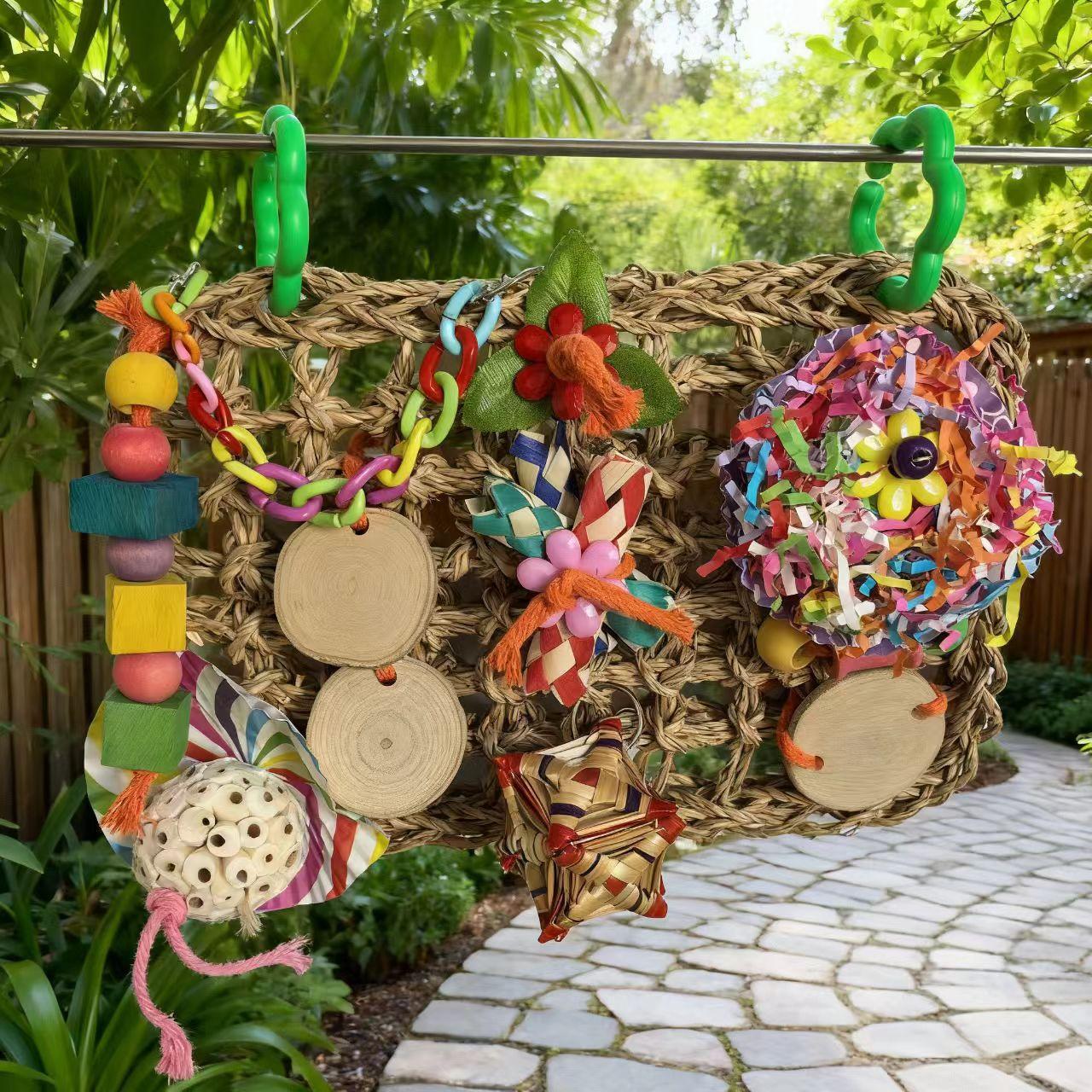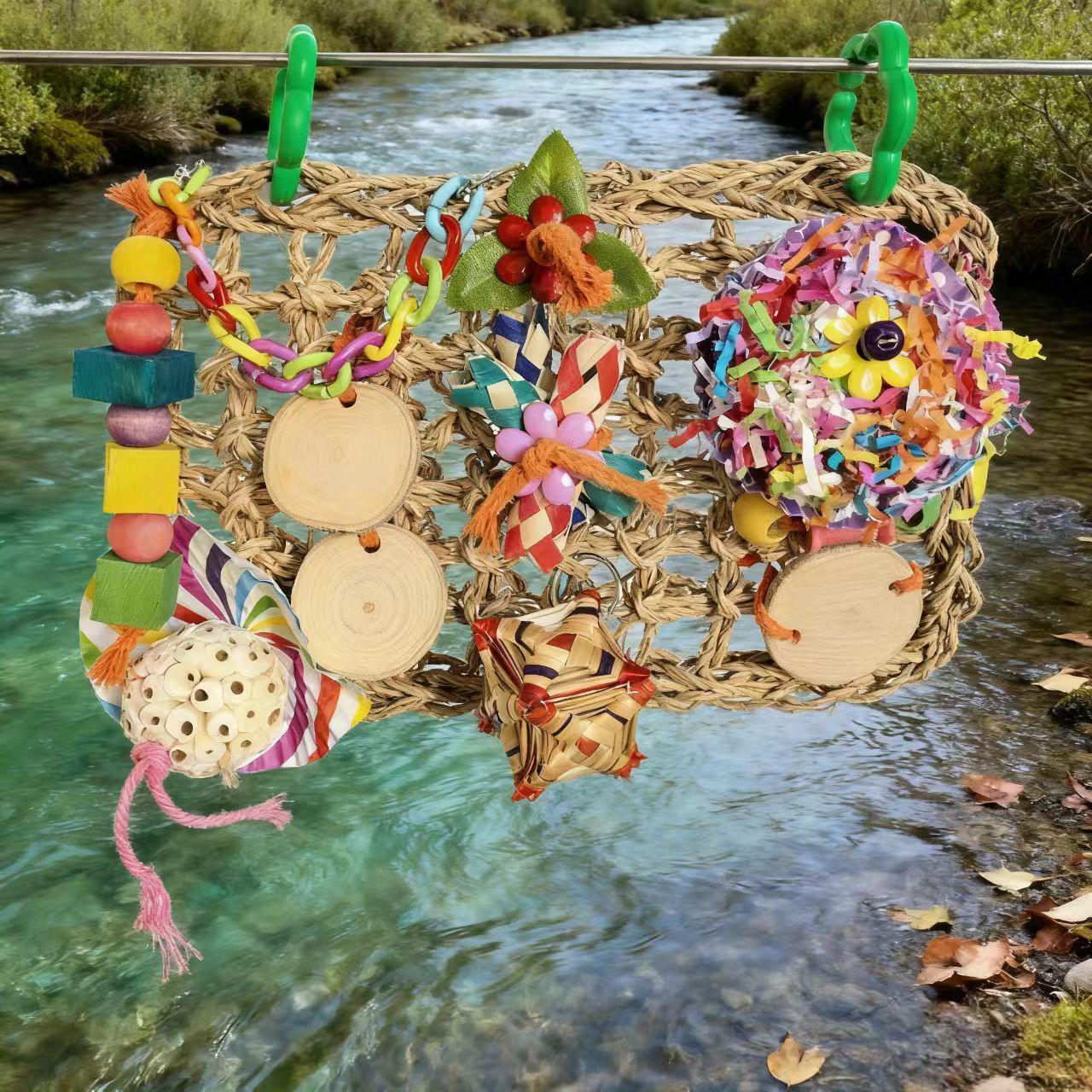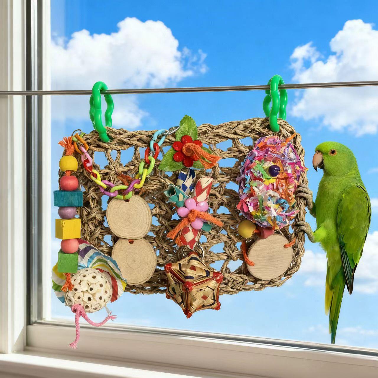 Juguetes para loros, suministros para pájaros, redes de hierba acuática, pelotas para morder, tubos tejidos, redes de escalada de alambre de papel, redes de juego, molienda de pico y alivio del aburrimiento