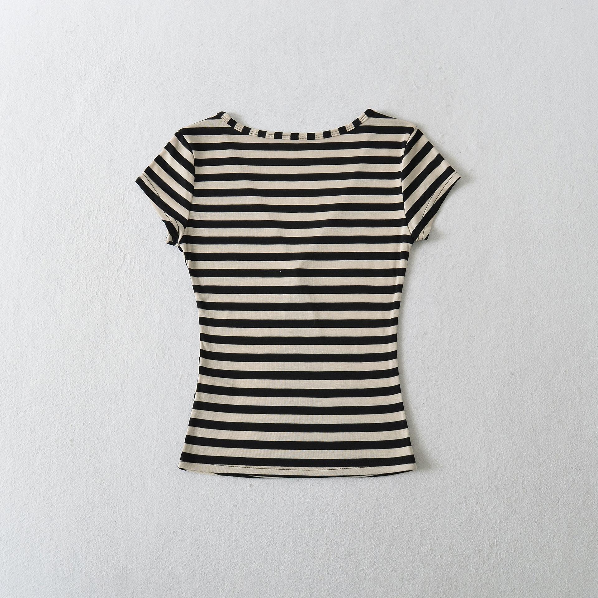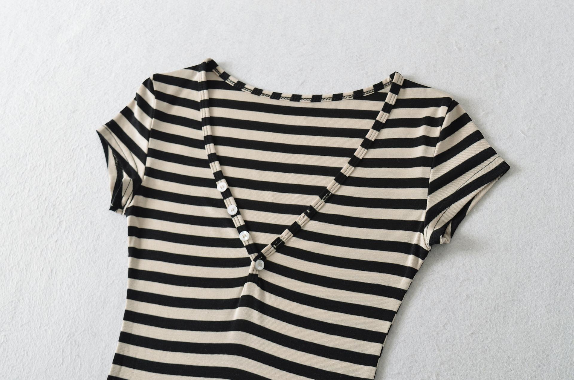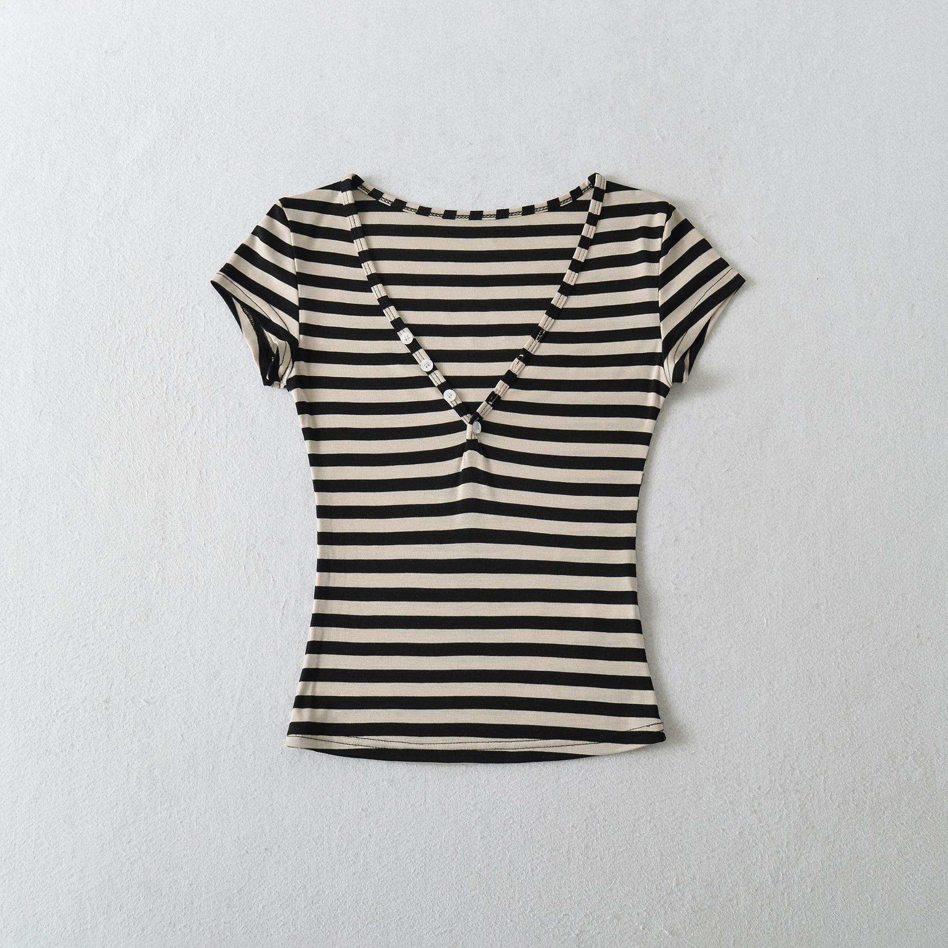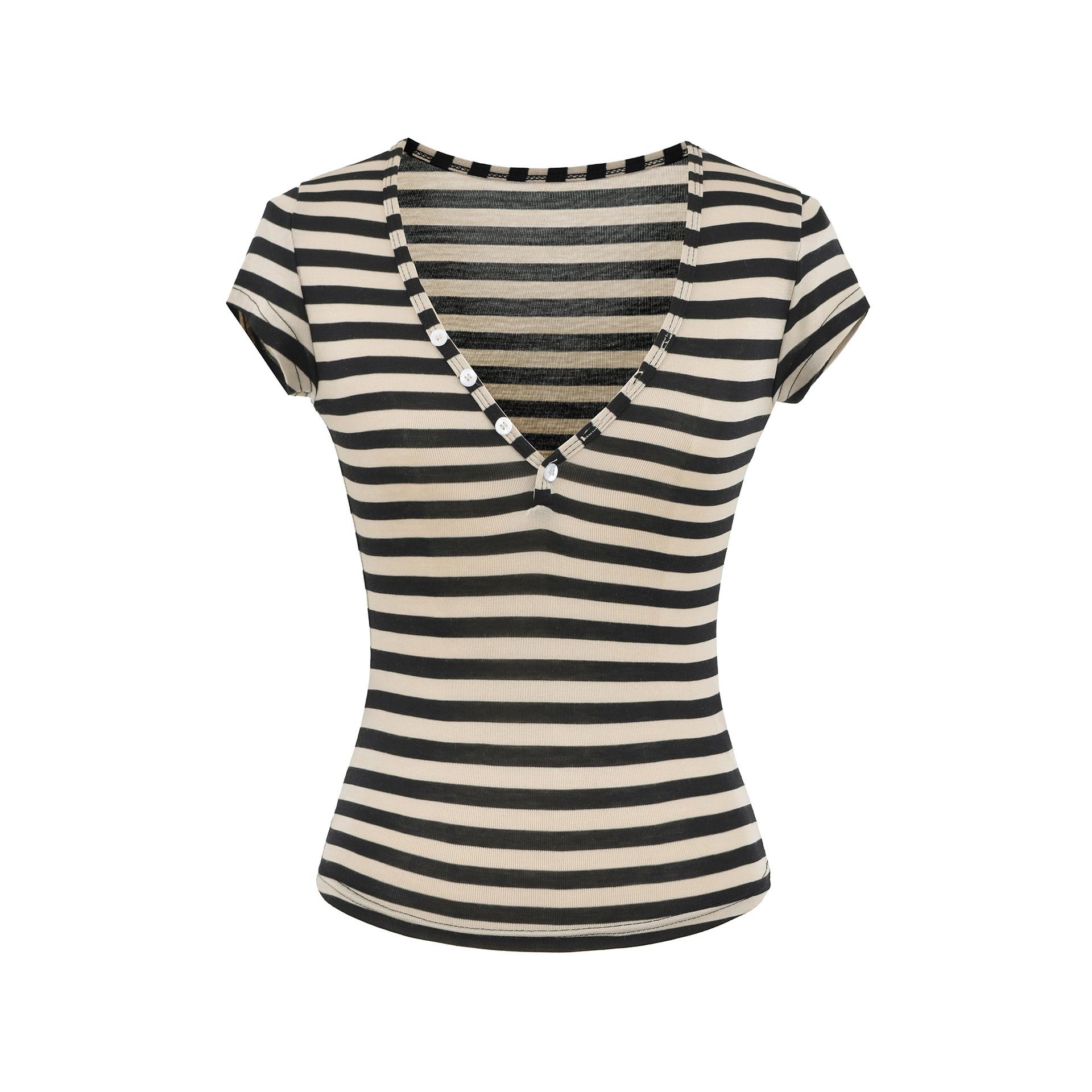 Tencel Chica Caliente Sexy Cuello en V Profundo Manga Corta Top Verano Decoración de Botones en Fila Ajustado a la Cintura Hombro Recto Adelgazante Camiseta Corta Capa Base