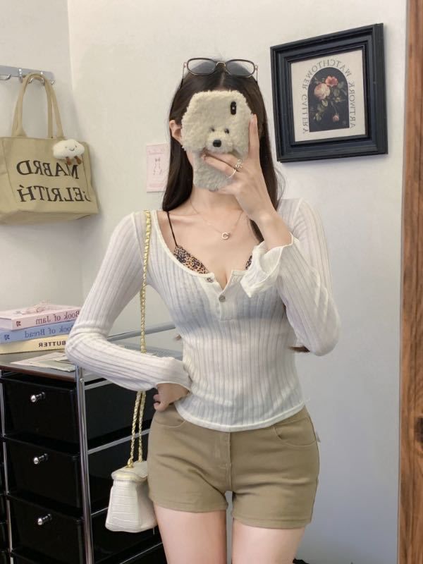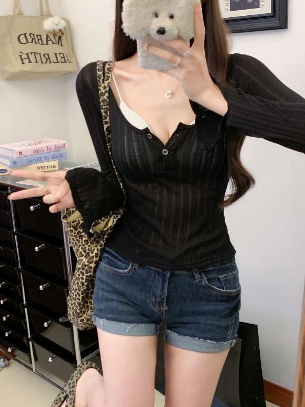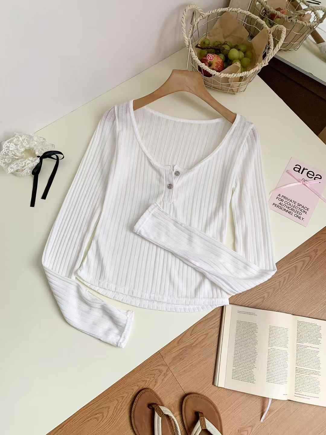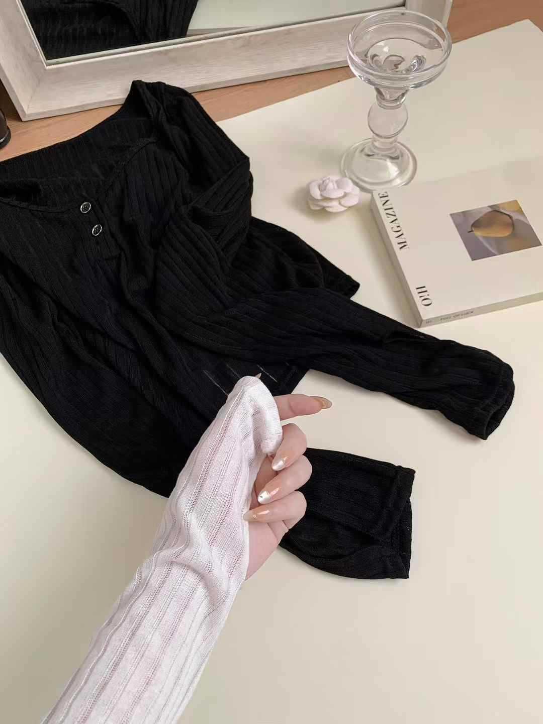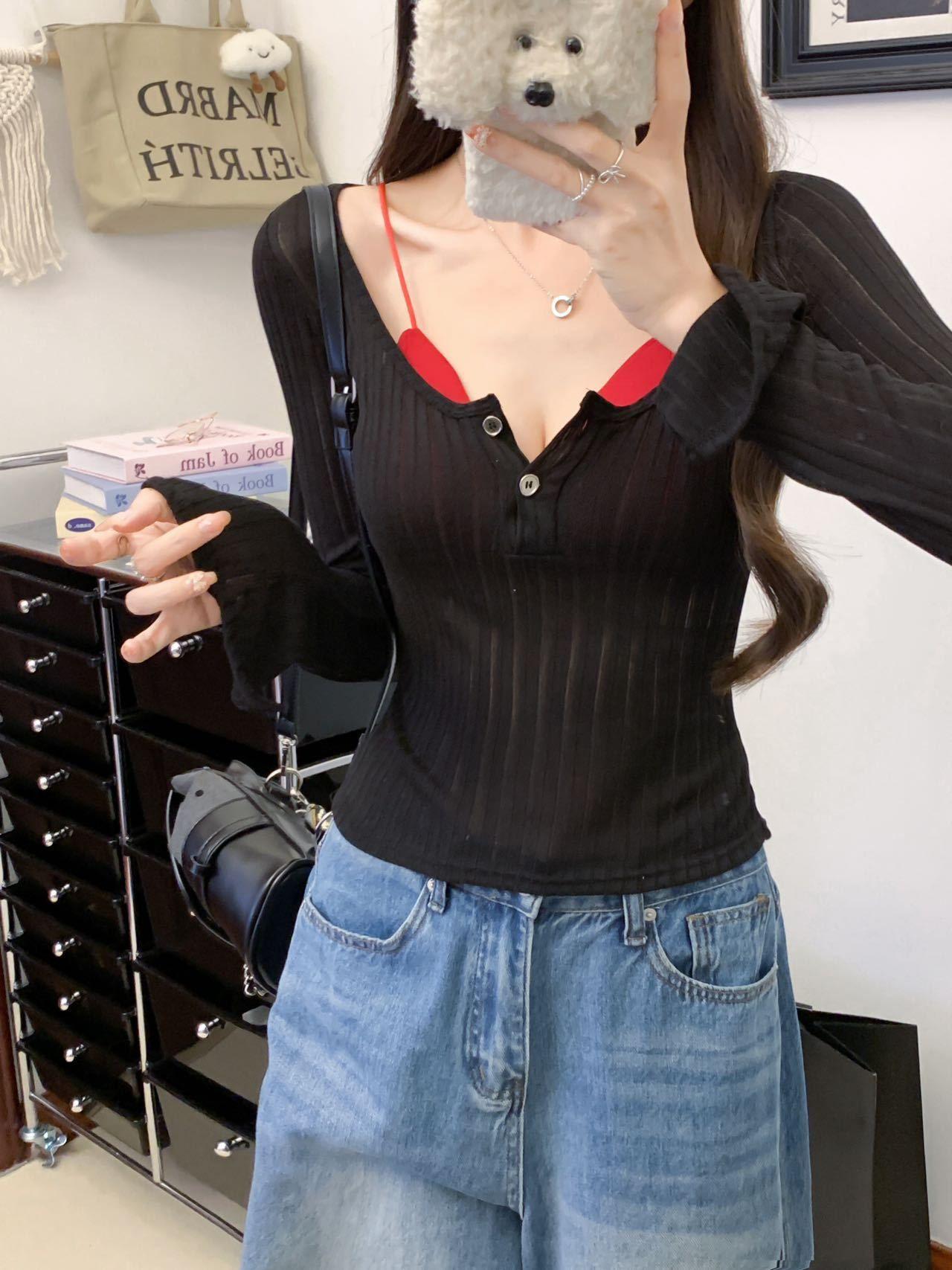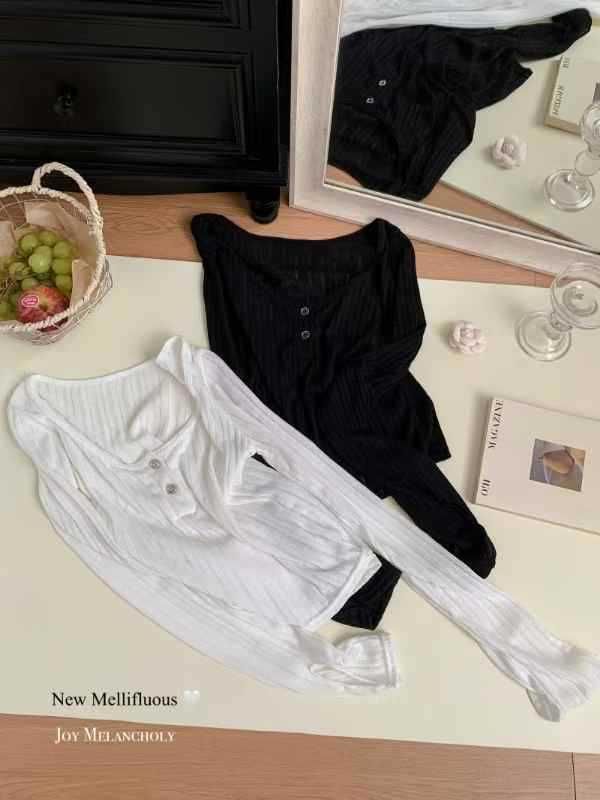 898 # Verano Nuevo Ropa de Protección Solar, Camiseta Fina de Manga Larga, Diseño Versátil de Cintura en Capas, Top Cárdigan con Botones