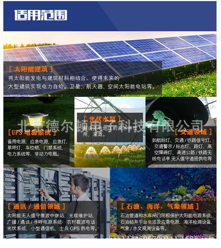 l Campos petroleros, oceánicos y meteorológicos: sistemas de suministro de energía solar para protección catódica de oleoductos y compuertas de embalses, suministros de energía vital y de emergencia para plataformas de perforación petrolera, equipos marinos, equipos de observación meteorológica/hidrológica, etc.