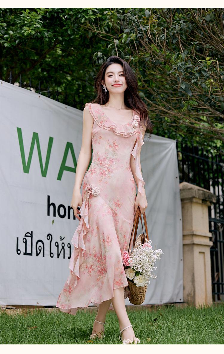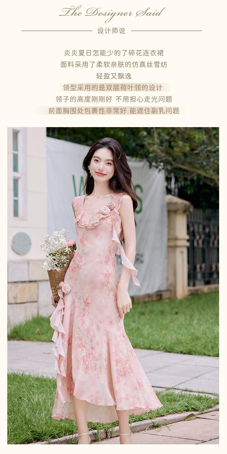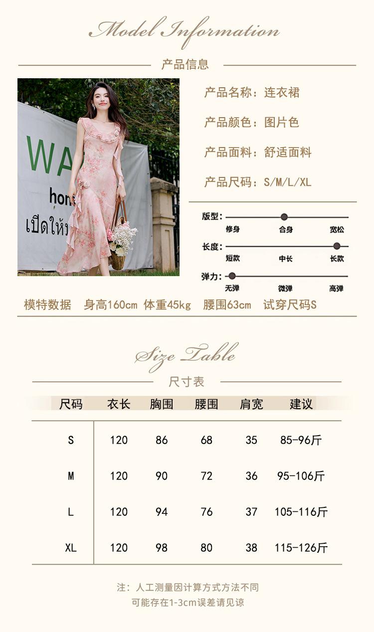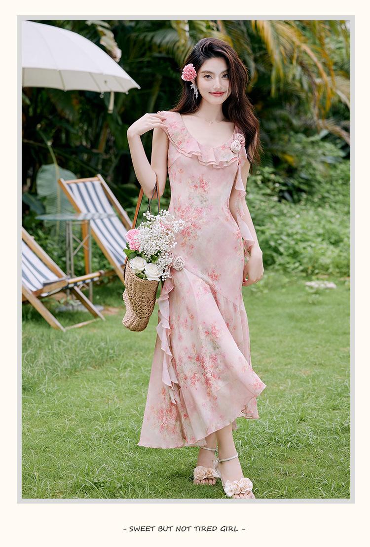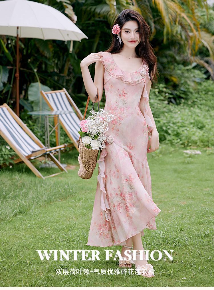 Nuevo Vestido Floral Retro Francés en Stock Foto Real Vacaciones en la Playa Vestido Largo de Playa Vestido Atmosférico