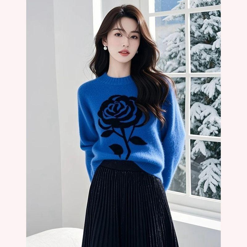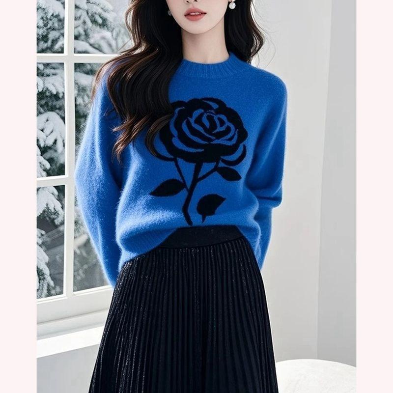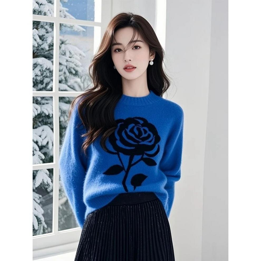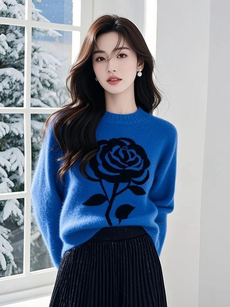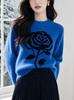 2025 Otoño/Invierno Nuevo Diseño Coreano Estilo Perezoso Sentido Azul Real Floral Suéter de Punto Suave de Temperamento Suelto para Mujer
