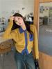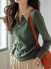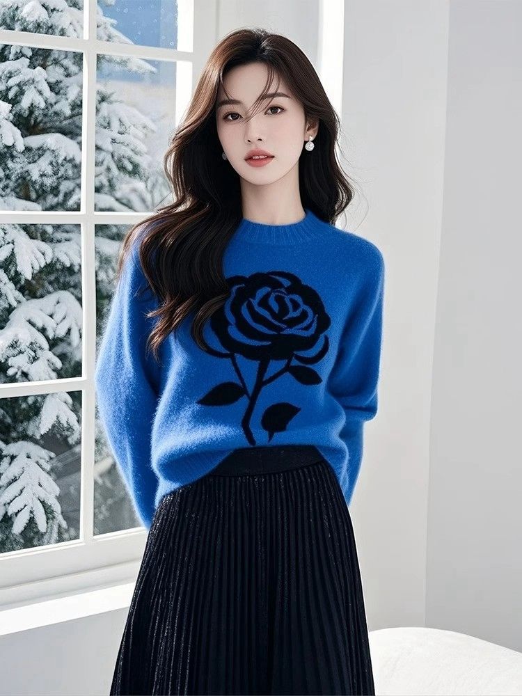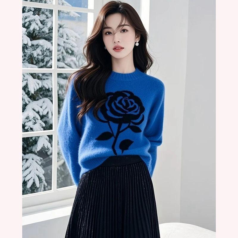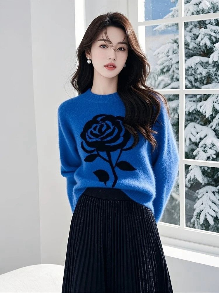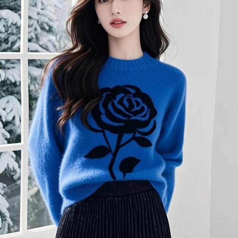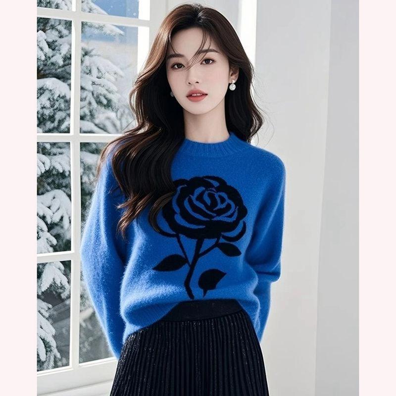 2025 Otoño/Invierno Nuevo Diseño Coreano Estilo Perezoso Sentido Azul Real Floral Suéter de Punto Suave de Temperamento Suelto para Mujer