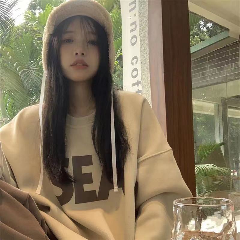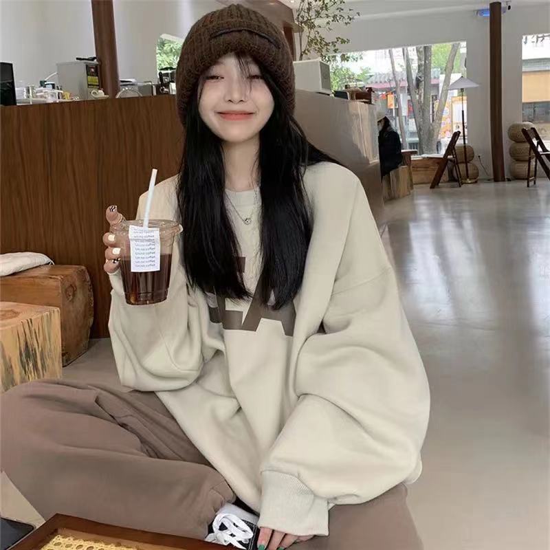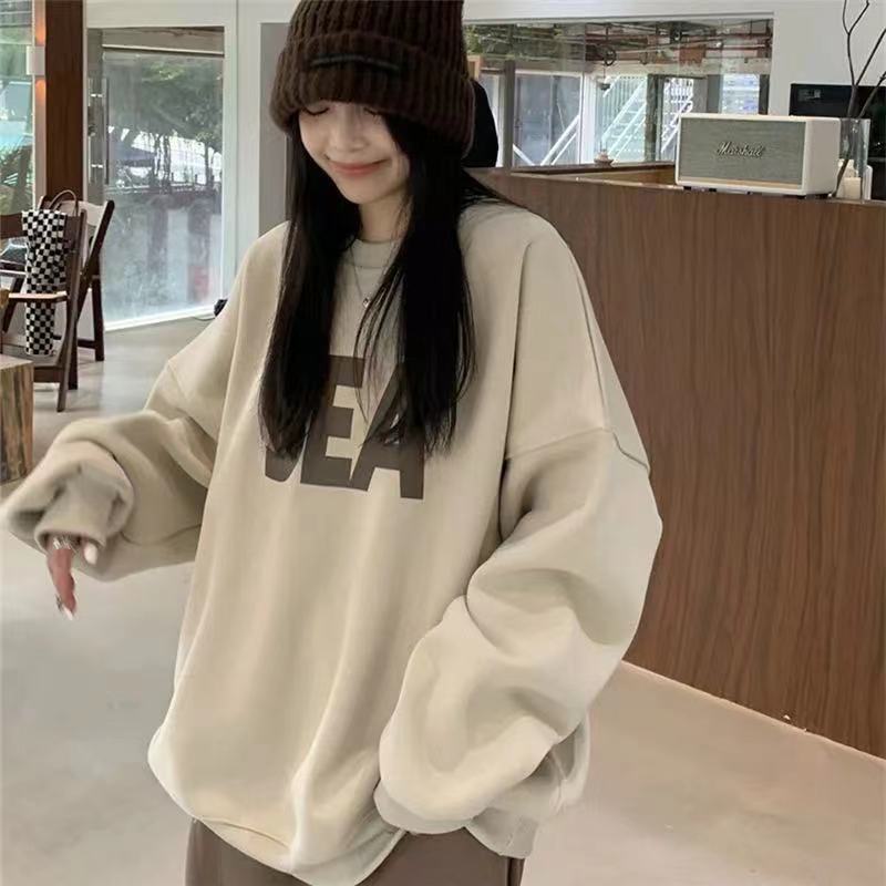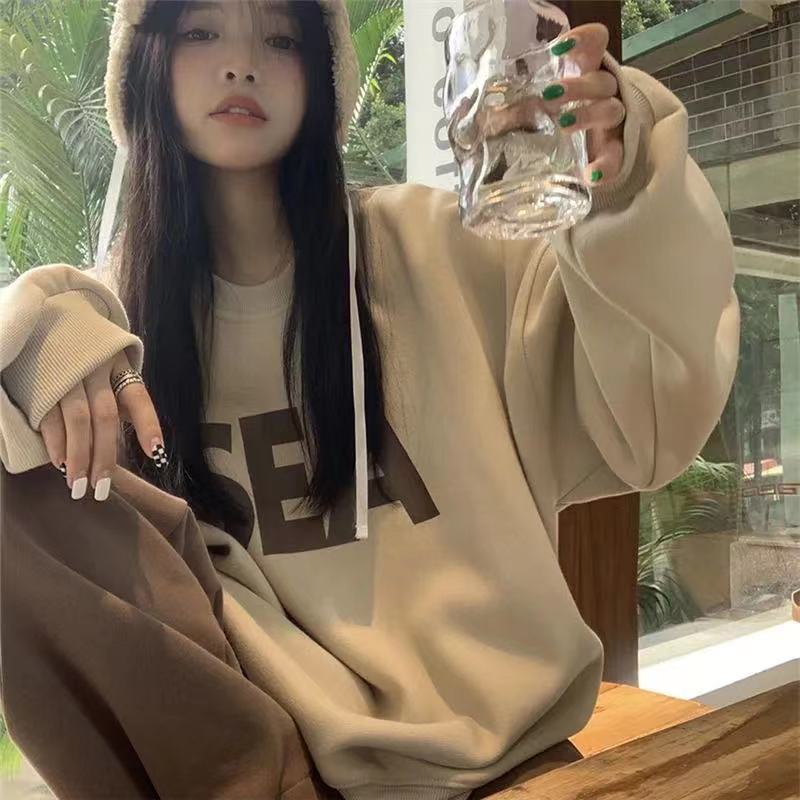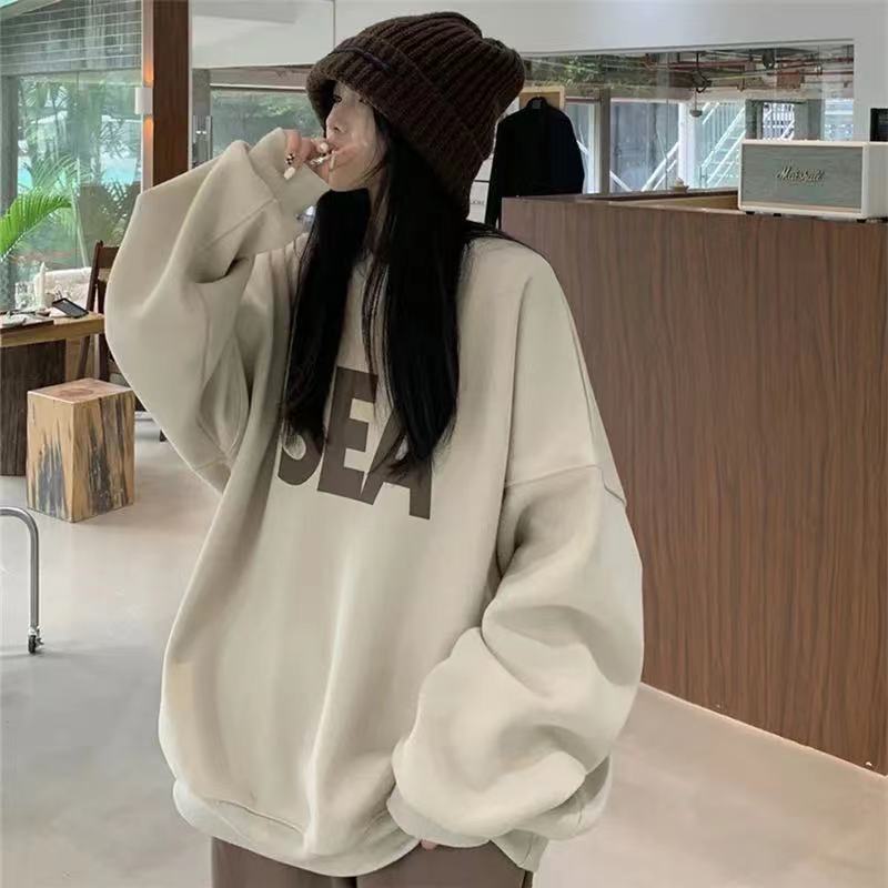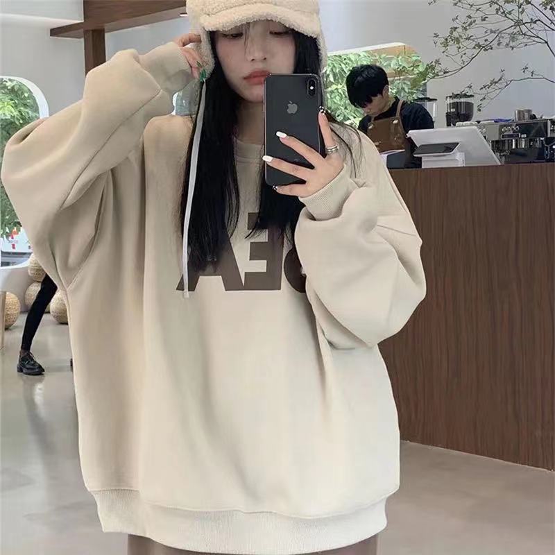 Ropa Exterior con Forro Polar Pilling Sudadera para Mujer Otoño e Invierno Nueva Holgada Versátil Estudiante Manga Larga Estilo Lazy Top de Moda