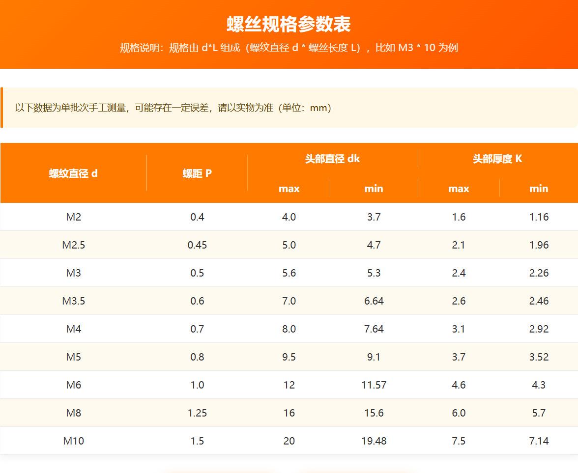 M1.4*3, M1.4*4, M1.4*5, M1.4*6, M1.4*8, M1.4*10, M1.6*3, M1.6*4, M1.6*5, M1.6*6, M1.6*8, M1.6*10, M1.6*12, M1....