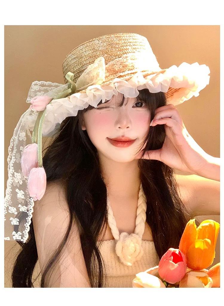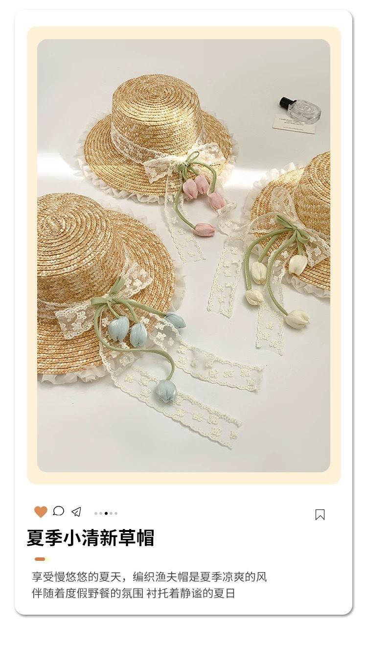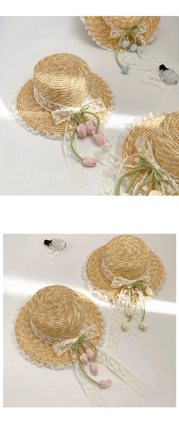 Sombrero de Paja Tulipán con Lazo de Encaje para Mujer Verano Playa Vacaciones Sombrero para el Sol Sombrero Protector Solar para Exterior