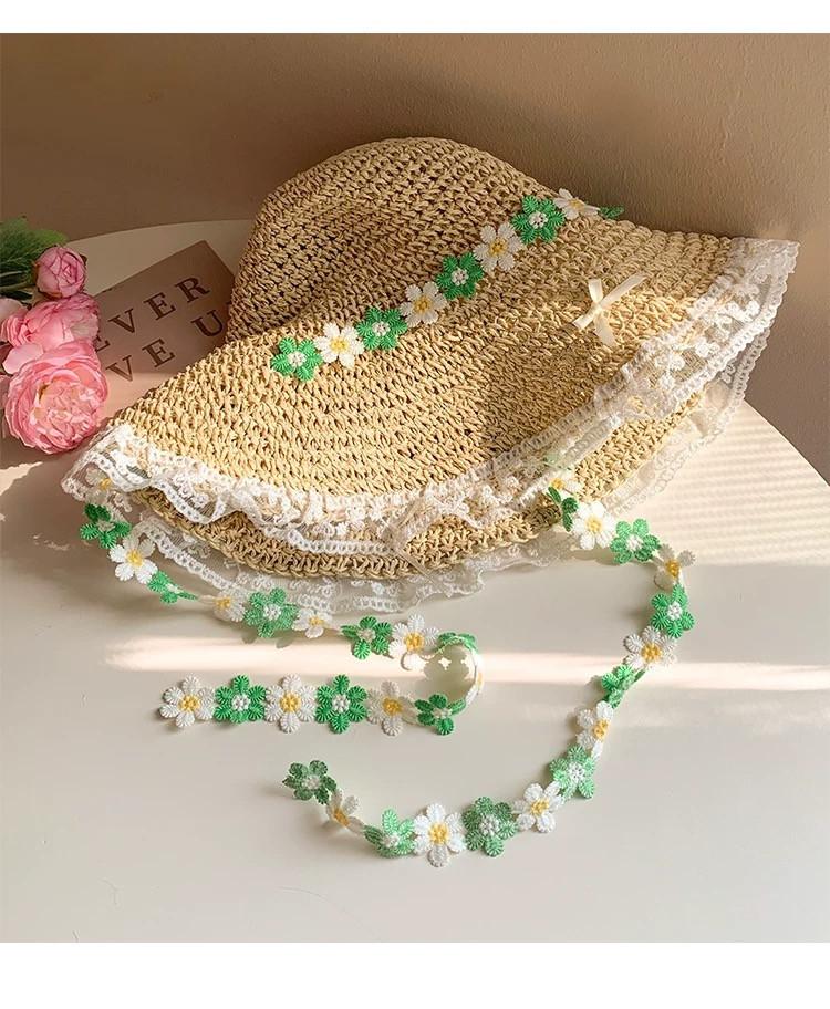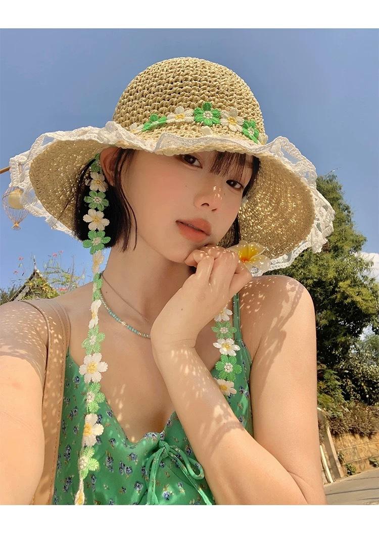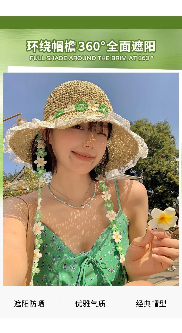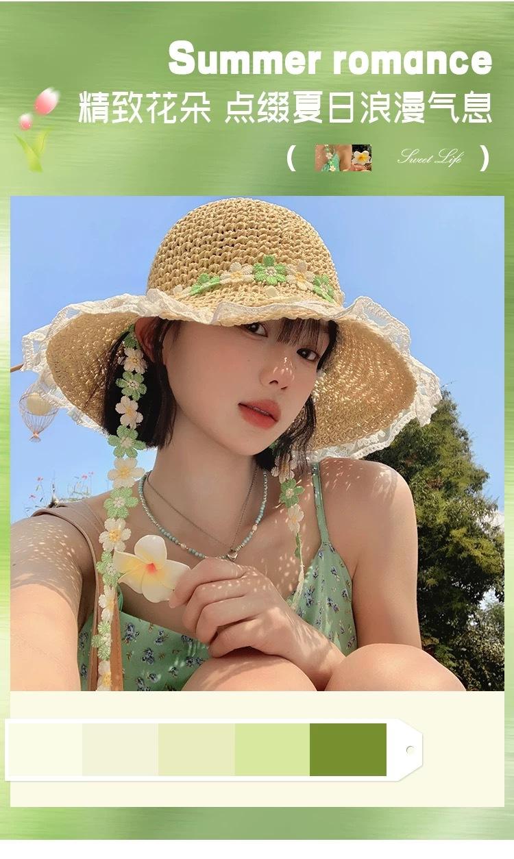 Sombrero de Paja con Encaje de Ala Francesa para Mujer Primavera 2025 Nuevo Sombrero para el Sol de Playa con Flor Sombrero Protector Solar