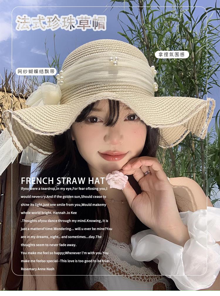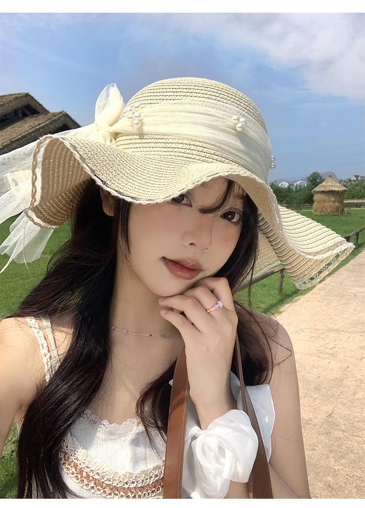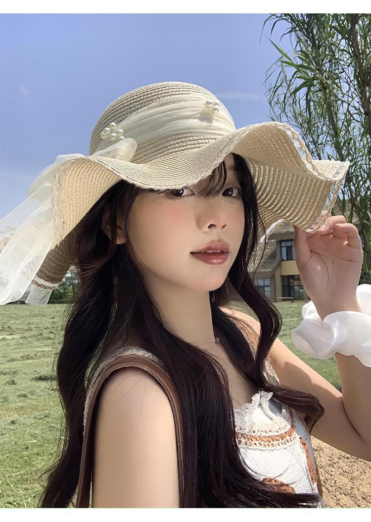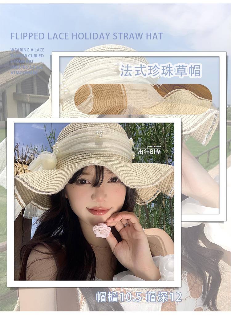 Sombrero de Paja Trenzada con Encaje Francés y Lazo de Perlas para Mujer Verano Vacaciones en la Playa junto al Mar Sombrero para el Sol