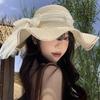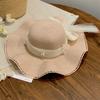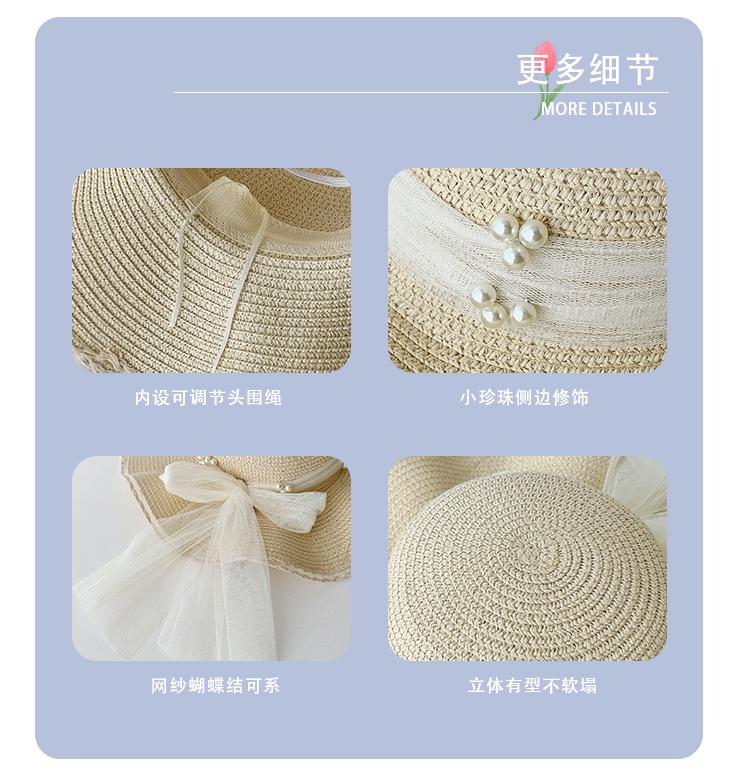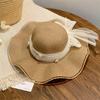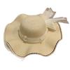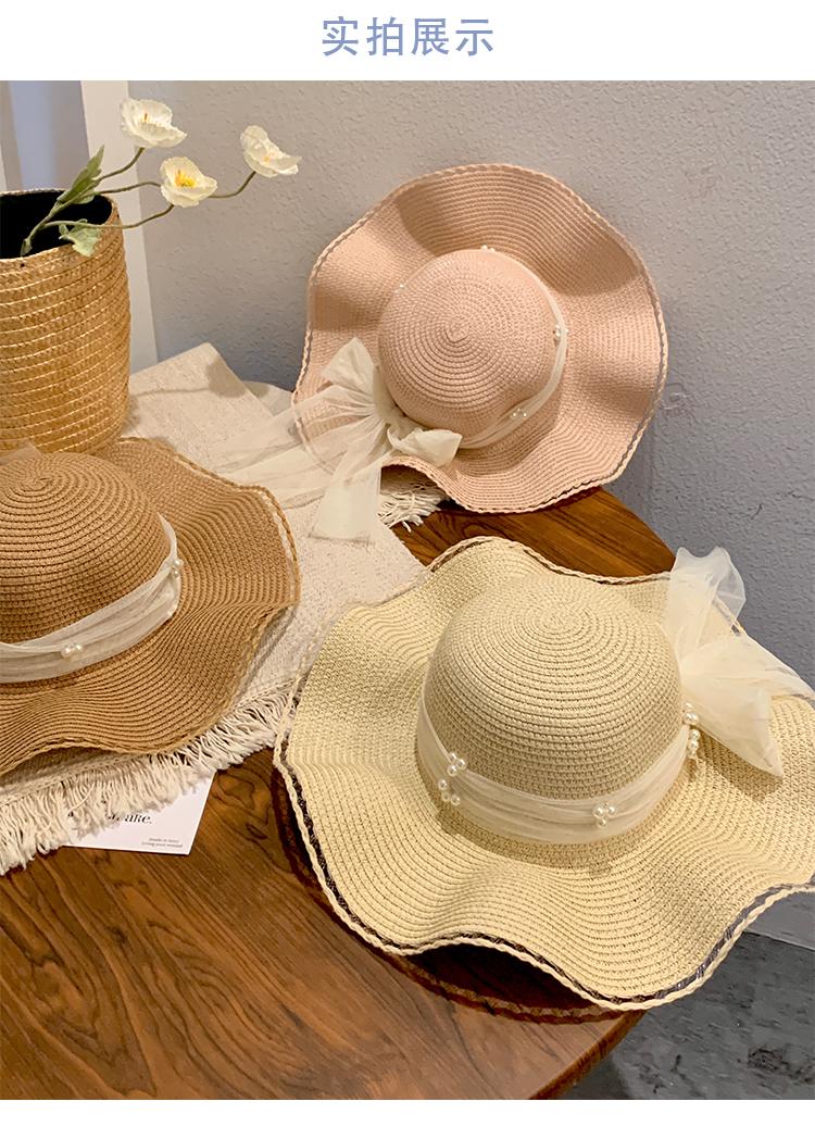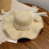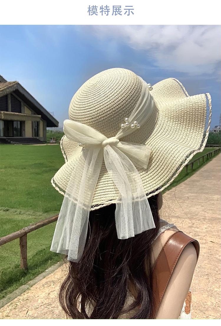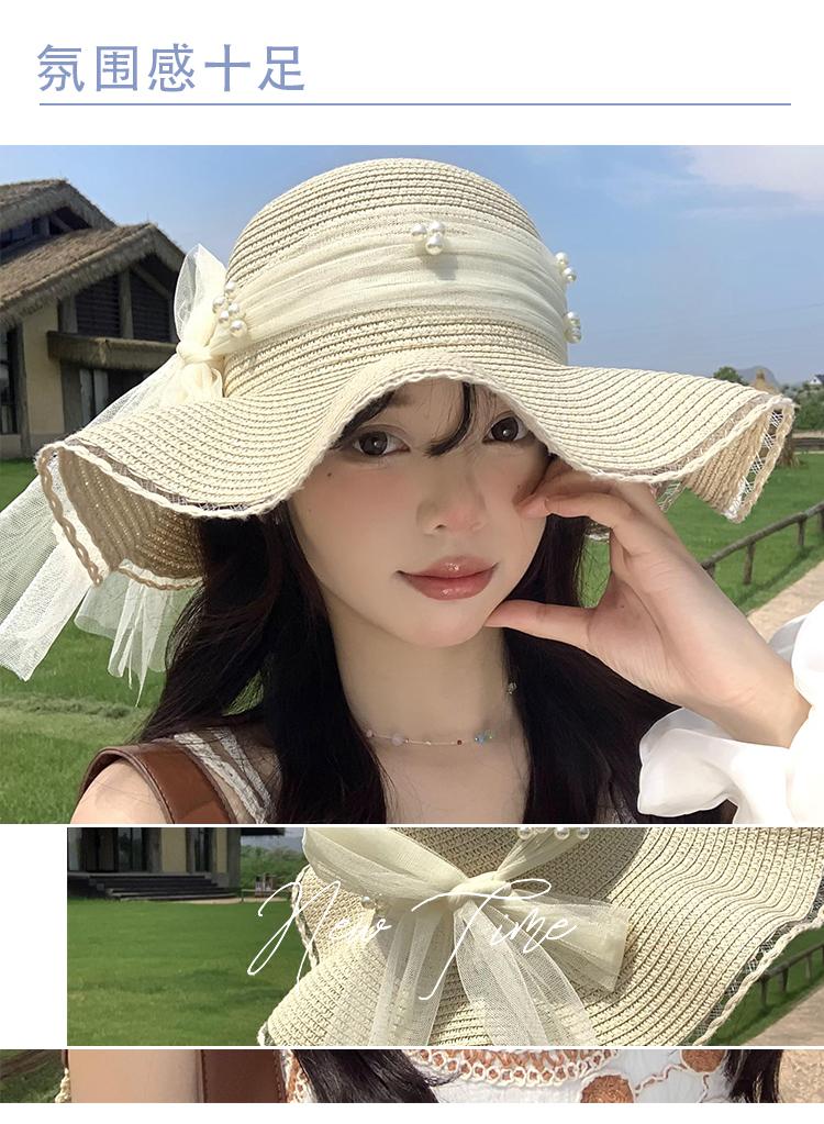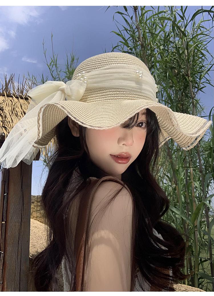Sombrero de Paja Trenzada con Encaje Francés y Lazo de Perlas para Mujer Verano Vacaciones en la Playa junto al Mar Sombrero para el Sol