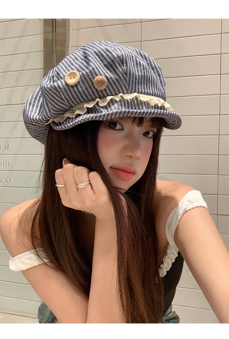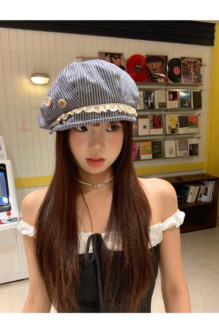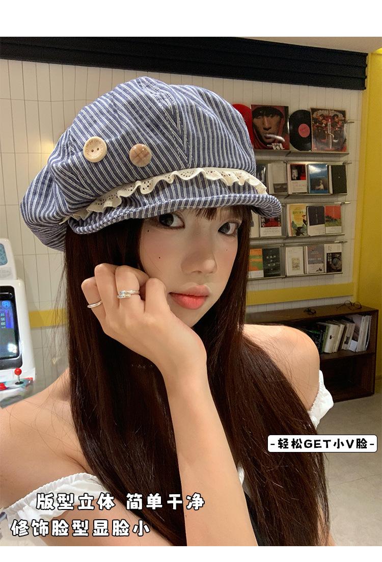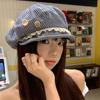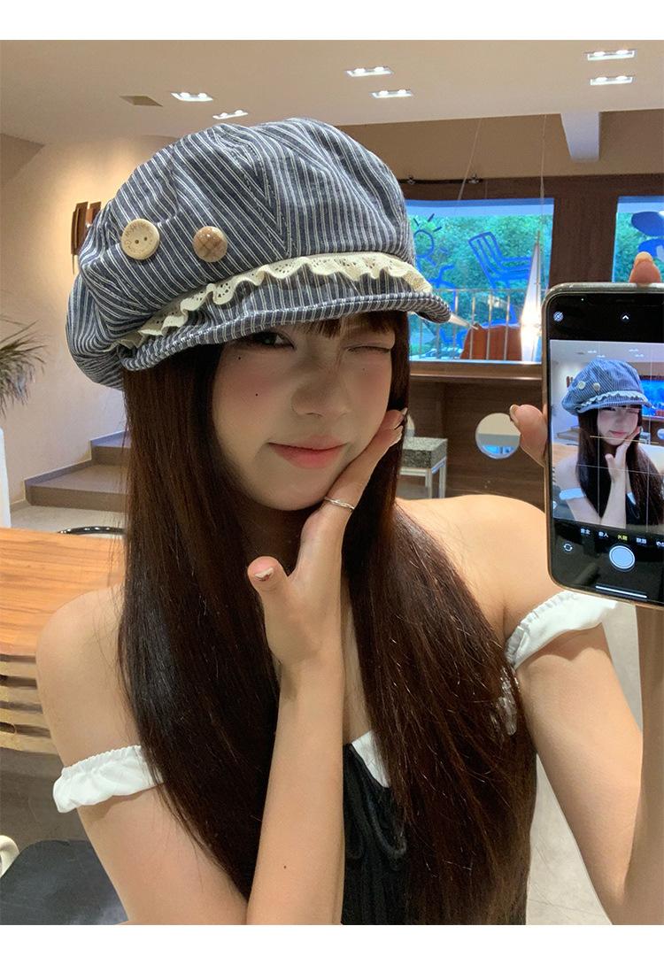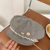 Boina a rayas con botón estilo coreano para mujer verano versátil circunferencia de cabeza grande muestra cara pequeña boina octogonal literaria nicho gorro de repartidor