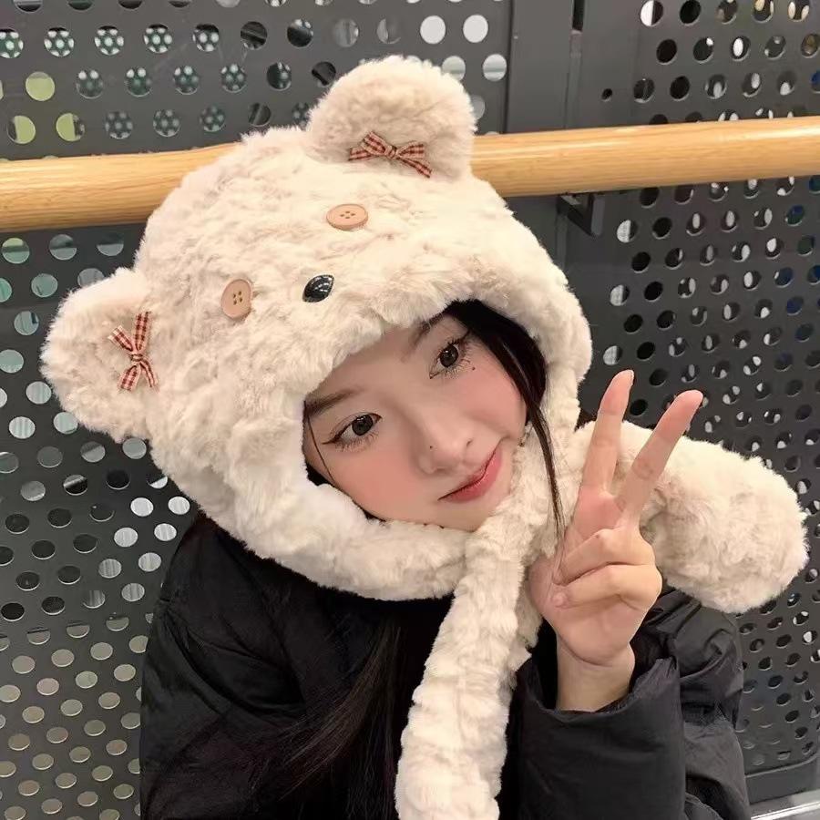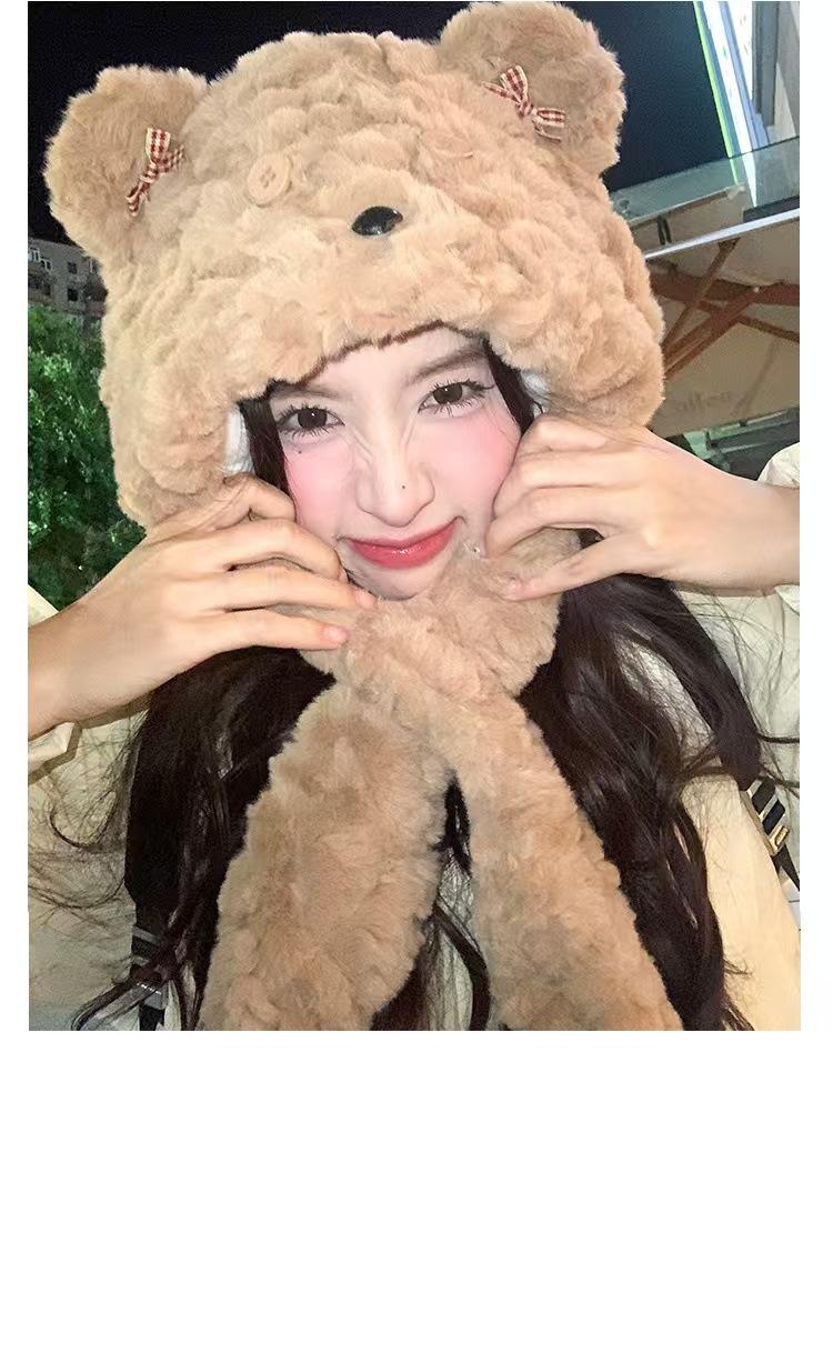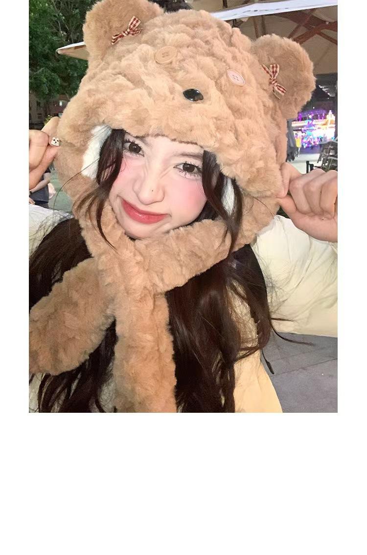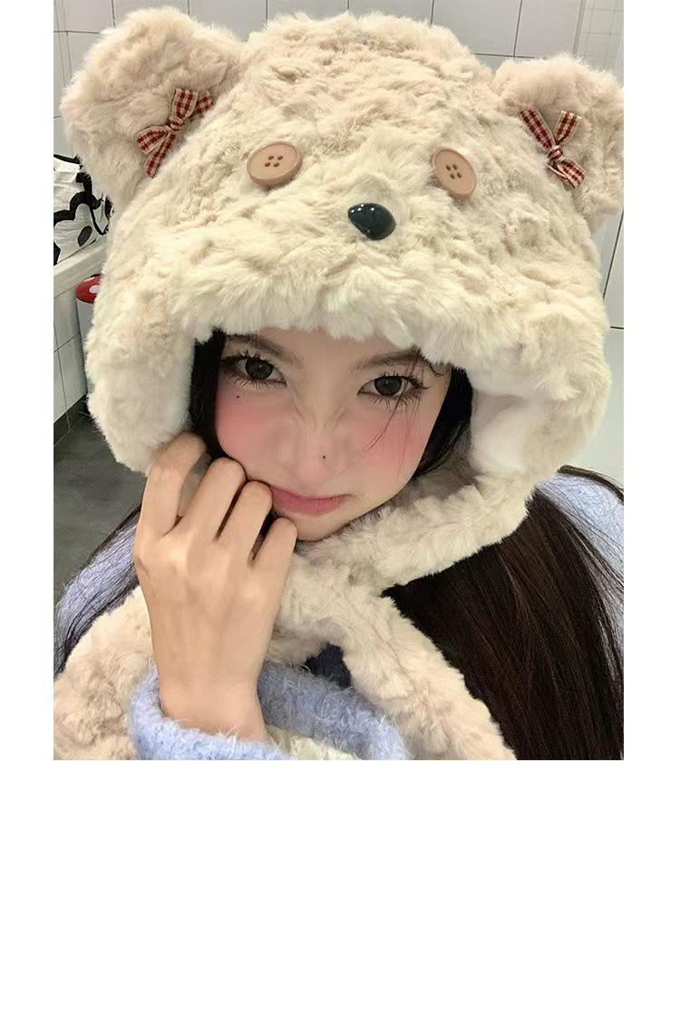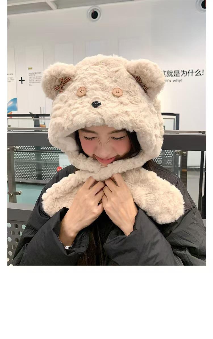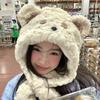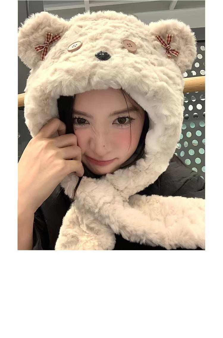 Sombrero Esponjoso de Oso Lindo de Dibujos Animados Invierno Bufanda Sombrero de Una Pieza Engrosado Cortavientos Cálido Protección para las Orejas Cuello Sombrero Esponjoso