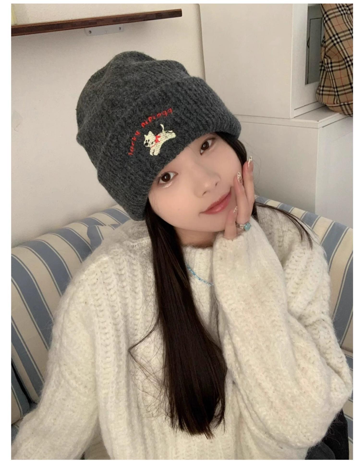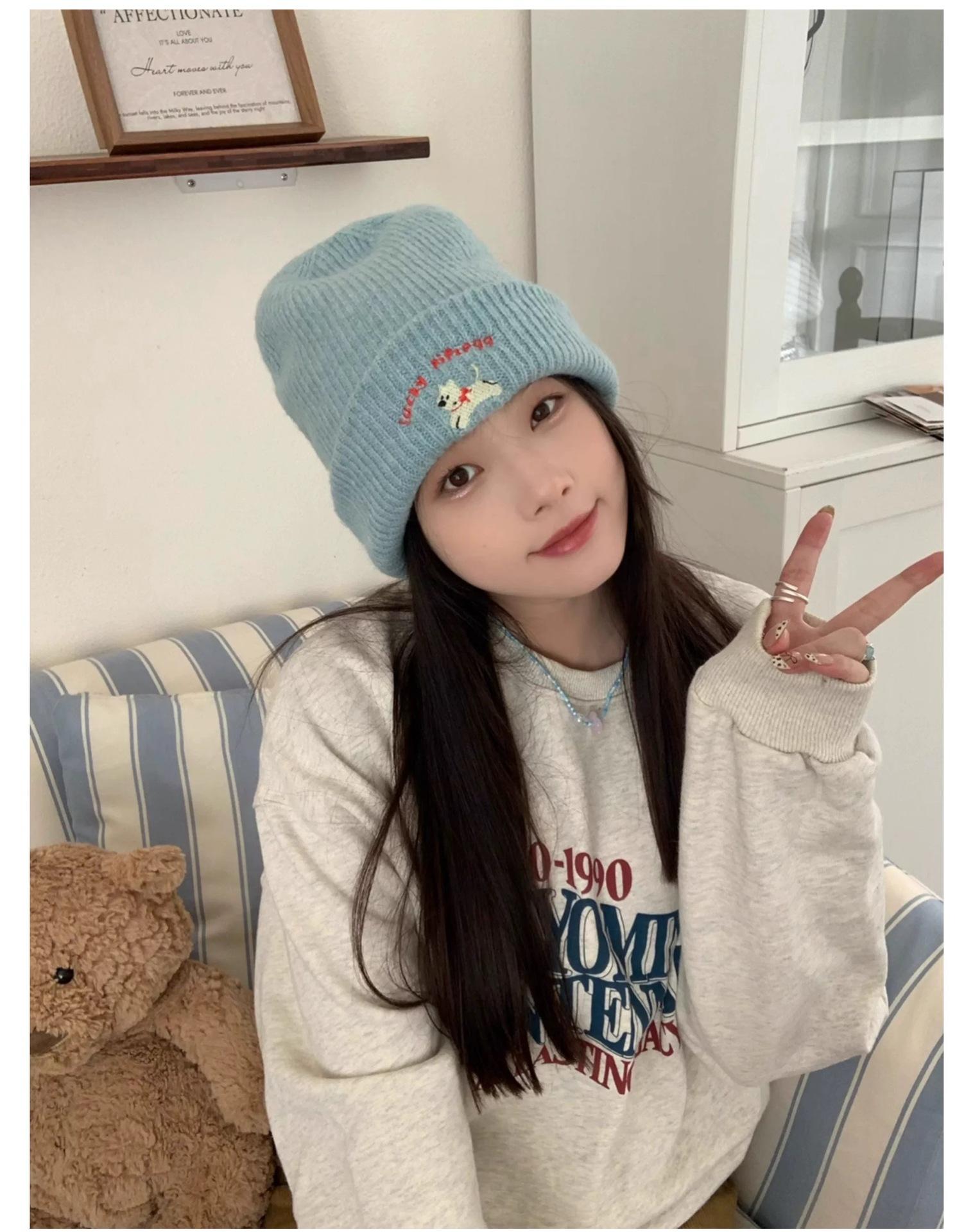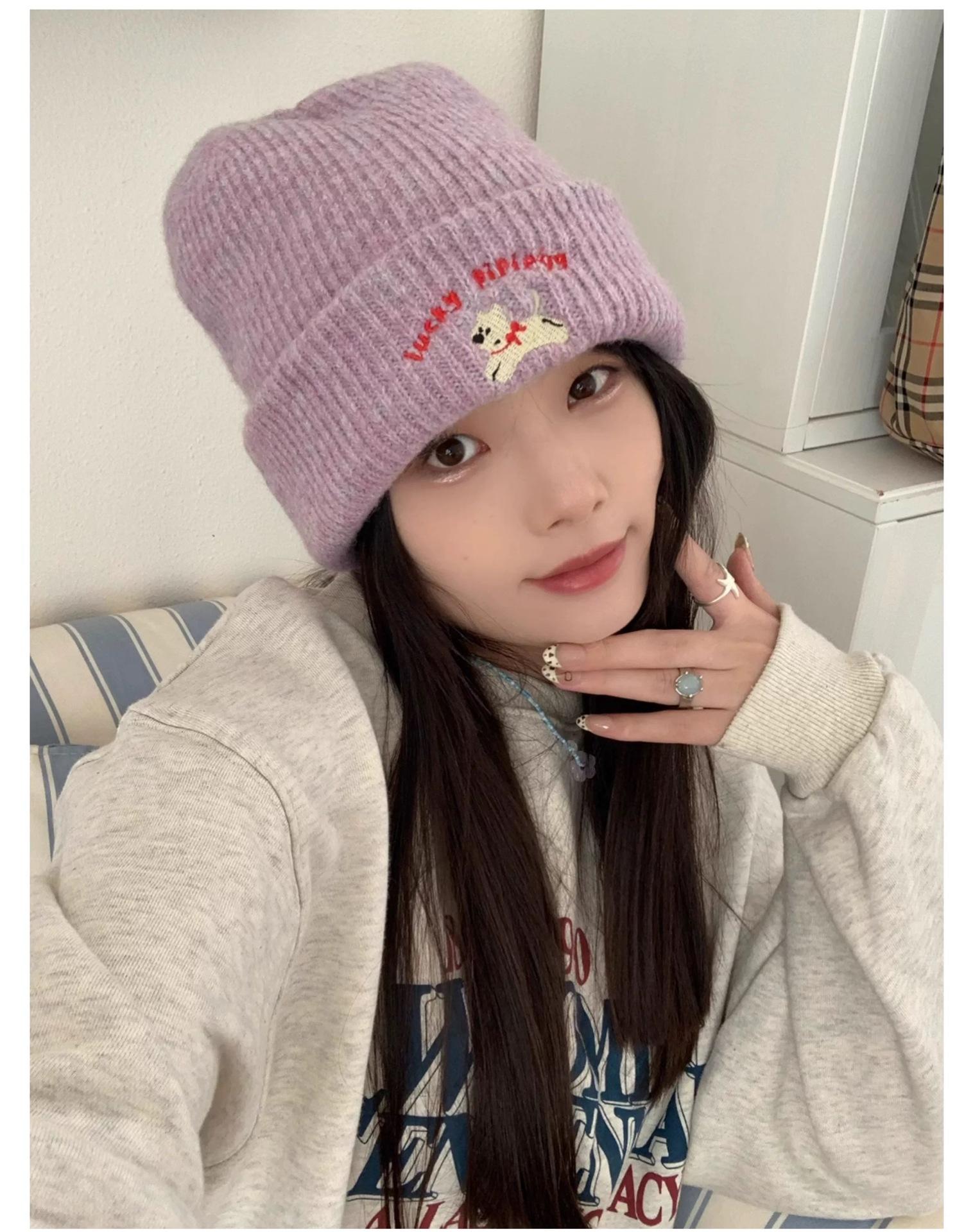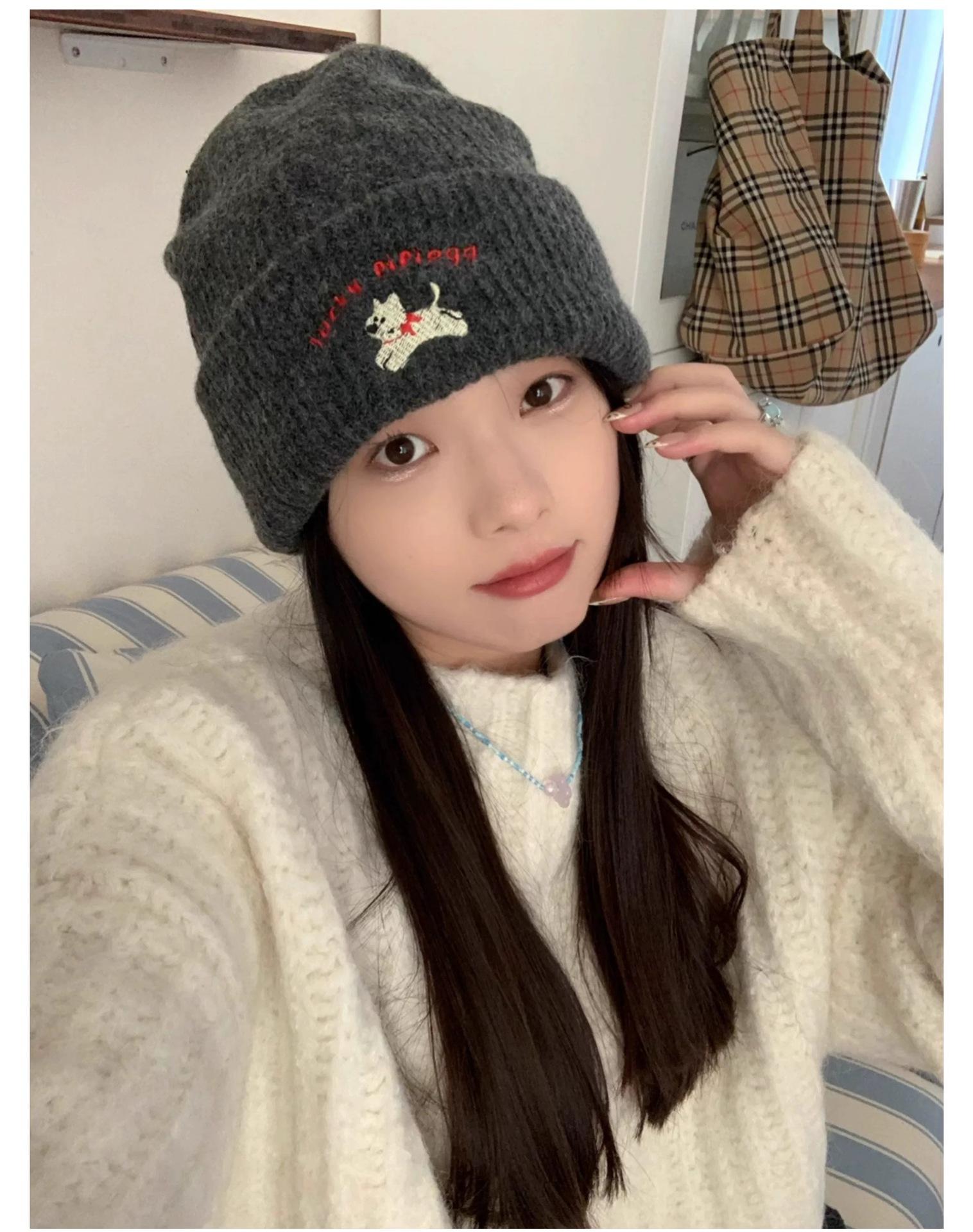 Lindo gorro de lana de punto bordado con cachorro para mujer, nuevo gorro de otoño e invierno 2024, pequeño gorro de cabeza grande que combina con todo.
