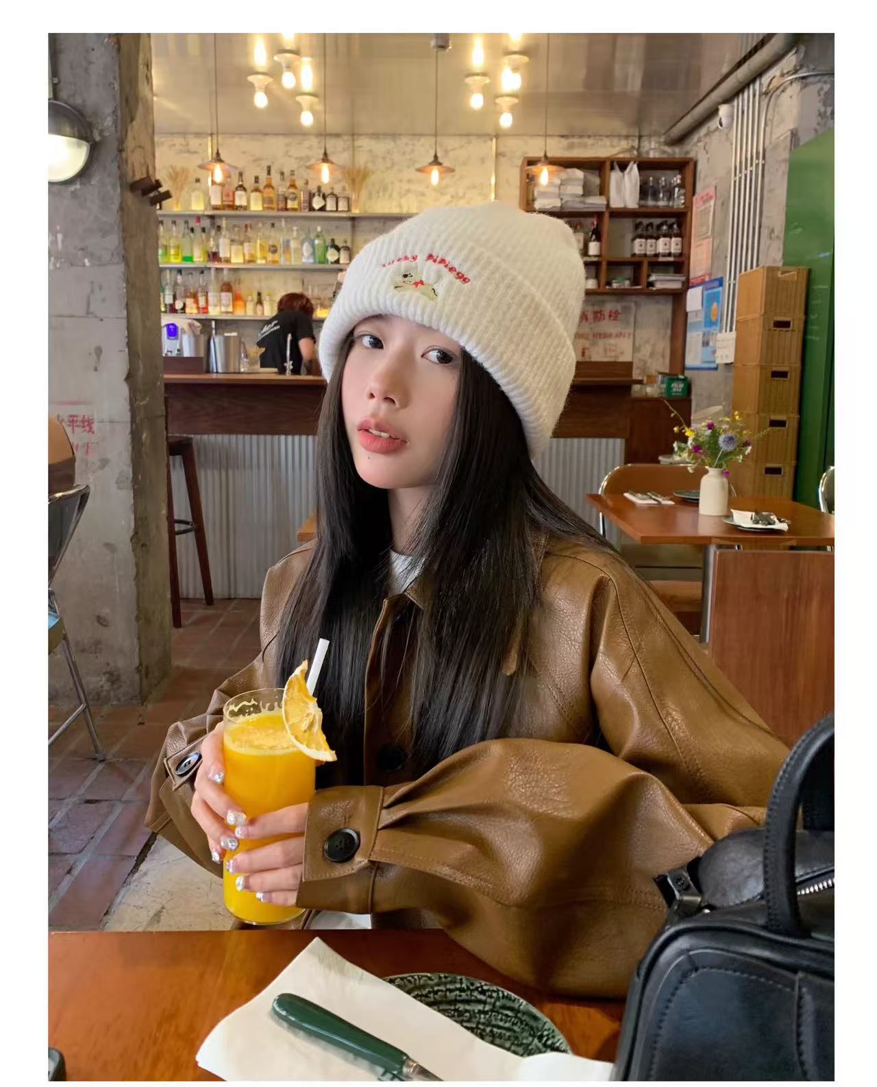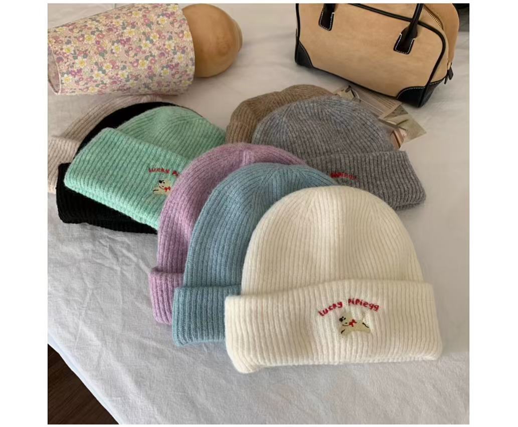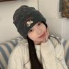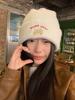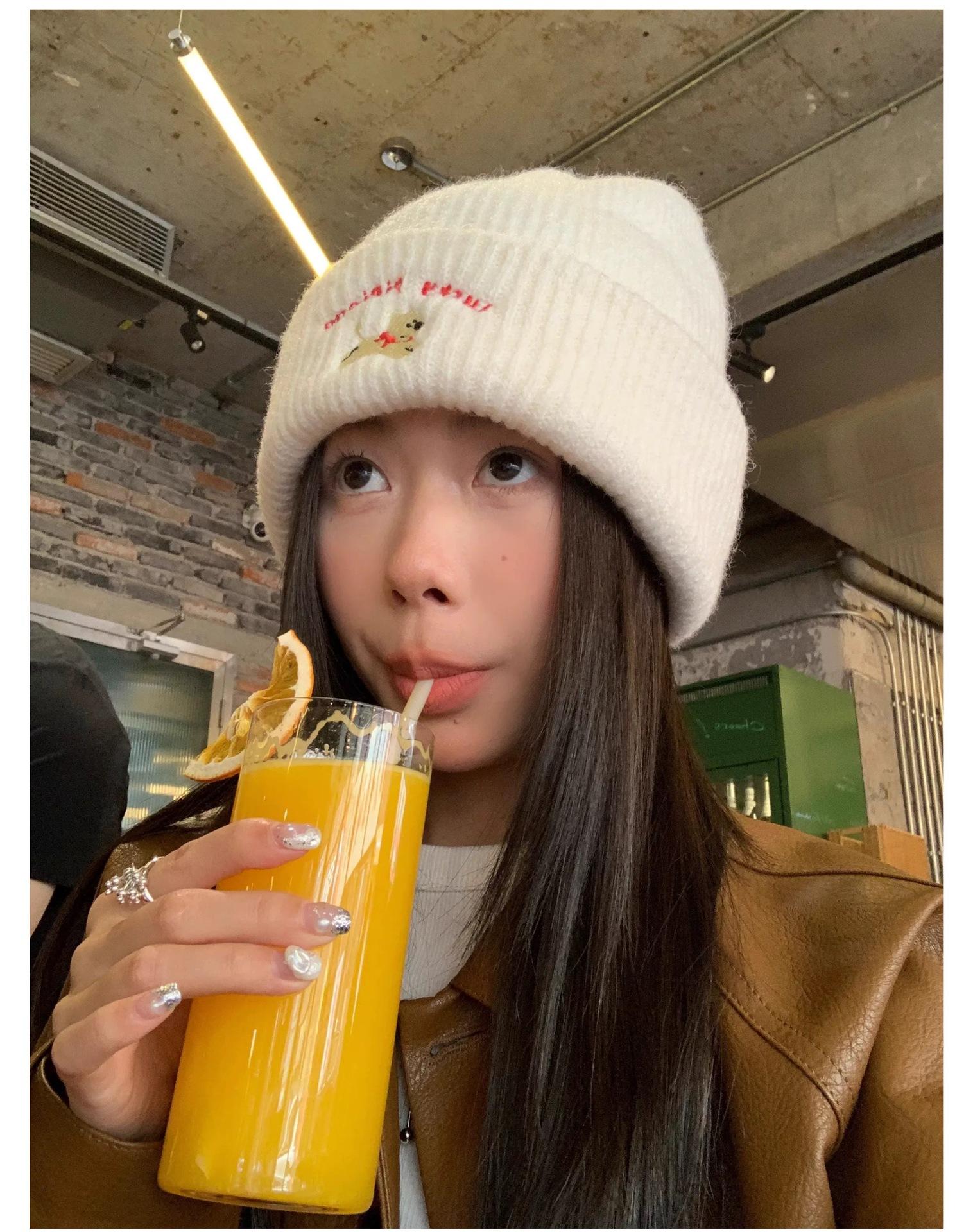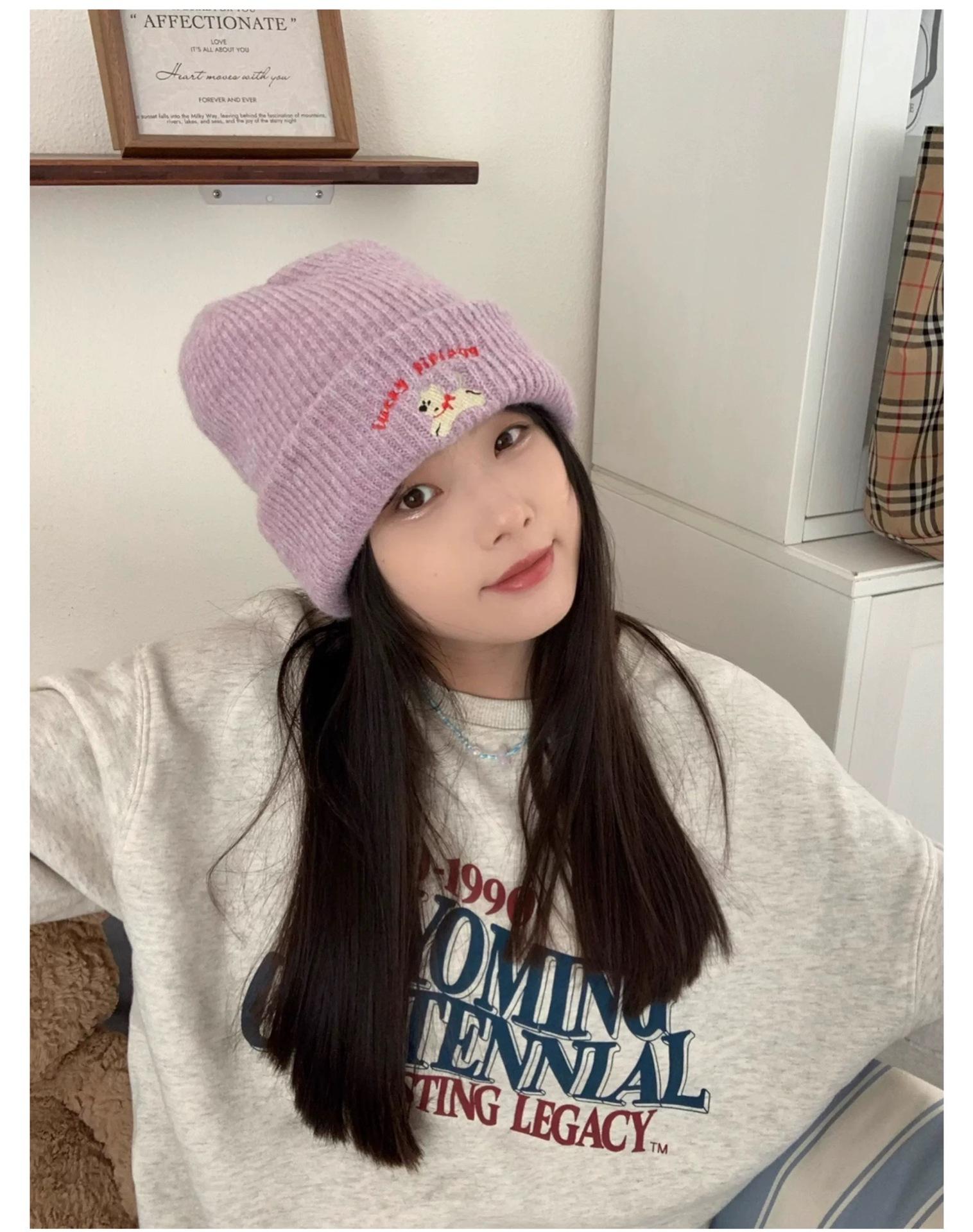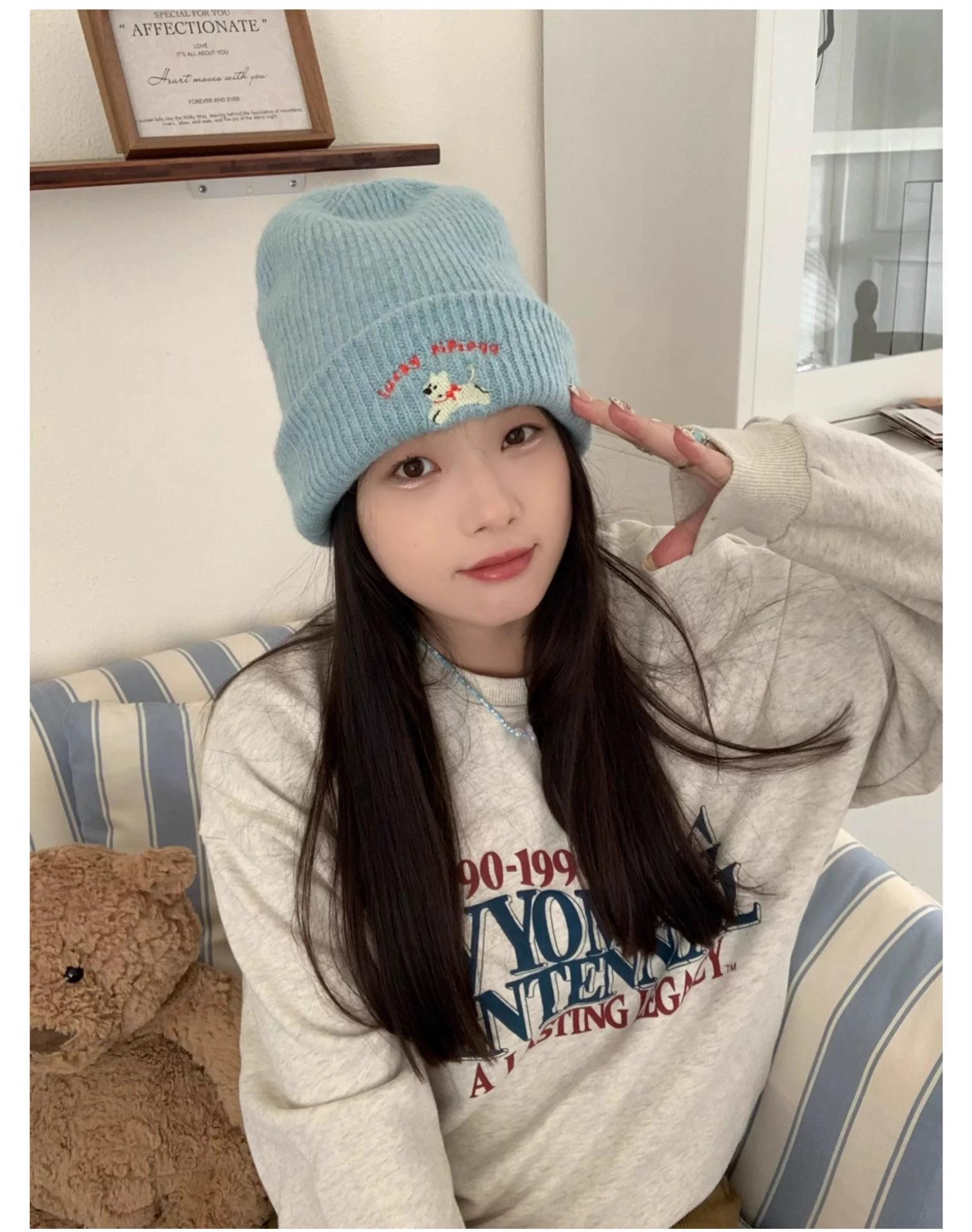 Lindo gorro de lana de punto bordado con cachorro para mujer, nuevo gorro de otoño e invierno 2024, pequeño gorro de cabeza grande que combina con todo.
