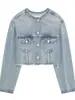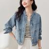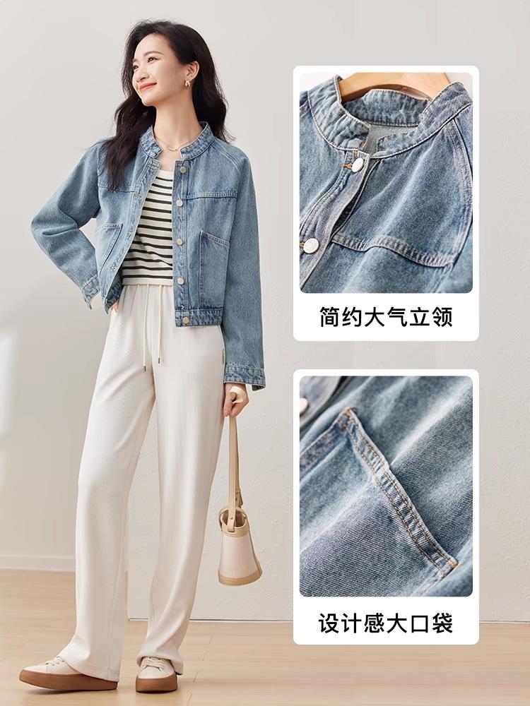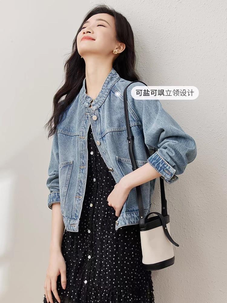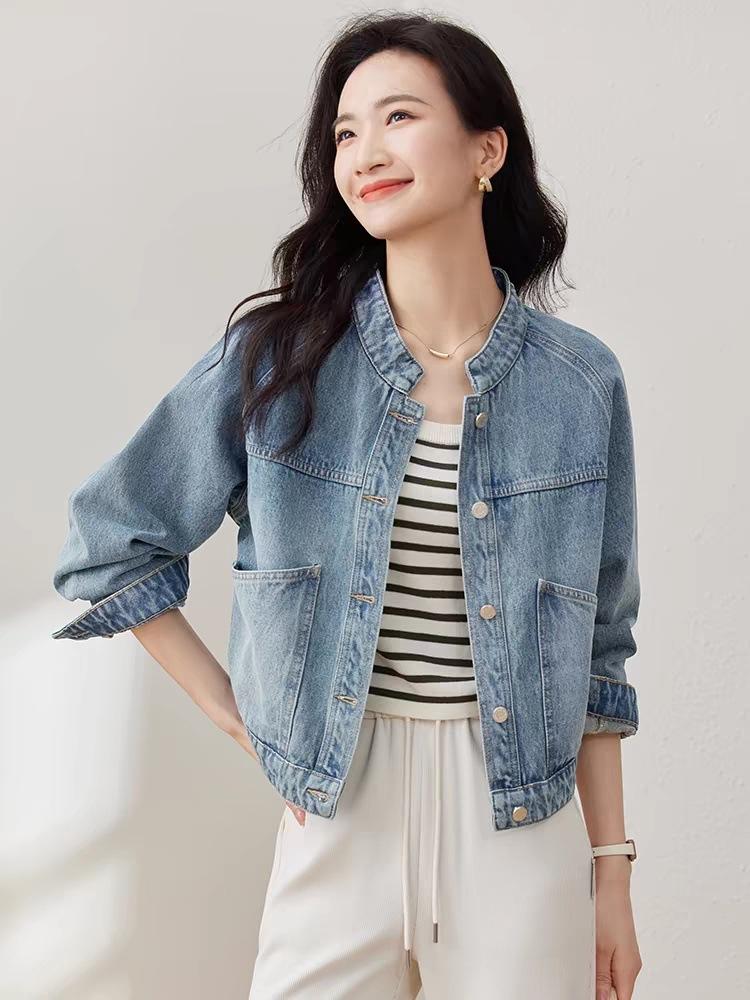 Abrigo corto de mezclilla lavado vintage 2024 para mujer, nuevo de otoño e invierno, cuello alto, manga larga pequeña, top para mujer al por mayor