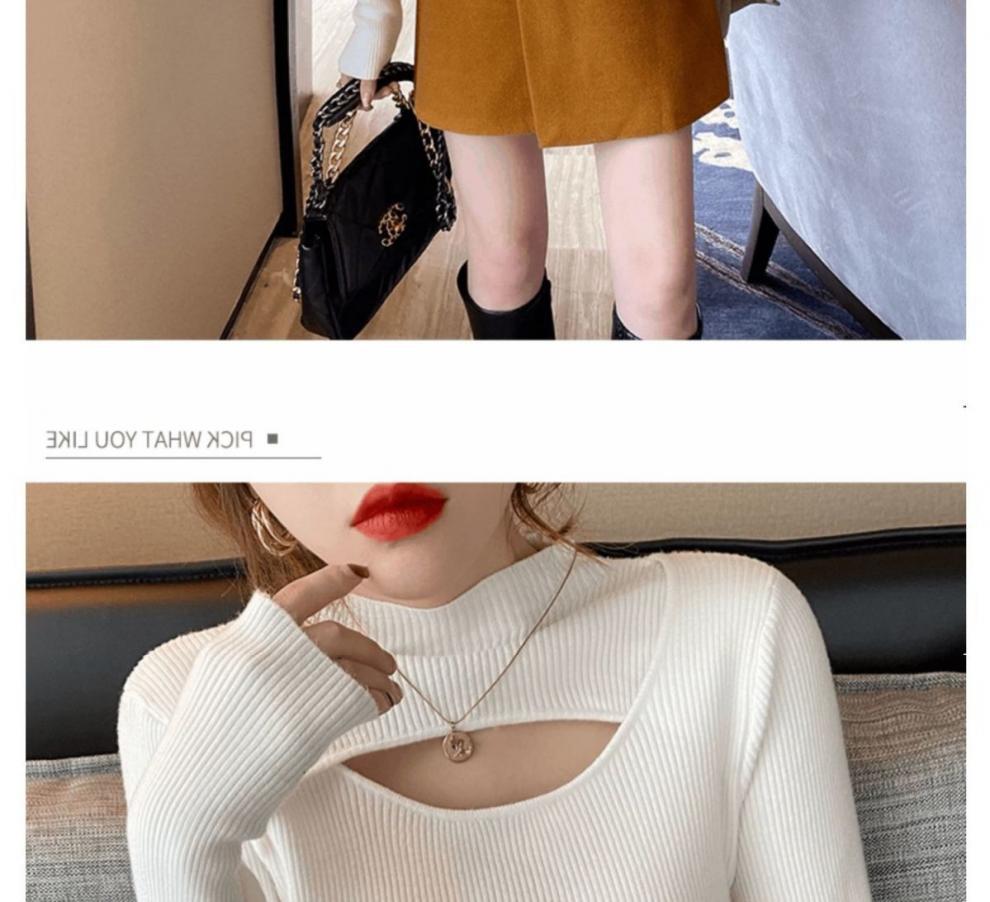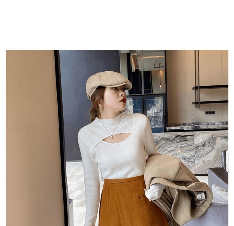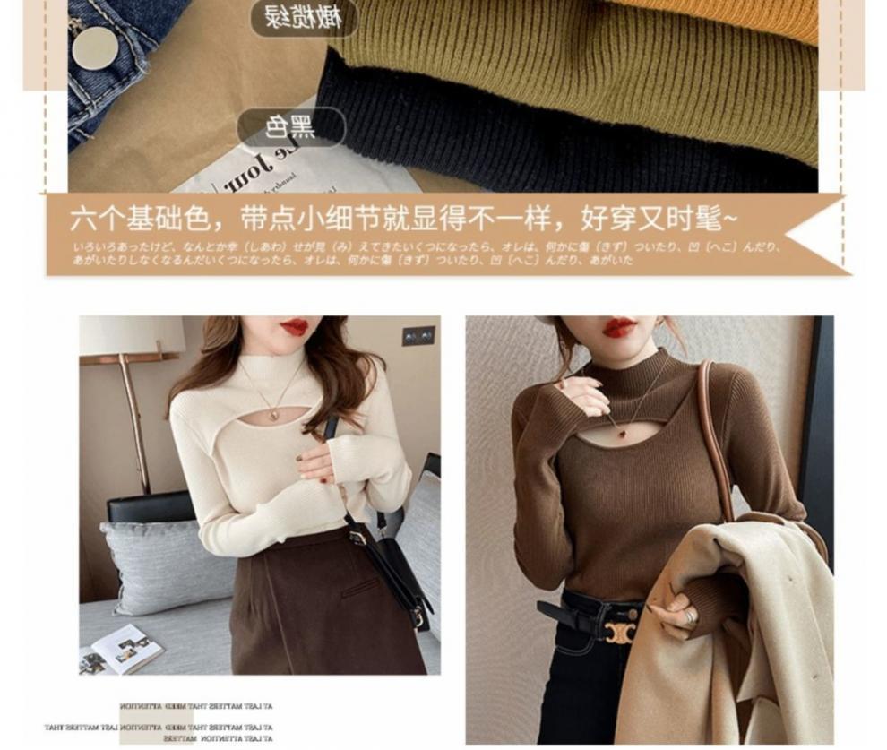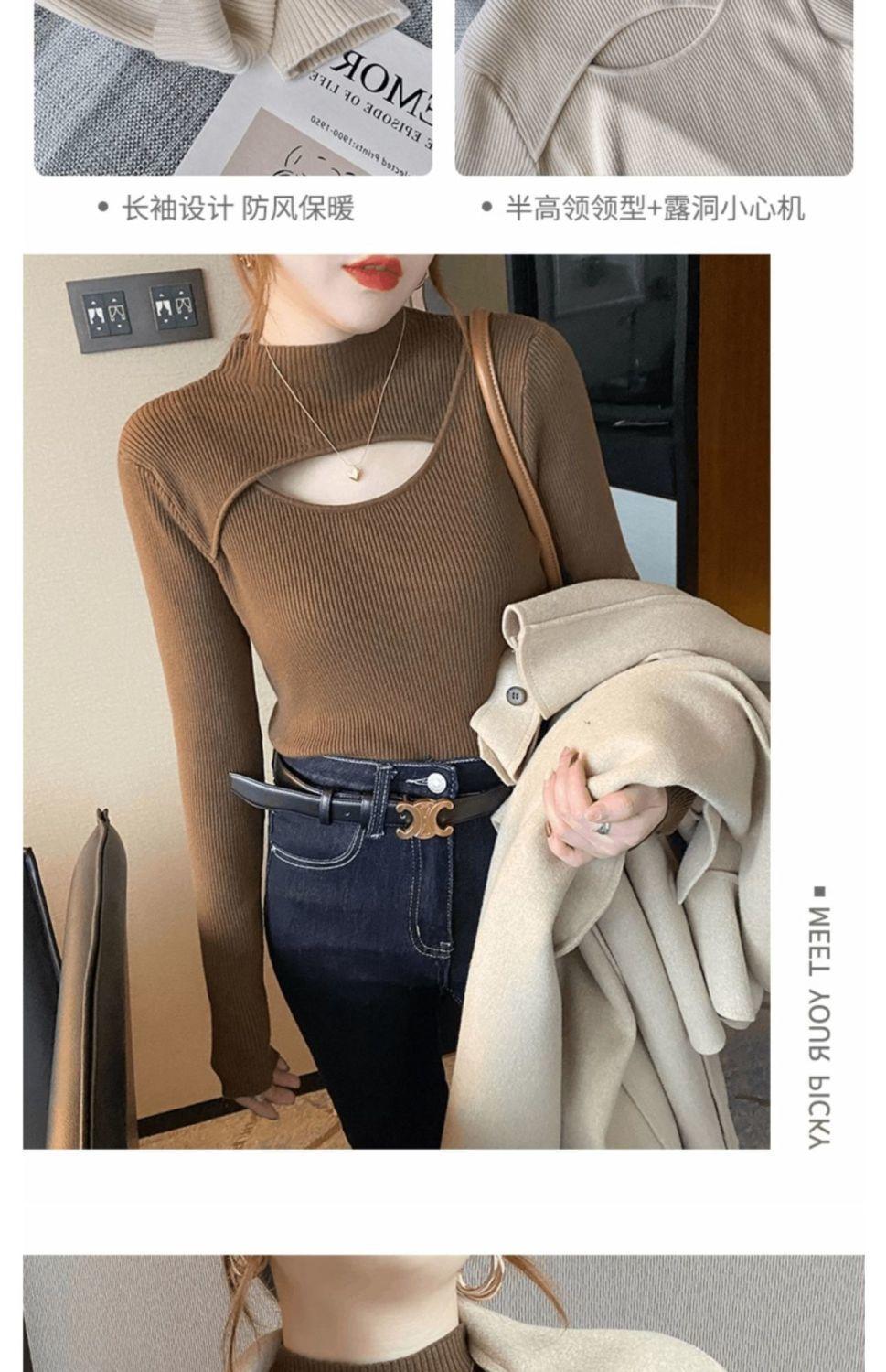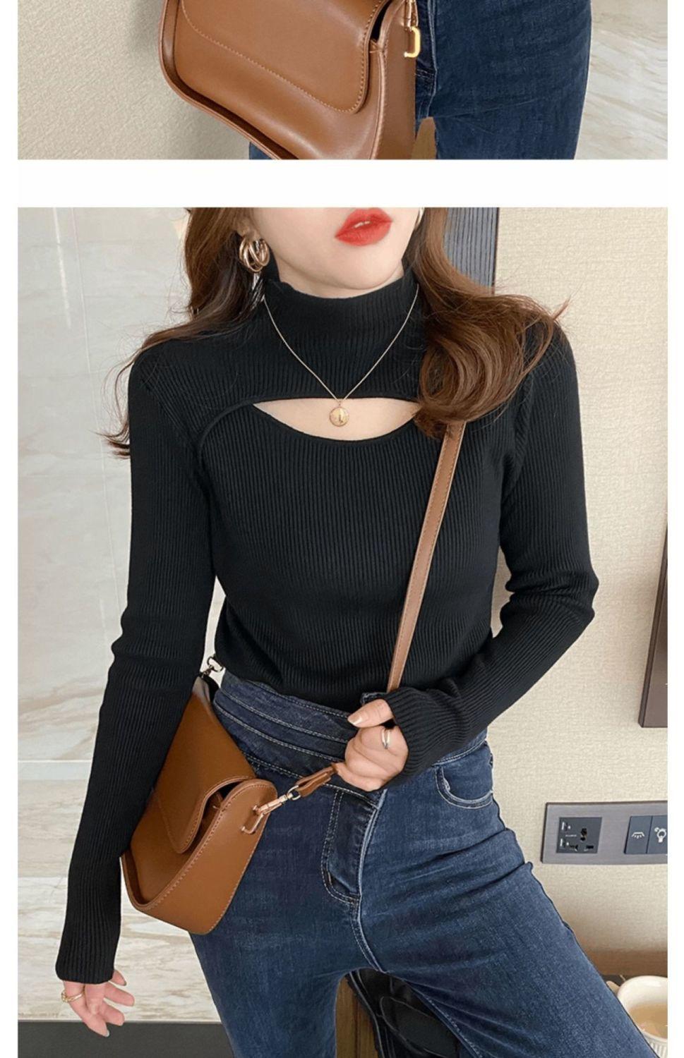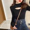 Camiseta Base de Punto de Cuello Medio Alto Hueco para Mujer Ropa Interior Otoño Sentido del Diseño Nicho Estilo Occidental Suéter Top