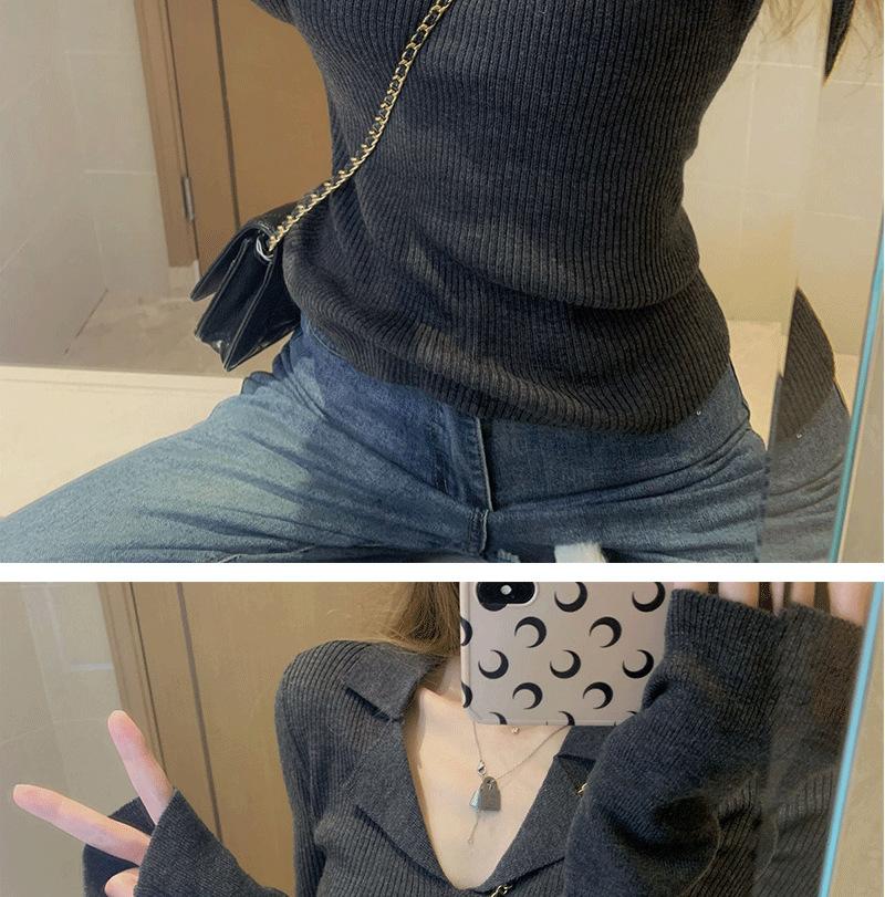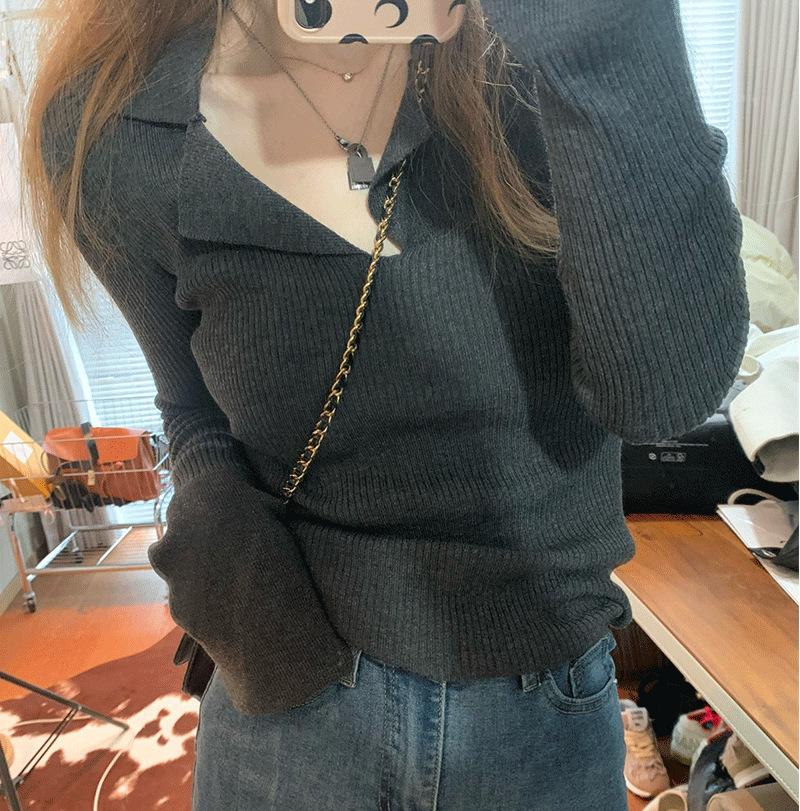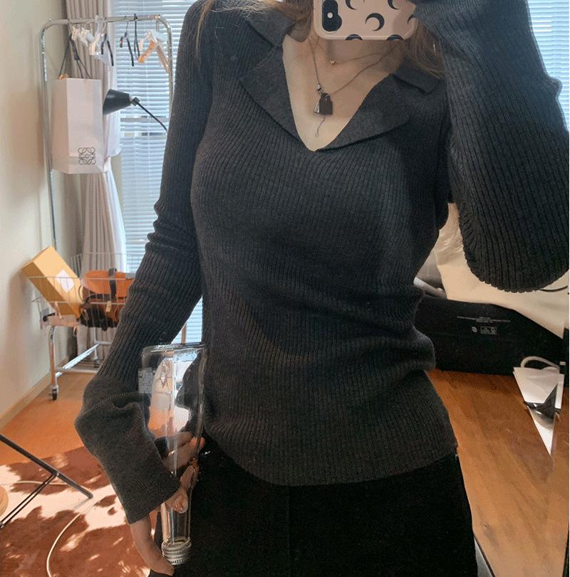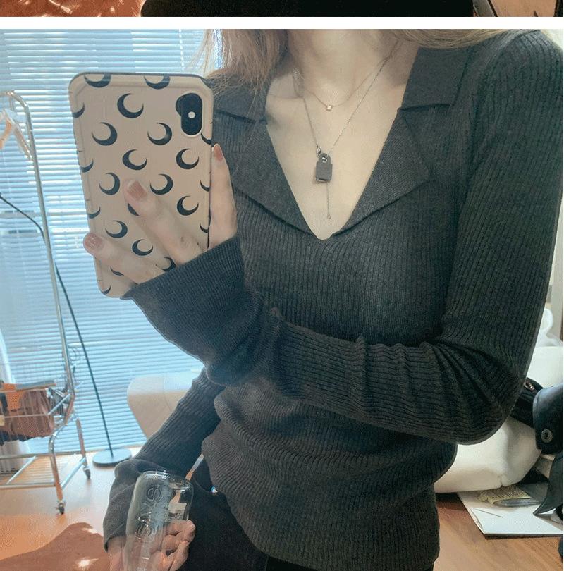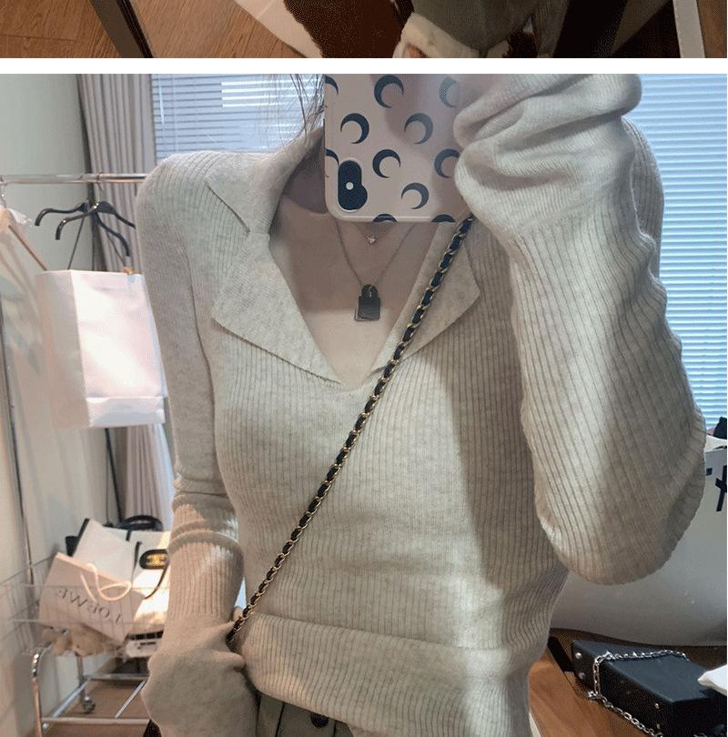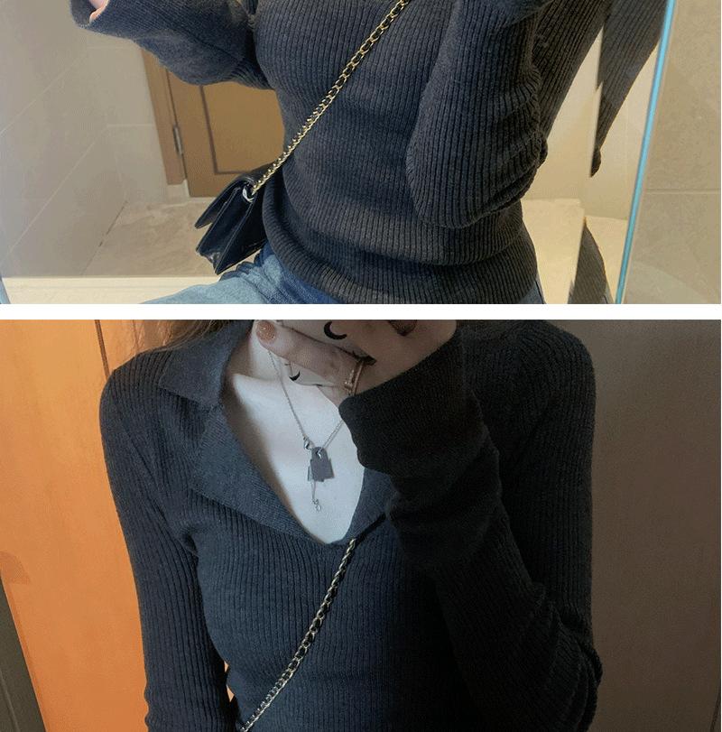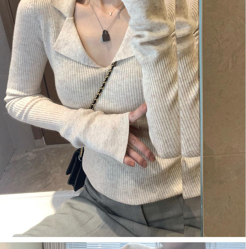Suéter Suave Ceroso Cuello Polo para Mujer Otoño e Invierno Diseño Grueso Sentido Puro Cuello en V Manga Larga Camisa Base Top Clavícula