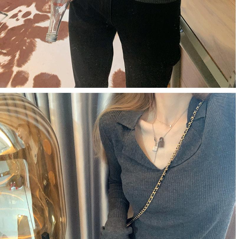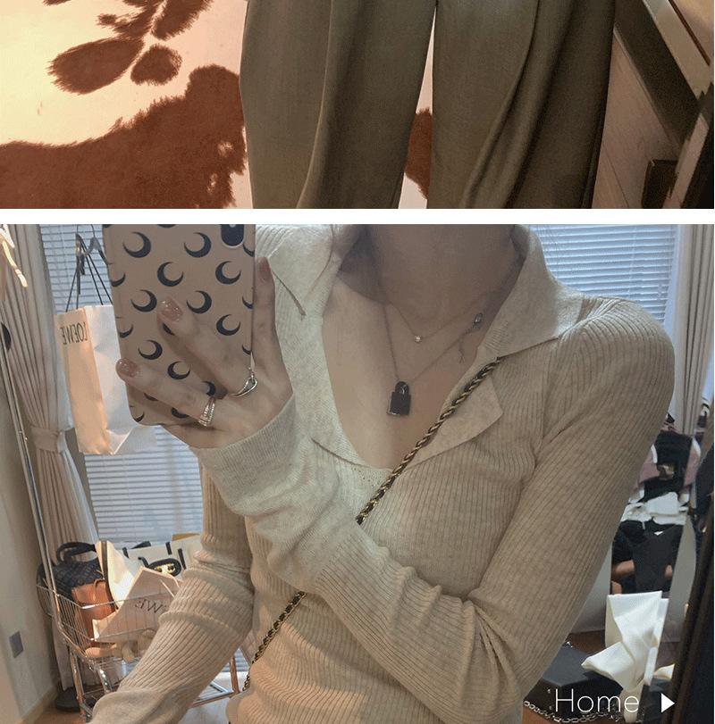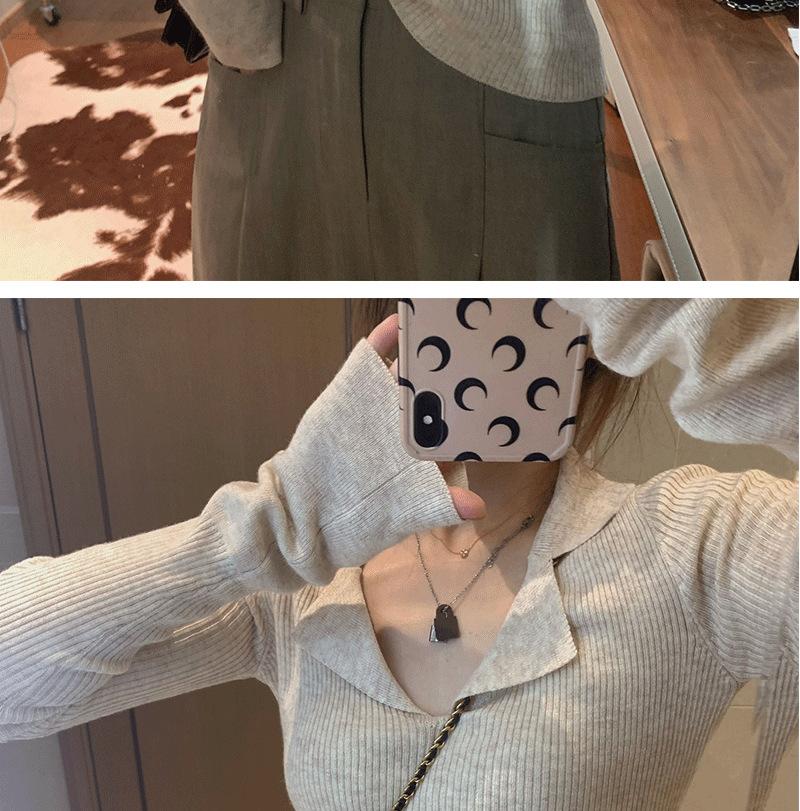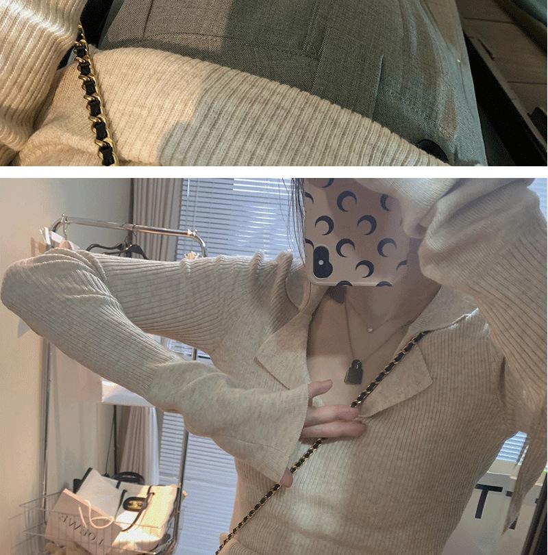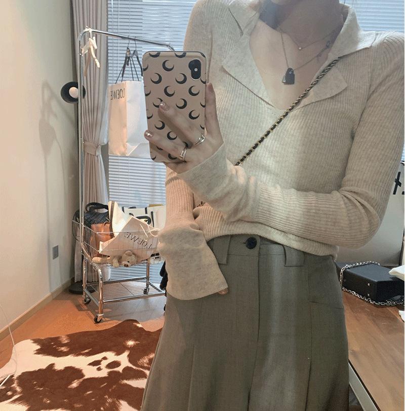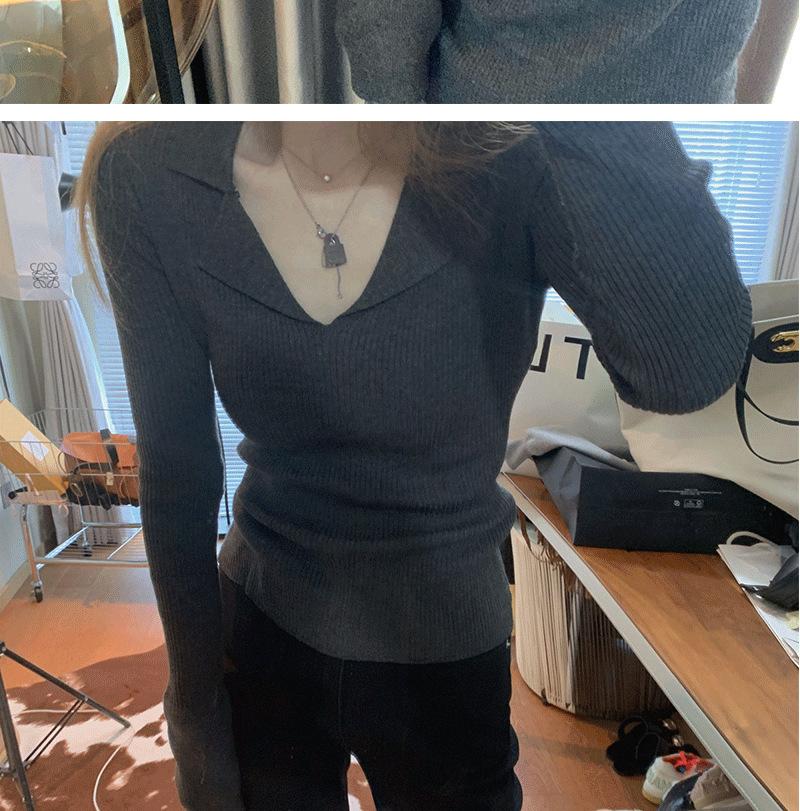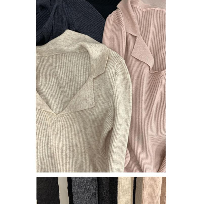 Suéter Suave Ceroso Cuello Polo para Mujer Otoño e Invierno Diseño Grueso Sentido Puro Cuello en V Manga Larga Camisa Base Top Clavícula