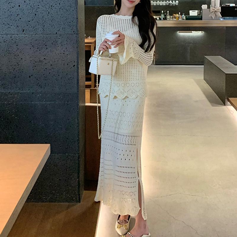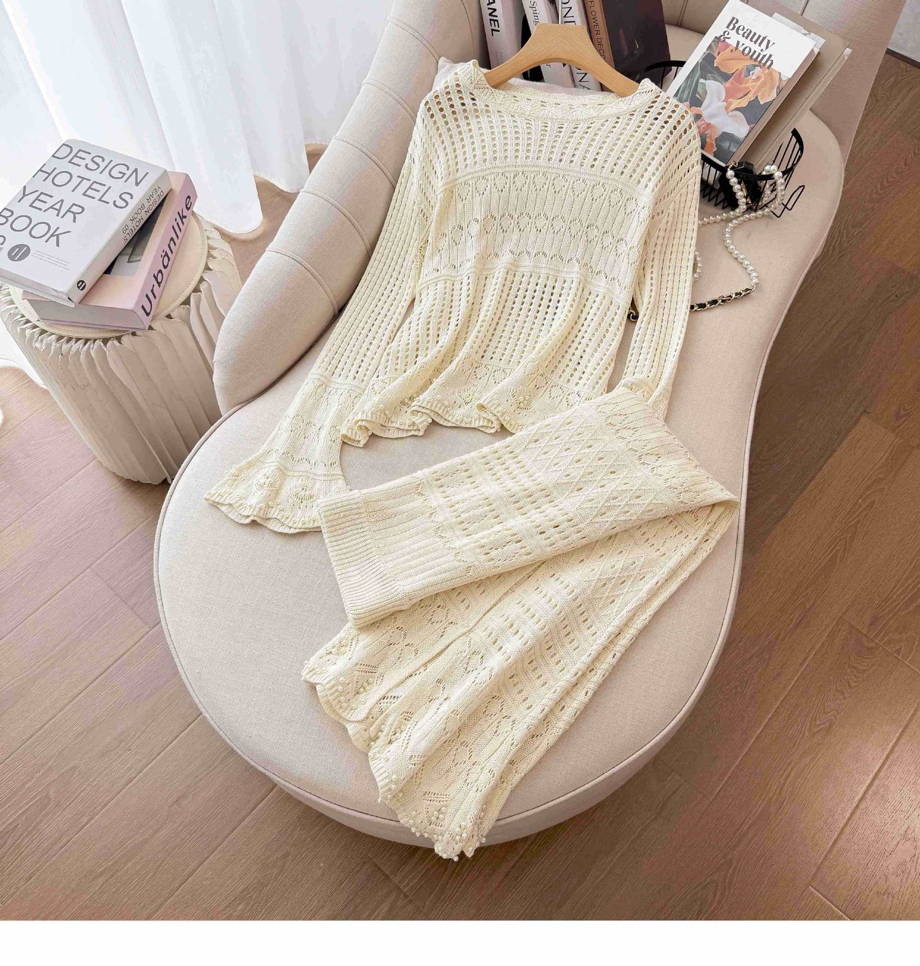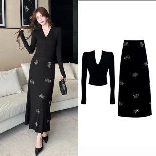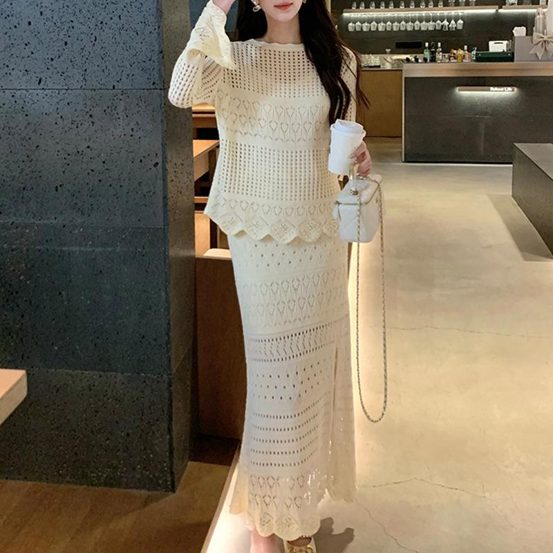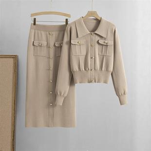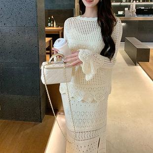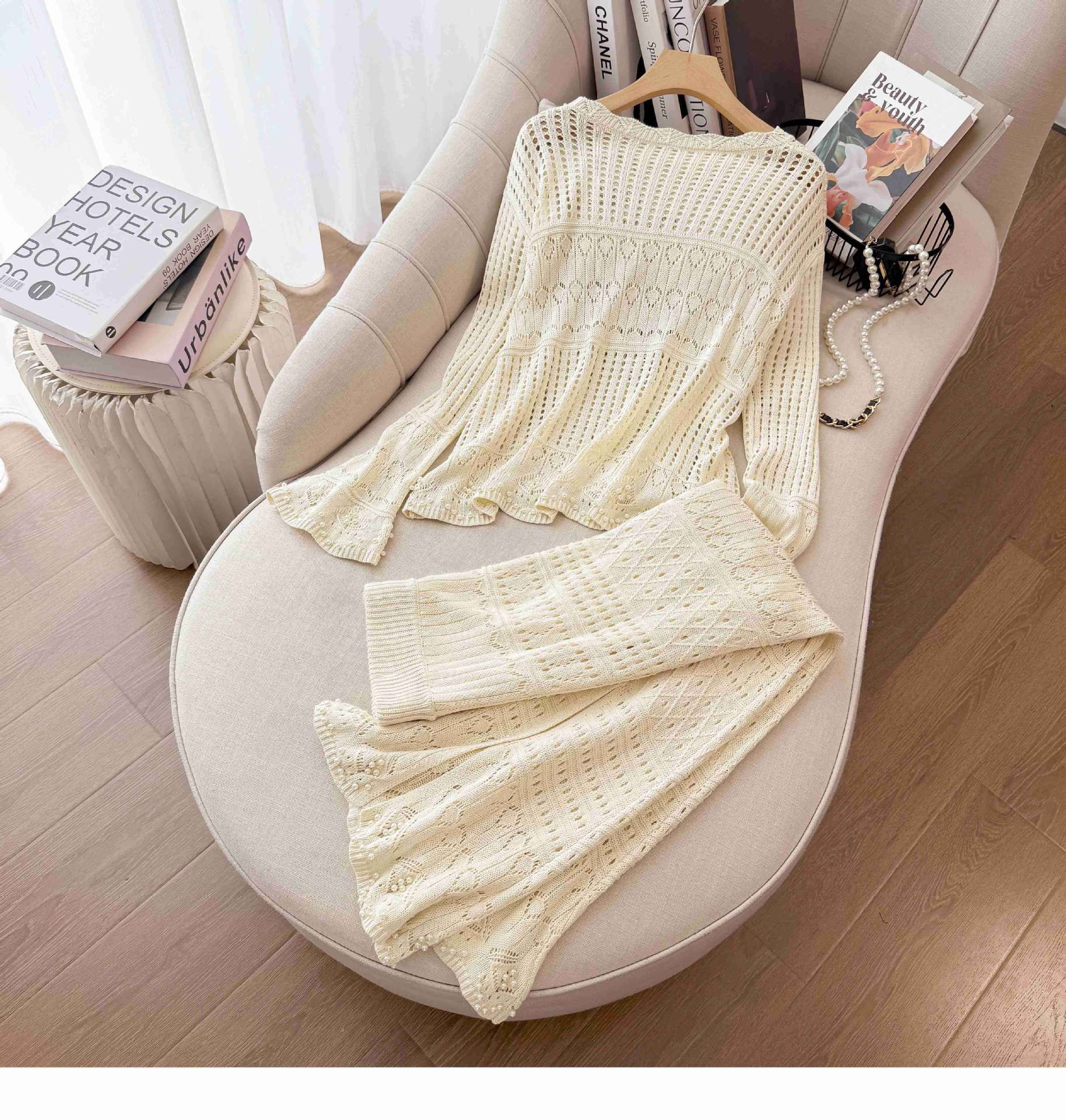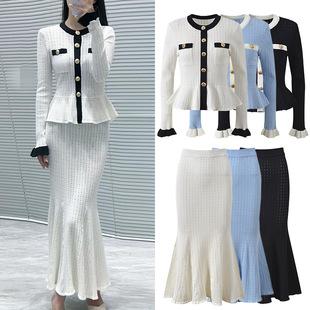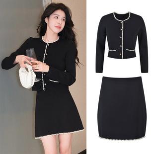 Conjunto de dos piezas de estilo fragante pequeño nuevo de principios de otoño 2025 con camisa de punto de manga larga con bocina hueca y media falda, conjunto de moda